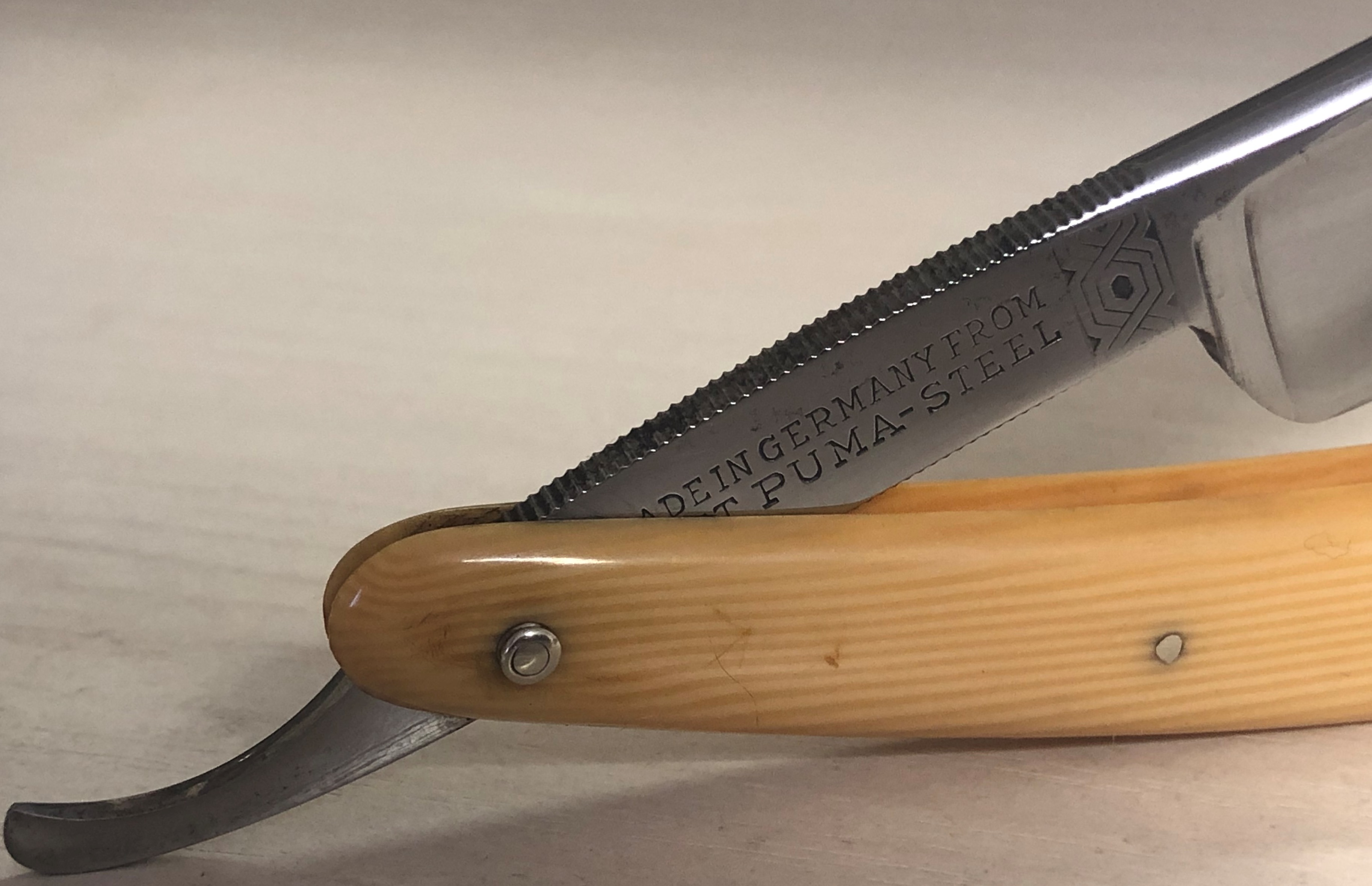 Данный "тренажер для новичка" прибыл в непользованном состоянии, не разбирался и не ремонтировался. Единственно что, немного полирнул полотно, дабы придать былой блеск металлу и все.Сталь чистая, без видимых и критичных дефектов. Идеальная геометрия клинка:кромочка равномерна по всей длине и еле заметна."Звонкая" сталь(есть мнение, что шведская) способна выдавать мягкое и чистое бритьё.Тяжёлая.По всем показателям идеально подойдет для новичка и не только, за совсем демократические средства.
