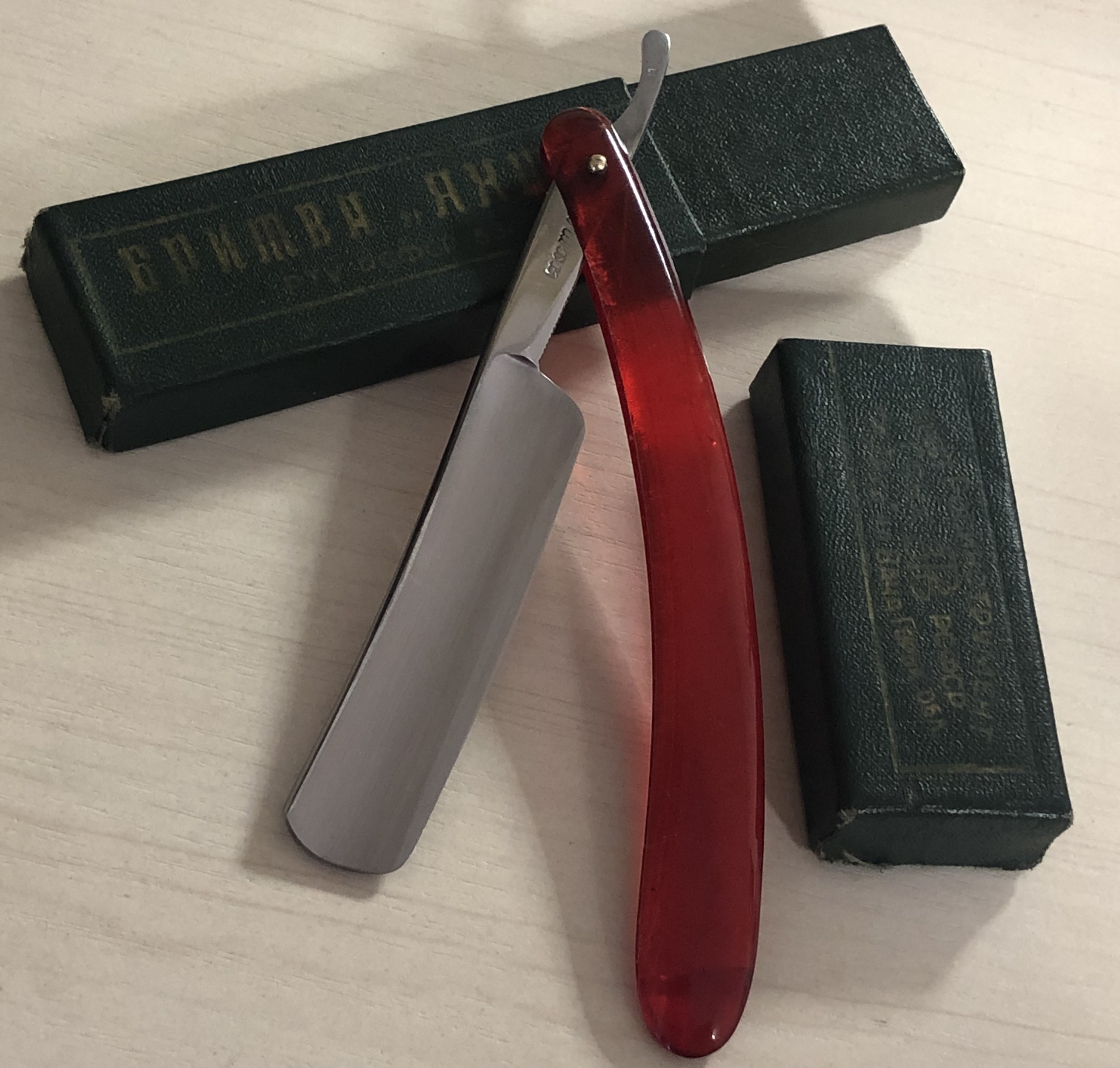 Бритву только оттер от остатков масла с консервации. Естественно, ничего не разбиралась и не ремонтировалось.Совершенно не тронута временем.Сталь не имеет никаких видимых дефектов.Нанесено покрытие от коррозии, а также можно увидеть чёткий переход от электро-химической, заводской заточки. Идеальная геометрия клинка. Бритву не точил пока.После продажи будет по желанию заточена.
