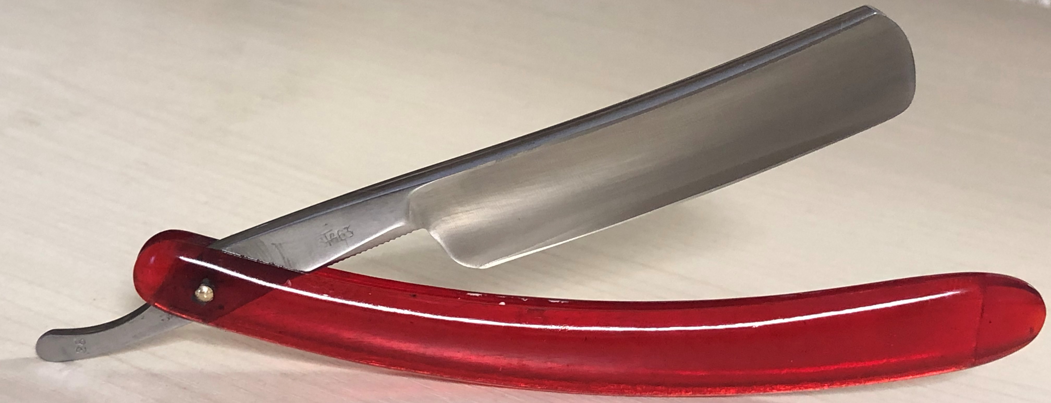 Бритва в очень хорошем состоянии.Малопользованная. Разобрал, немного почистил и отполировал полотно и снова собрал, заменив родной пин на немецкую втулку, с добавлением внутренних шайб. Идеальная геометрия клинка:кромочка равномерна по всей длине полотна.Заточена и готова к бритью. Отличный и недорогой вариант для новичка, не желающего тратить много денег на свою первую бритву.