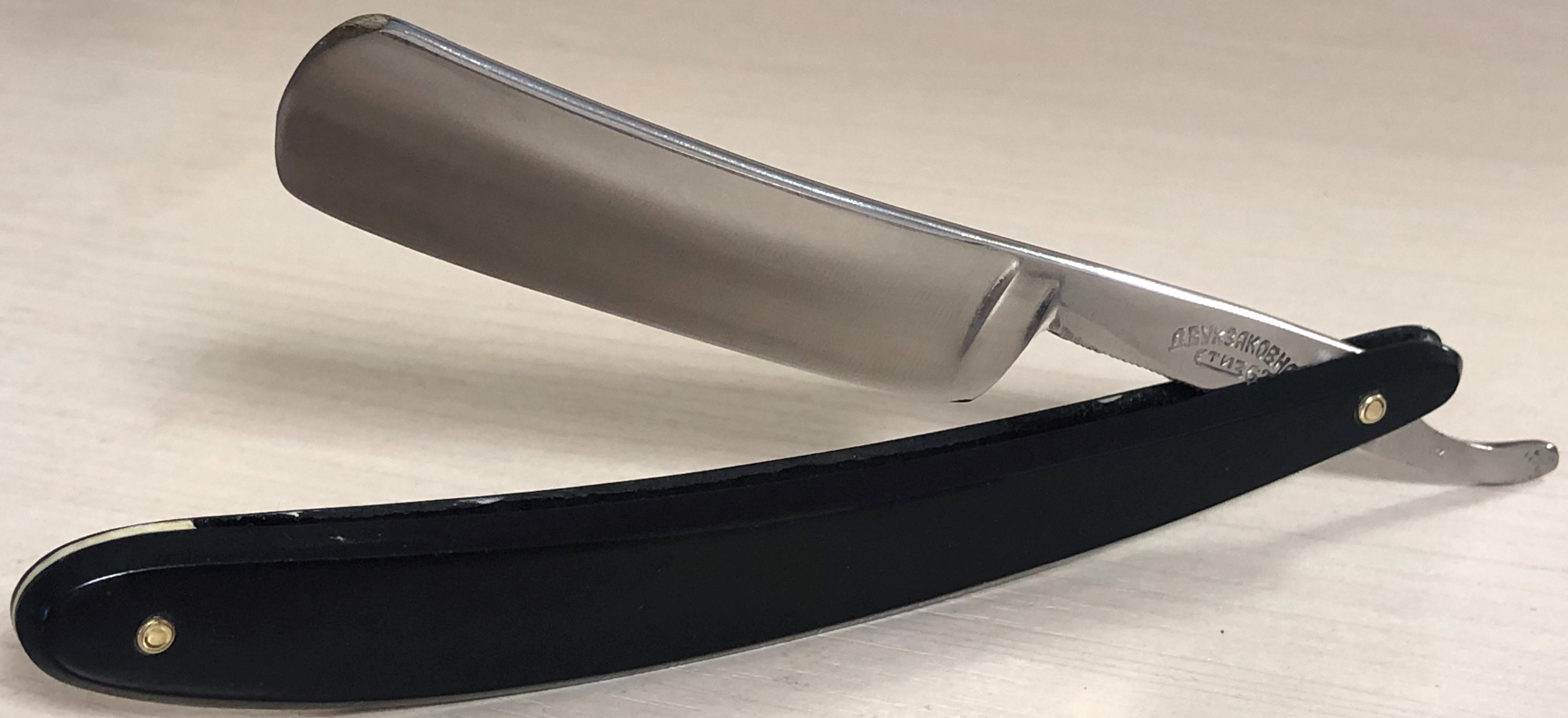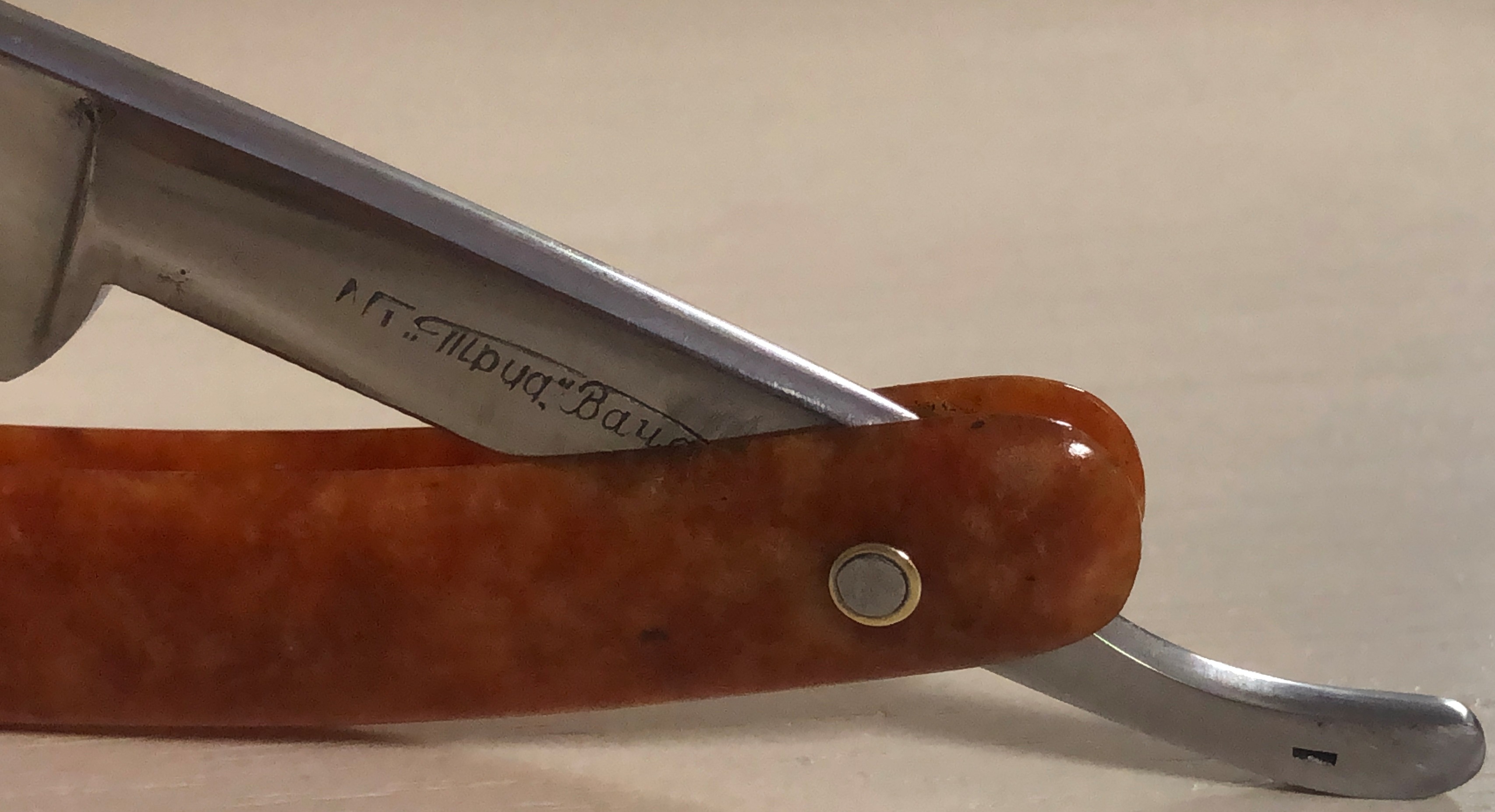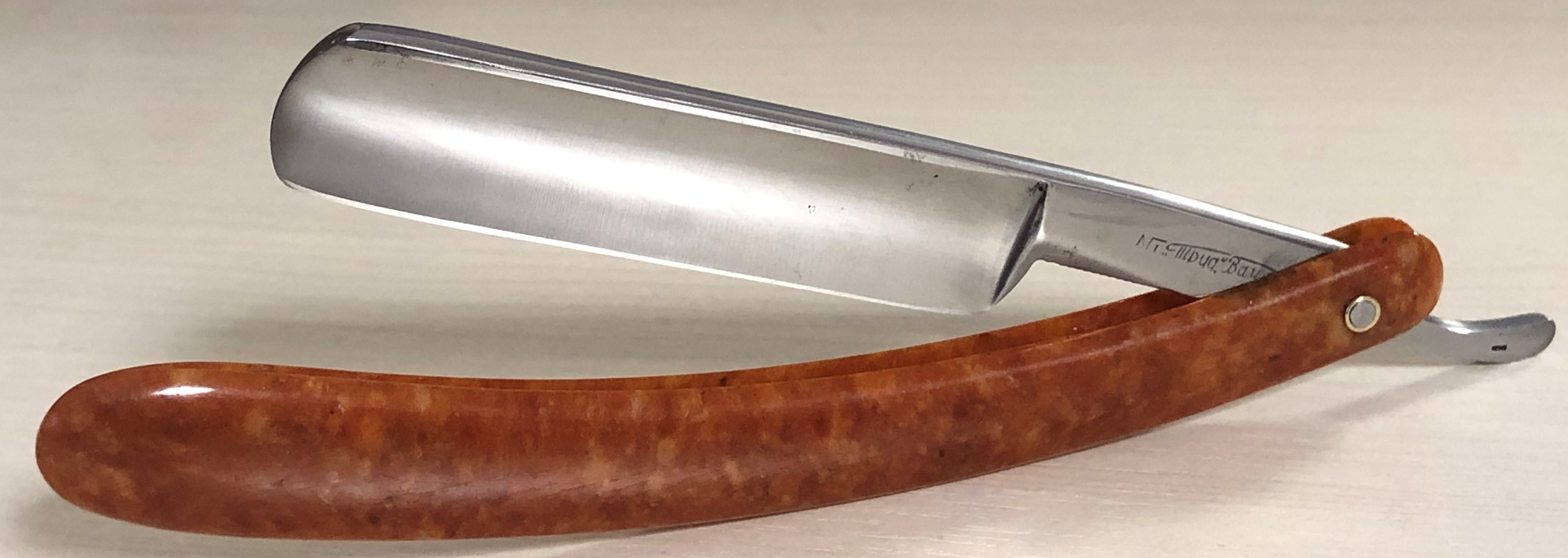 Малопользованная, либо вообще не была в деле.Бритву разобрал, немного почистил и отполировал клинок и снова собрал, сохранив оригинальный пин.