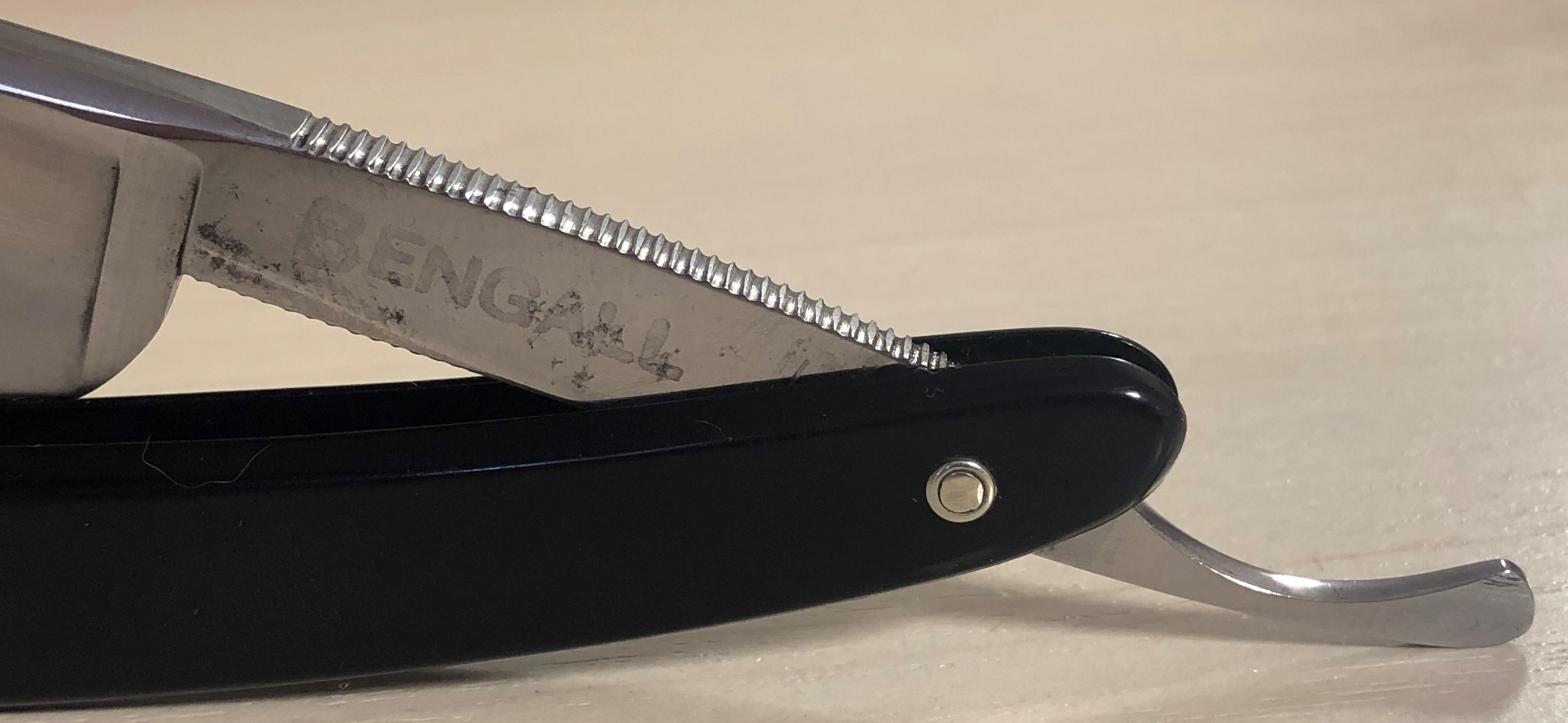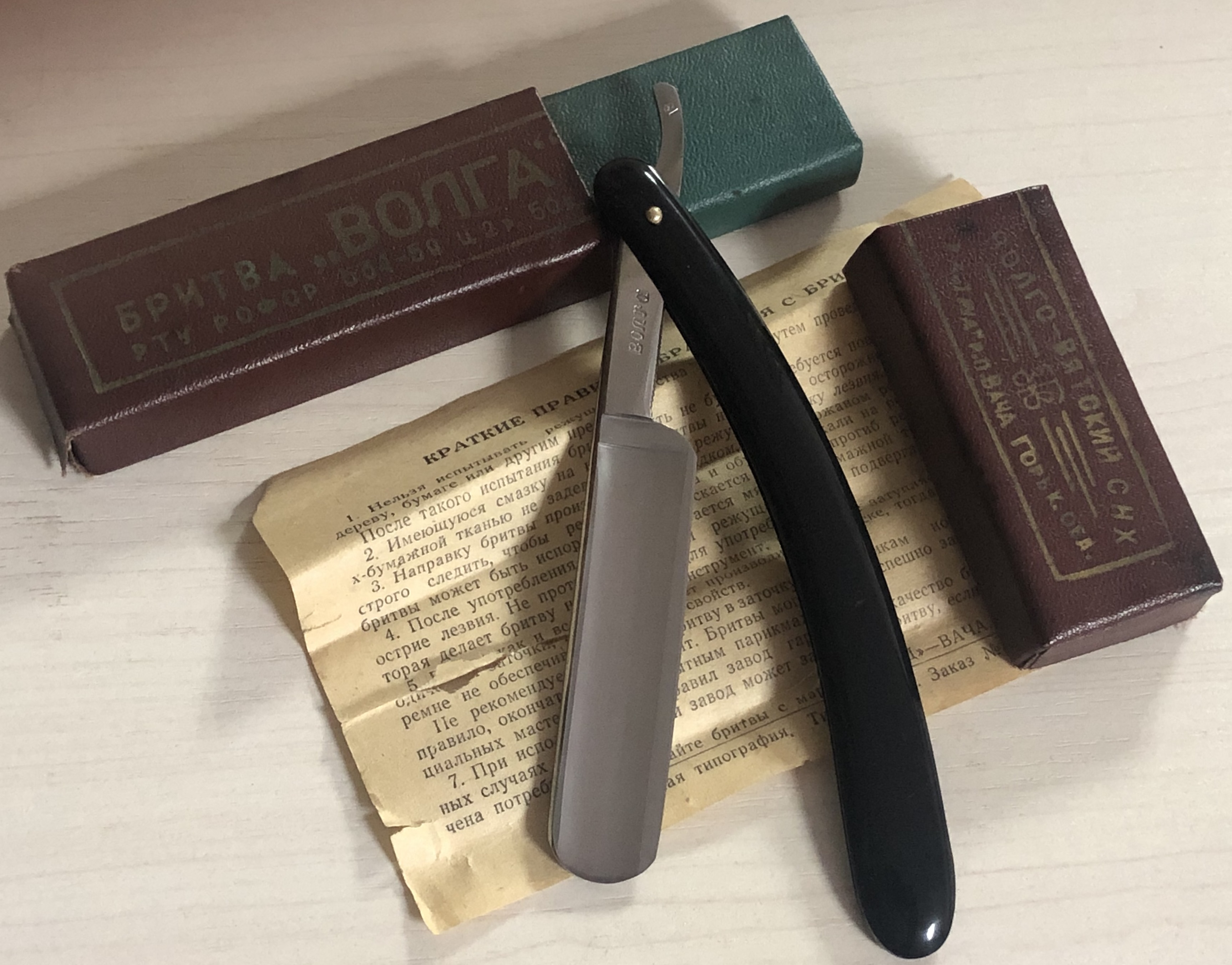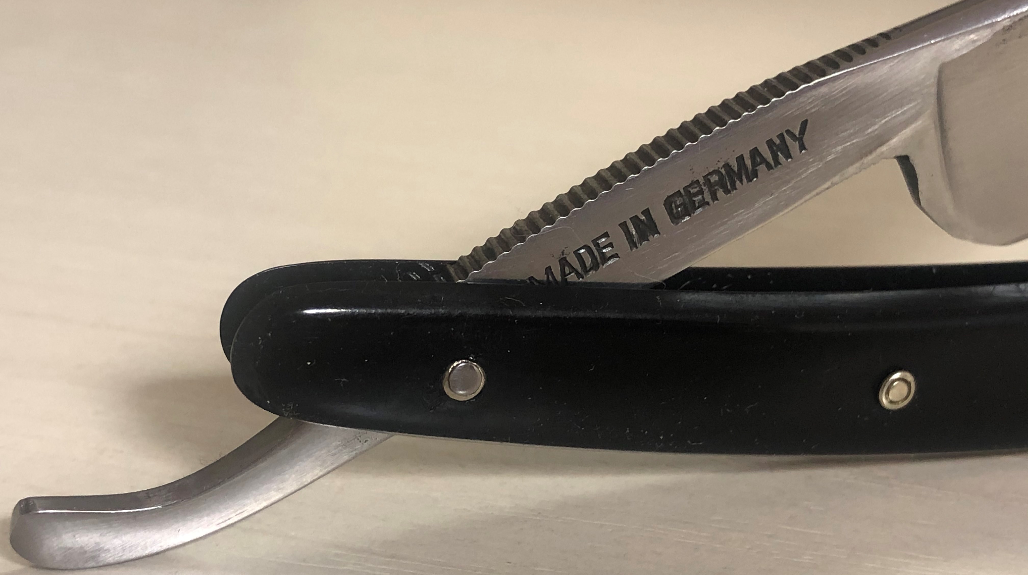 Малопользованная, либо вообще не была в деле.Бритву разобрал, немного почистил и отполировал клинок и снова собрал, сохранив оригинальный пин.