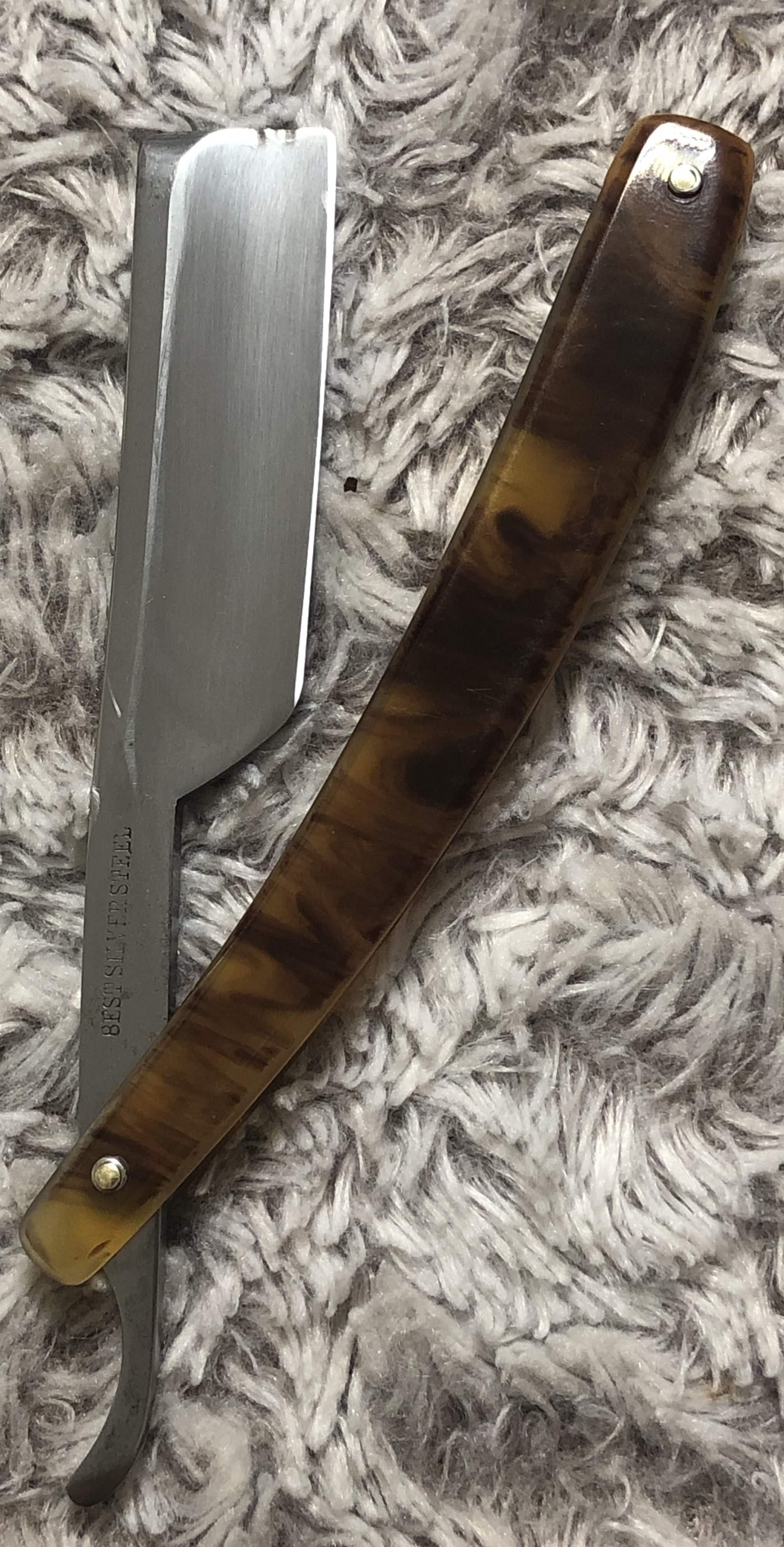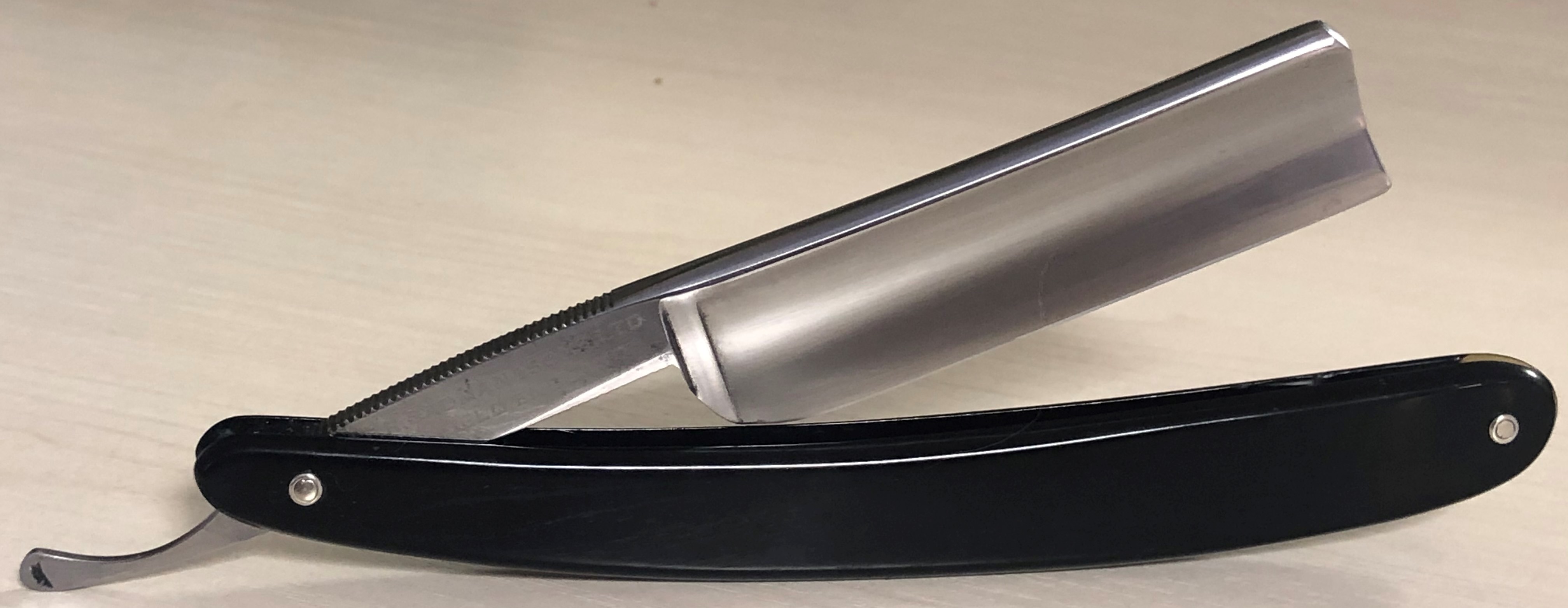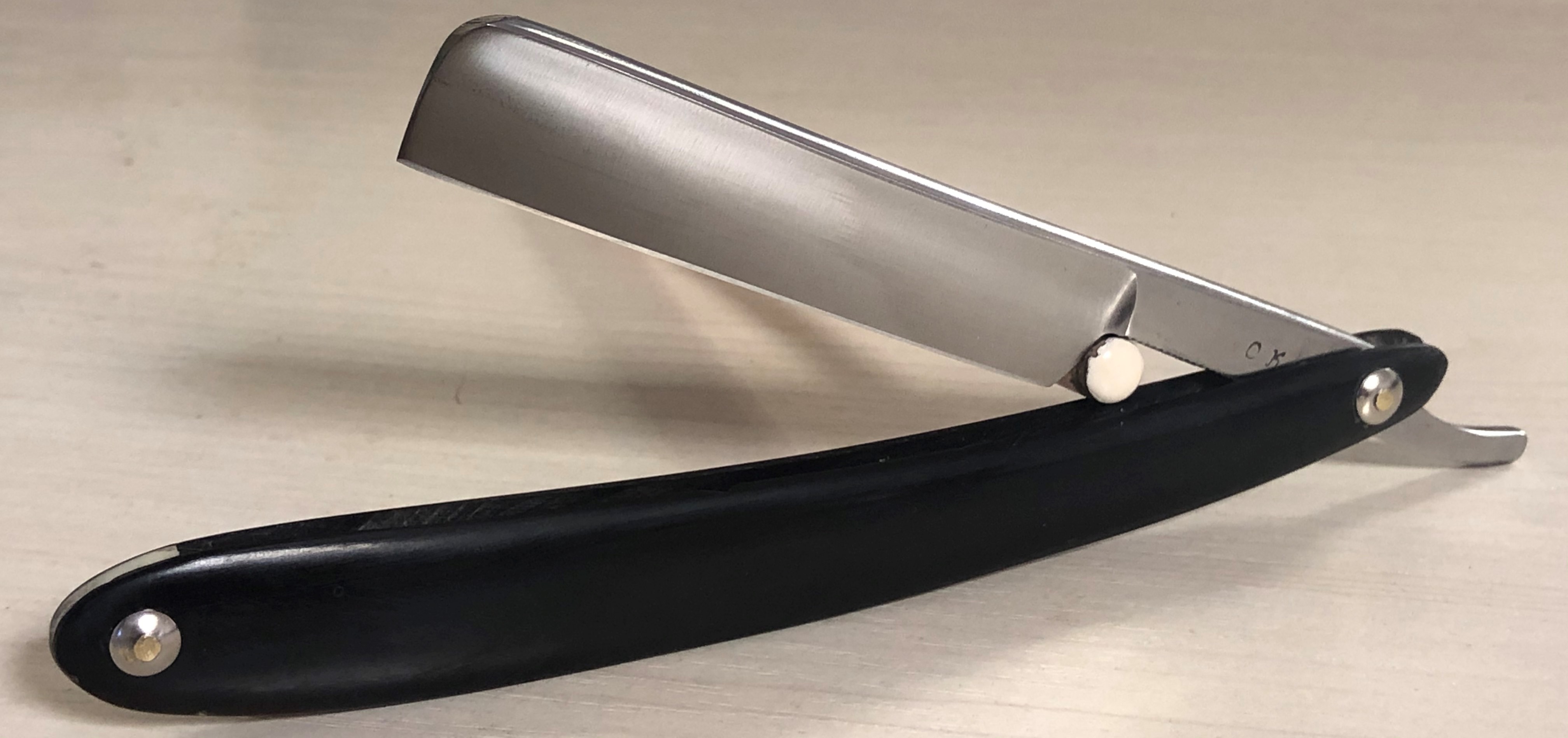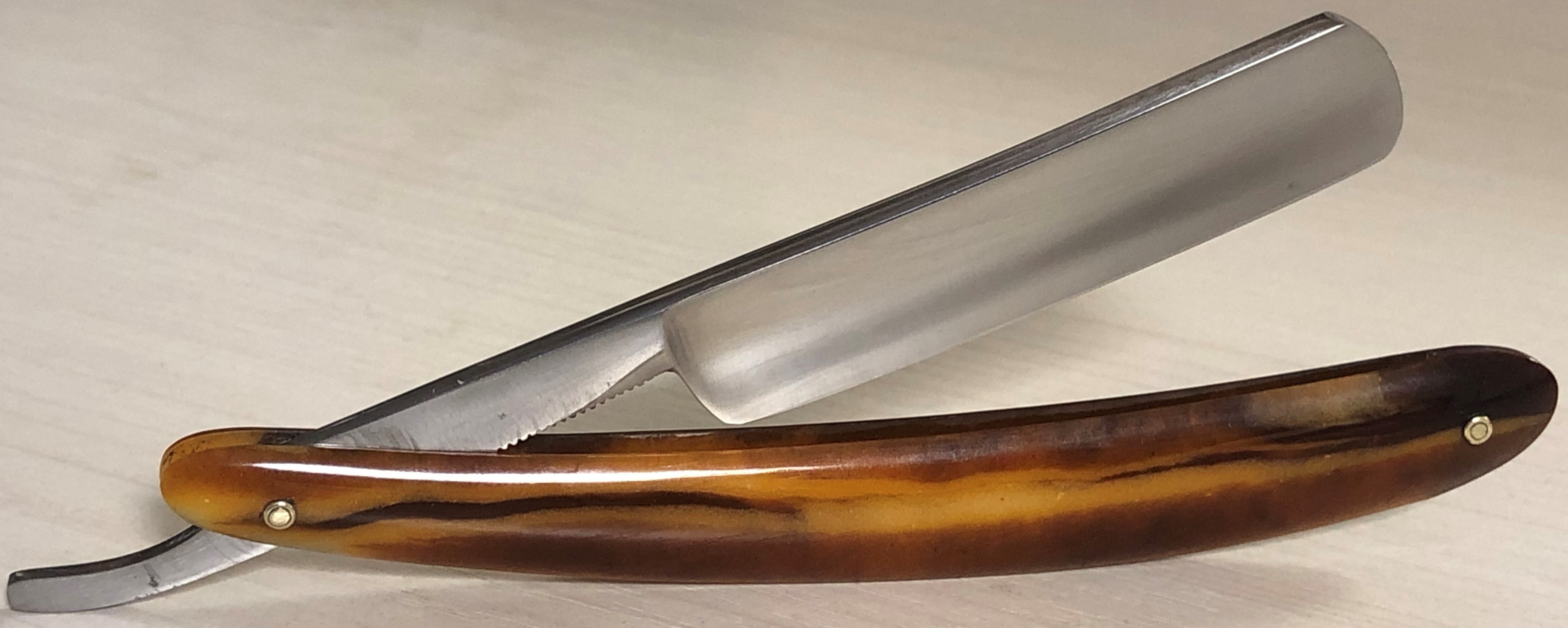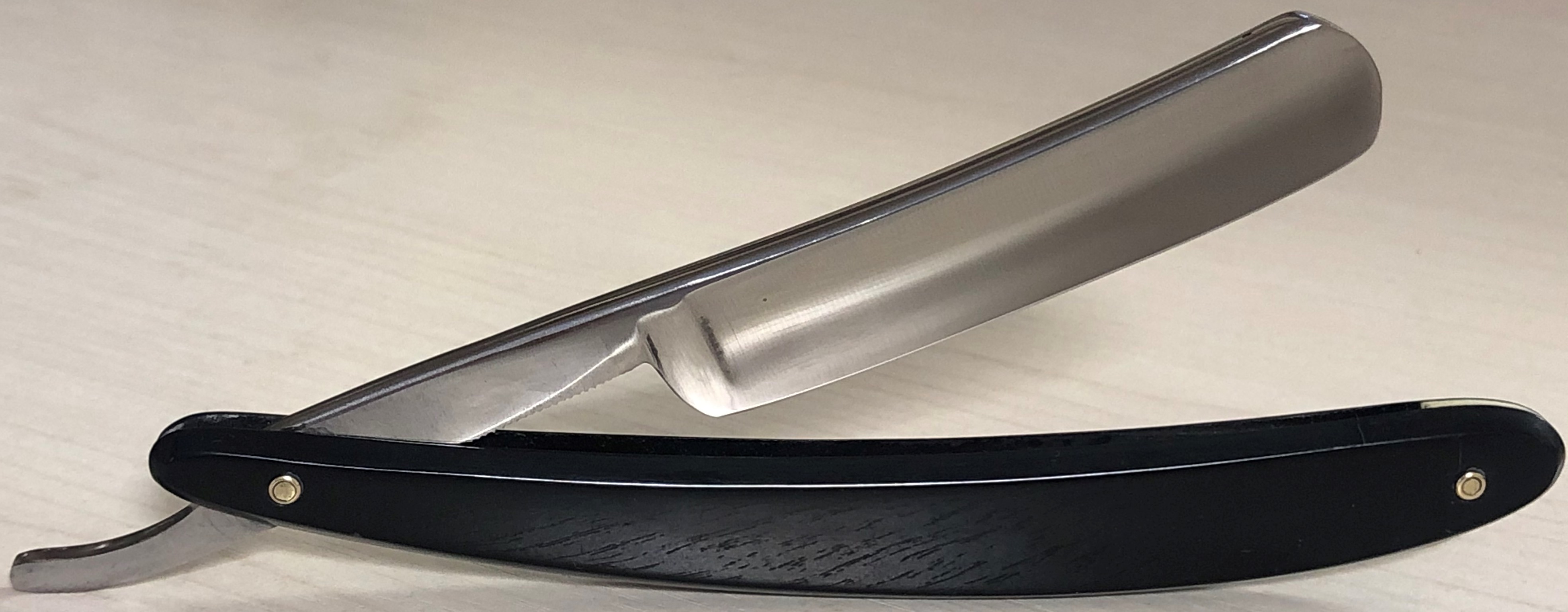 Клинок в очень хорошем состоянии.Немного исправил "обратную улыбку", почистил ,восстановил оригинальный гринд,в меру своих возможностей и отполировал.Касаемо оправы...Роговая, натуральная ручка ,древняя,от французского донора 19-го века.(Немного длинновата, конечно, но в любом случае лучше, чем какой то заводской пластик.  ) Так как на оправе имелись довольно большие отверстия под пины, то мною было принято решение поставить именно такие шайбы, возможно крупные,зато надёжные.Сталь чистая, без видимых дефектов. Идеальная геометрия клинка:кромочка равномерна по всей длине.Бритва получилась немного тяжелее, по сравнению с бритвой в оригинальном исполнении.В любом случае,бритва приятна во всех отношениях. Брить должна неплохо. Заточена и готова к бритью.