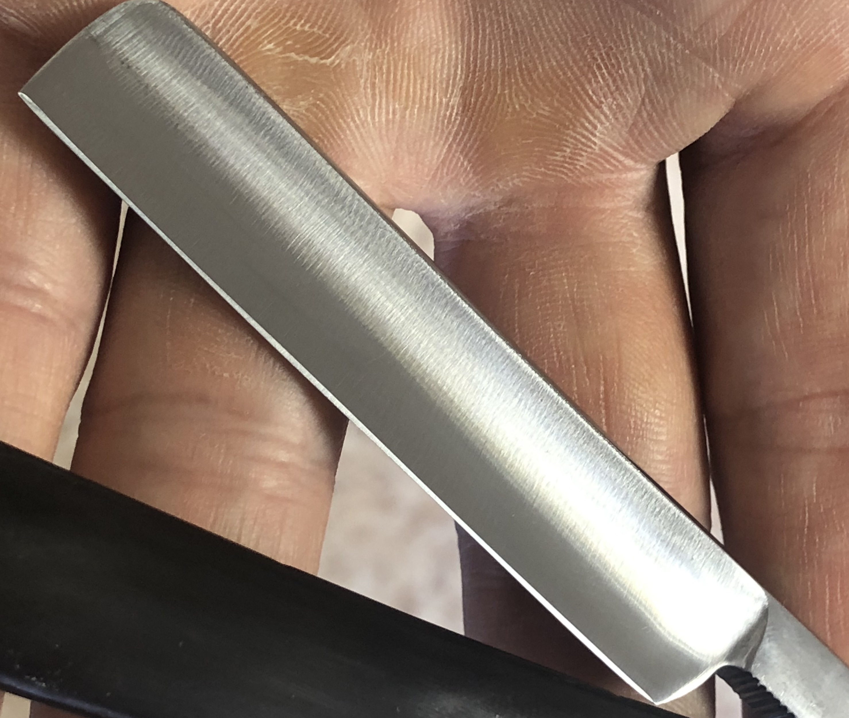 Идеальная геометрия клинка:кромочка равномерна по всей длине и еле заметна. Отличная "звонкая" сталь способна выдавать мягкое и чистое бритьё.Заточена и готова к бритью.