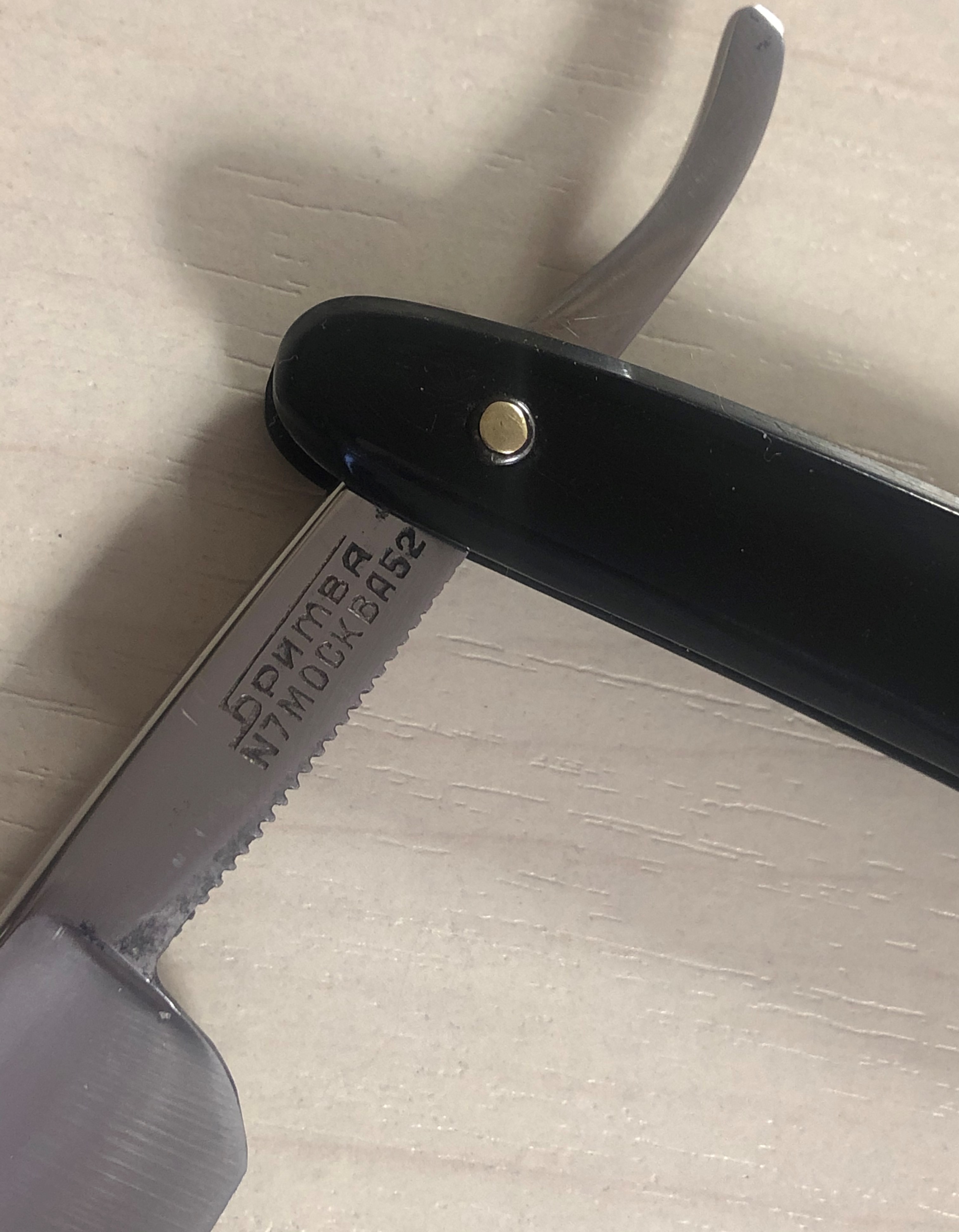 Ширина полотна-20 мм Толщина обушка-6.5 мм Углеродистая сталь. Форма лезвия-1/2 клин Примерно 50-60-е годы . Весьма приятная бритва во всех отношениях. Разобрал,почистил, отполировал и снова собрал, заменив пины на немецкие втулки.Снова не стал идти легким путем и шлифовал клинок на камнях, вручную.Долго, муторно, но получаешь удовольствие от процесса, заодно всегда можно проконтролировать то, что делаешь , чтобы не убрать лишнего и не перегреть с дуру металл..Ясное дело, что задачи не стояло получить идеальное зеркало, как это можно увидеть на множестве новодельных бритв:заплывшее от полироли зеркало. Тут скорее умеренный, легкий продольный сатин, хотя под другим углом ,если смотреть, то отражение очень хорошее.Приятный голубоватый оттенок от ручной шлифовки и полировки. Короче, достаточно красивая, практичная, удобная и недорогая бритва. Сталь не имеет визуальных дефектов, геометрия на уровне.Не пропустите рабочий инструмент за вменяемые деньги. Заточена и готова к бритью. Цена-6500 р с доставкой.ПРОДАН Внимание! Важная информация! Spoiler Show