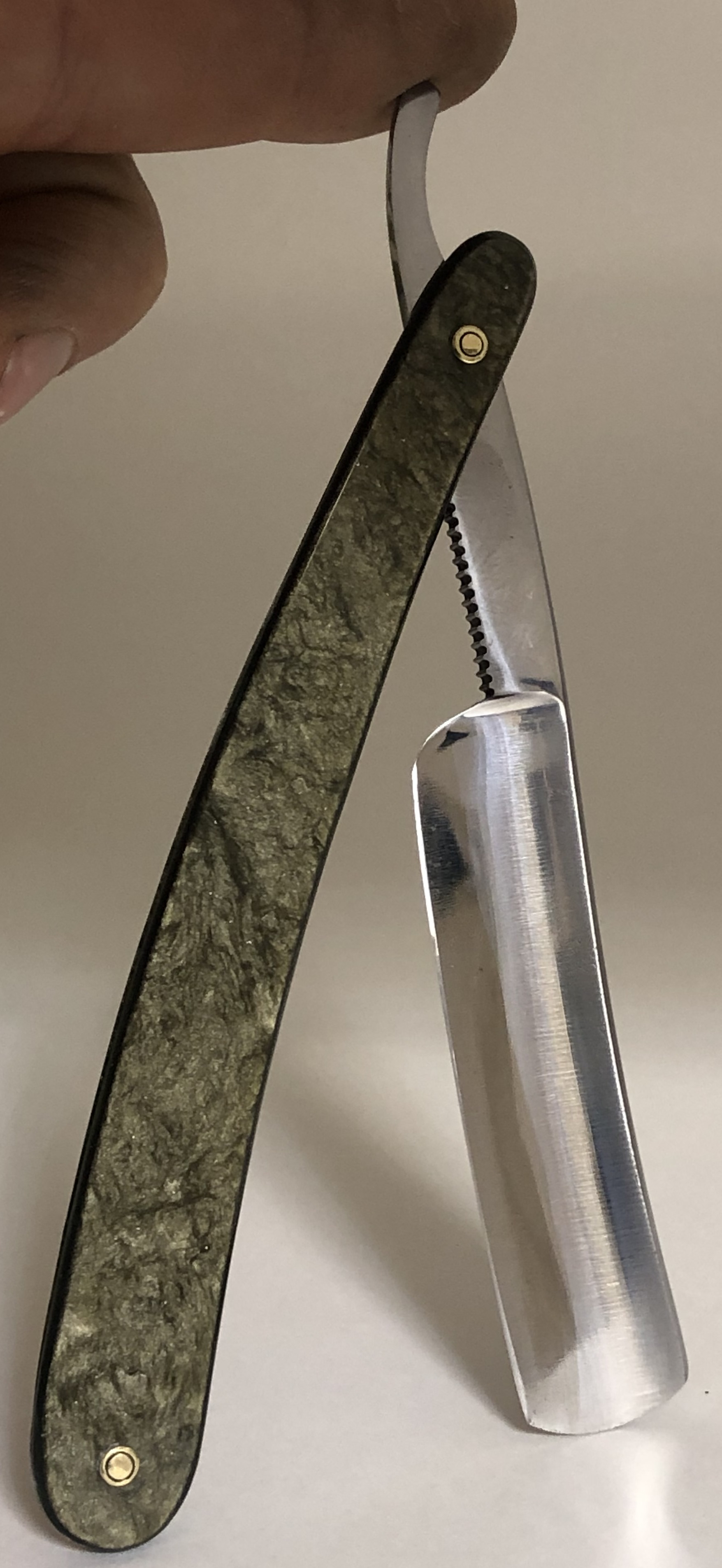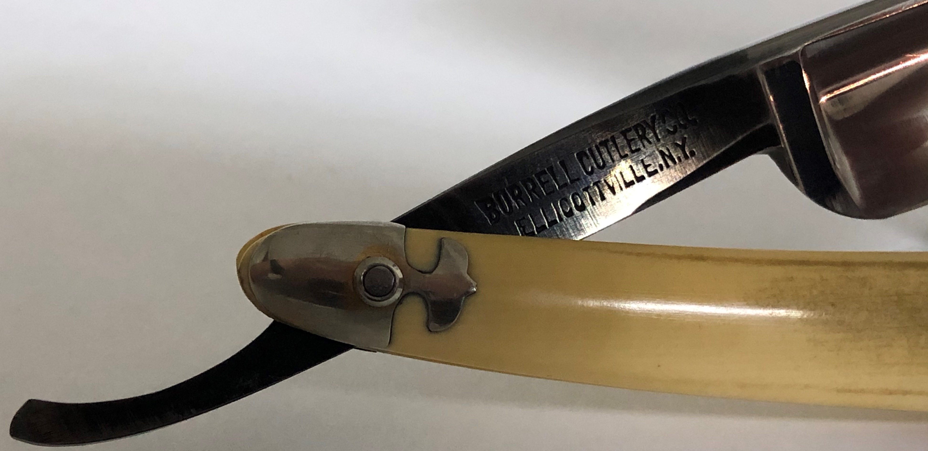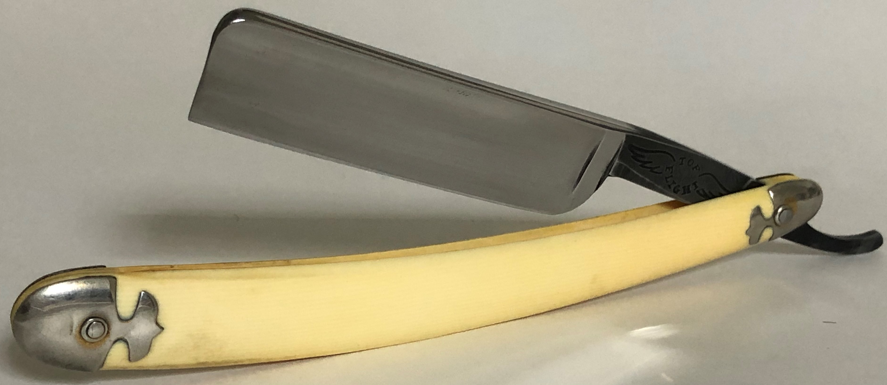 BURRELL CUTLERY C0.INC.ELLICOTTVILLE,N.Y. TOP FLIGHT-"Высший пилотаж" Ширина полотна-18 мм Толщина обушка-4.3 мм Полная вогнутость. Углеродистая сталь. Время производства:1940-1950гг. Спасибо Антону за описание истории этого бренда: viewtopic.php?f=31&t=2311&p=180836&hili ... ll#p180836 Бритва в прекрасном состоянии,без признаков пользования. (воронение эрля практически на месте)Немного освежил клинок от патины.Перебрал осевой пин и добавил внутренние шайбы.Эффектная оправа,с металлическими,ажурными накладками. Также,не стал убирать красивую потертость плашки, так бы "под старину".Сталь и кромка чистые, от всякого рода дефектов.В общем и целом неплохая бритва, во всех отношениях.Заточена и готова к броитью. Цена-6500 р с доставкойПРОДАН Внимание! Важная информация! Spoiler Show