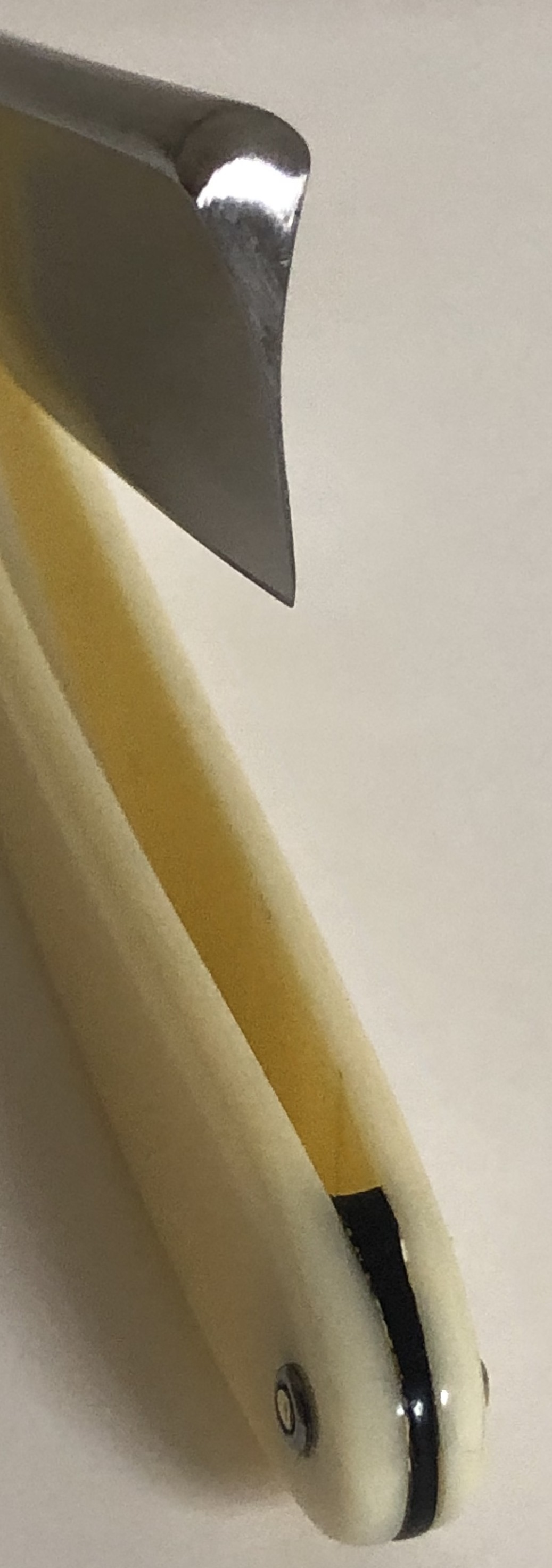 Продаётся от wrenАнглийская бритва из набора "7 дней",с несохранившейся надписью на эрле.Только слово SHEFFIELD можно прочитать.И по всей видимости сам штамп не был стерт, а так плохо пробит, так как я видел 4 бритвы из этого набота и всех качество штампа было одинаковое. (Вторую бритву смогу предложить немного позже). Ширина полотна-20 мм Толщина обушка-5 мм Полная вогнутость. Углеродистая сталь. По косвенным признакам бритва , по всей видимости конца 19-го, начала 20-го века. Клинок был почищен,без применения тяжёлой техники, способной снять много"мяса" и радикально изменить форму лезвия. Ромбовидный обушок.Бритва хоть и немного пользованная, но совершенно не уточена и находится в очень хорошем состоянии.Сталь чистая,без видимых дефектов.Мощная, крупная пластиковая оправа от английского донора начала 20-го столетия.Пины-немецкие двух-цветные втулки, с добавлением внутренних шайб.По своей форме лезвия и размеру бритва может представлять идеальный и недорогой вариант прежде всего для новичка. После продажи будет заточена и подготовлена к бритью. По желанию будет лично мной протестирована. В общем и целом очень приятная во всех отношениях бритва. Цена-5500 р с заточкой и доставкой. [/b][/QUOTE] ПРОДАН Внимание! Важная информация! Spoiler Show