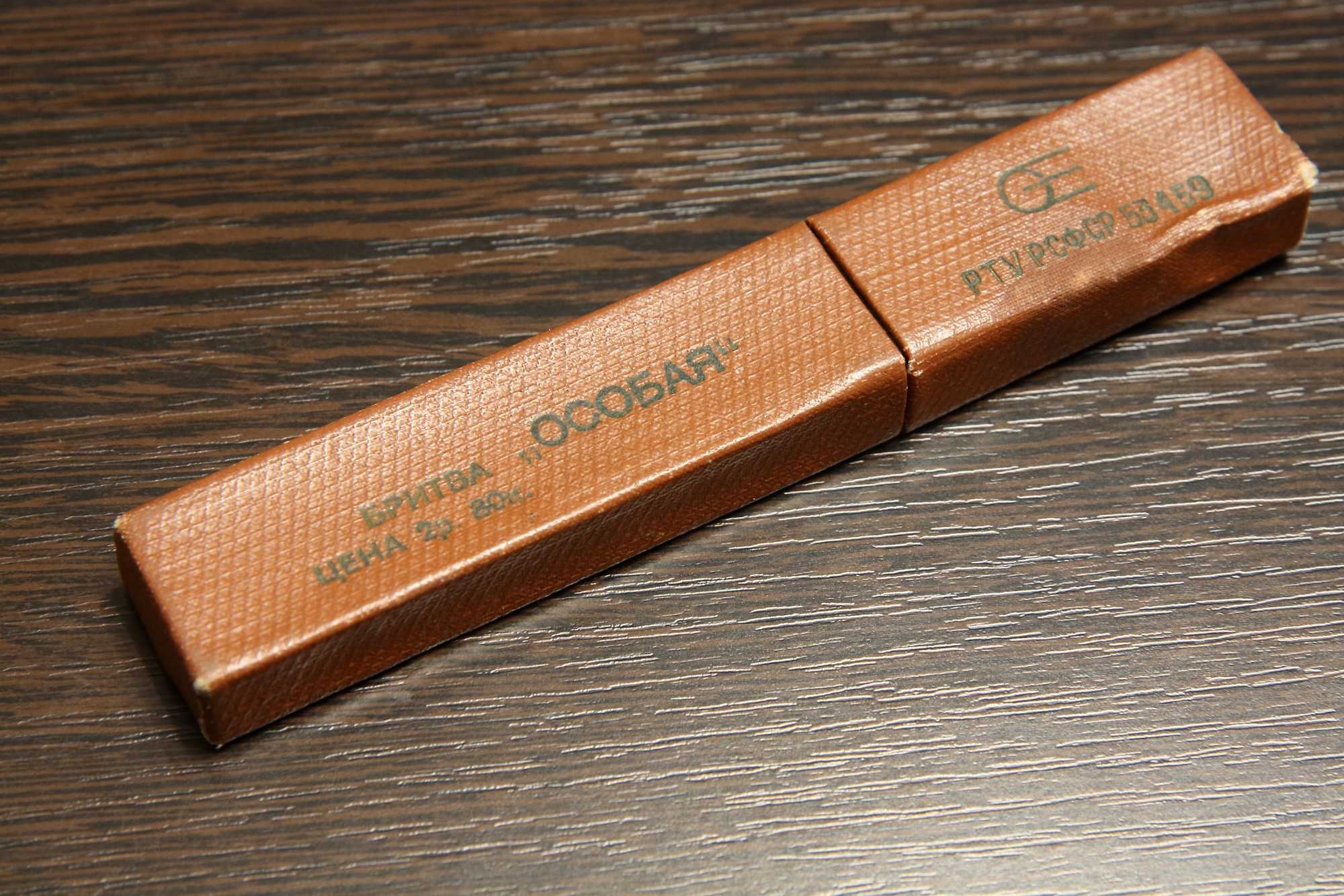 Опасная бритва Особая, завод СТИЗ, 1966 год. Ширина полотна 17.2 мм, все родное в т. ч. футляр. Ко мне попала с заводской заточкой и следами на полотне, прошелся вручную наждачками, полиролью и подготовил к бритью. Остались некоторые остаточные следы, кромка чистая. Особая очень ценилась среди советских парикмахеров за отличные рабочие качества. Бреет приятно и не агрессивно, звонкая сталь, хорошая геометрия. Цена - руб. К бритве рекомендую приобрести ремень для правки опасных бритв моего изготовления из итальянской кожи (подробнее на странице 4, объявления 56-58 и странице 9, объявления 127). Spoiler Show
