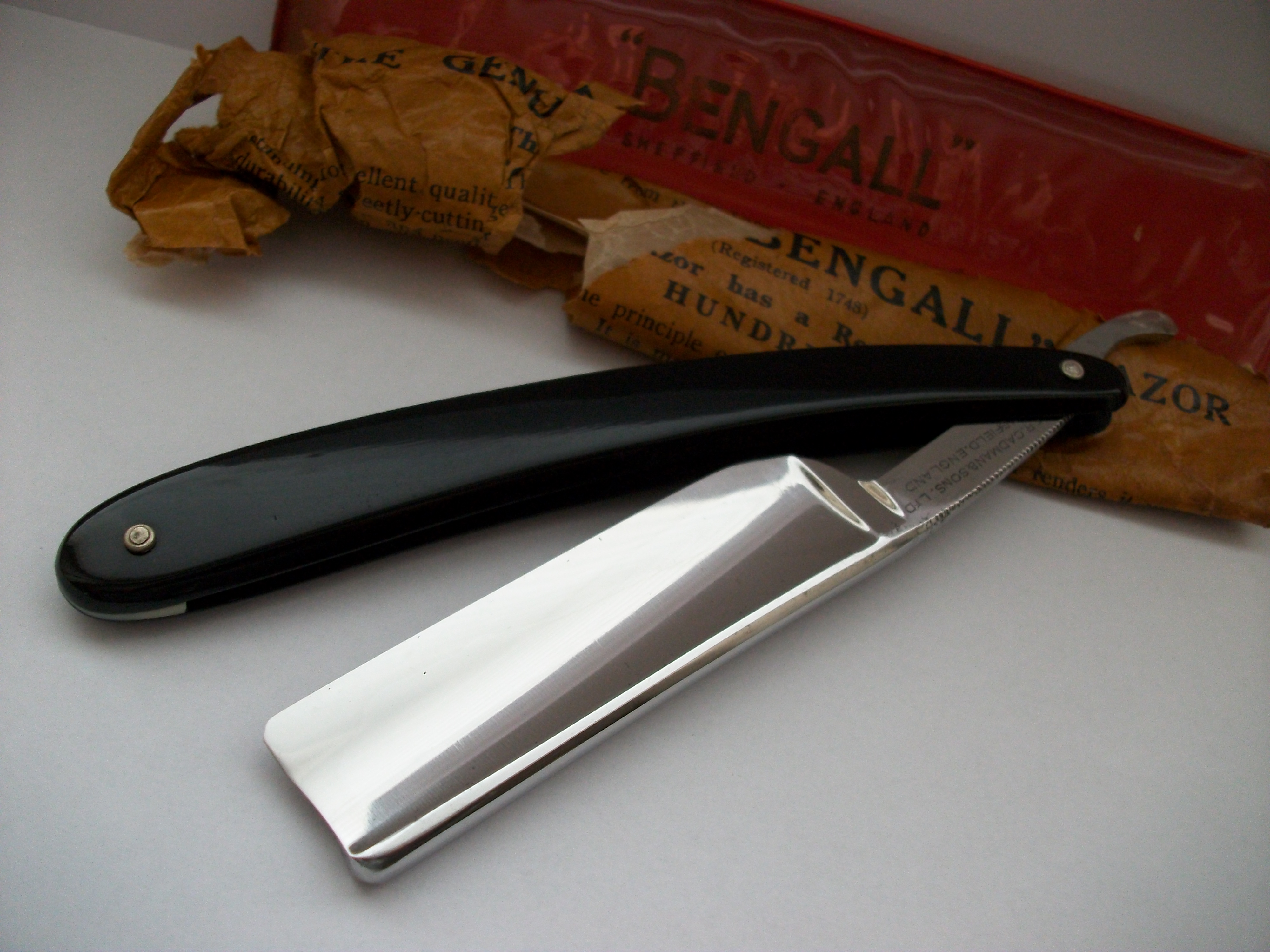 Bengall от Cadman и сыновей Шеффилд. Углеродистая сталь, ширина полотна 21мм, длина режущей кромки примерно 72мм, вогнутость полная, ручка - пластик. Бритва не была в пользовании, но годы взяли свое, бритву пришлось почистить от точечной ржи (не разбиралась). Небольшие царапки и следы времени присутствуют. Отличная сталь (мое мнение) и комфортное бритье по отзывам покупателей. Заточена и готова к бритью. Цена 13 500 Доставка включена в стоимость.