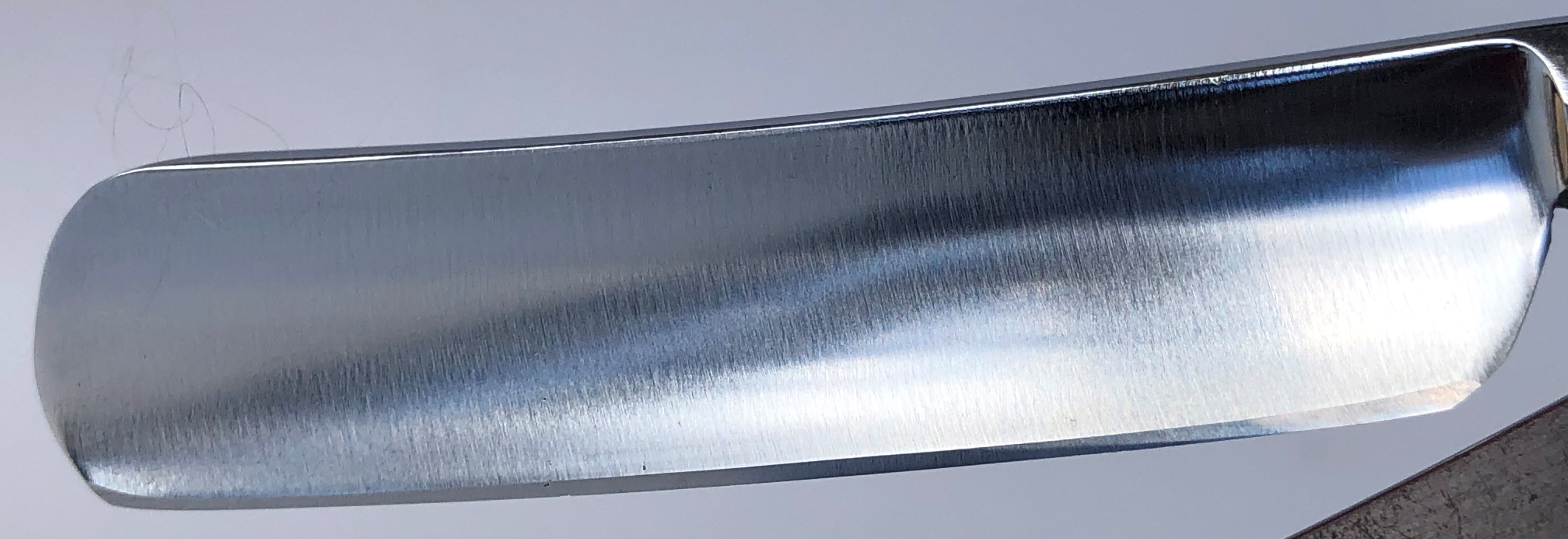 Само полотно на несколько мм укорочено.Было немного освежено от патины, с повторением "родного" характера шлифовки и умеренной полировки.Идеальная геометрия клинка. Сталь чистая, без видимых дефектов.Очень приятная во всех отношениях бритва, достаточно недорогая и если бы не укороченное полотно, то цены бы ей не было...