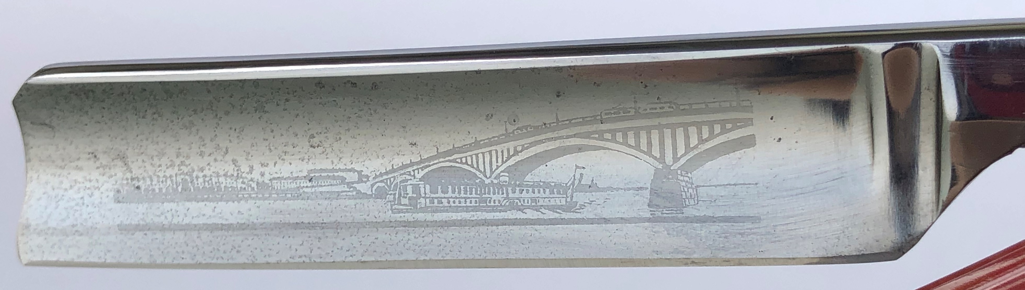 "ГРАВЮРА" 1955 года выпуска, от Труд Вача, в достаточно редком, таком "потовом" исполнении клинка, с парикмахерским вырезом.Изображение моста в Нижнем Новгороде.