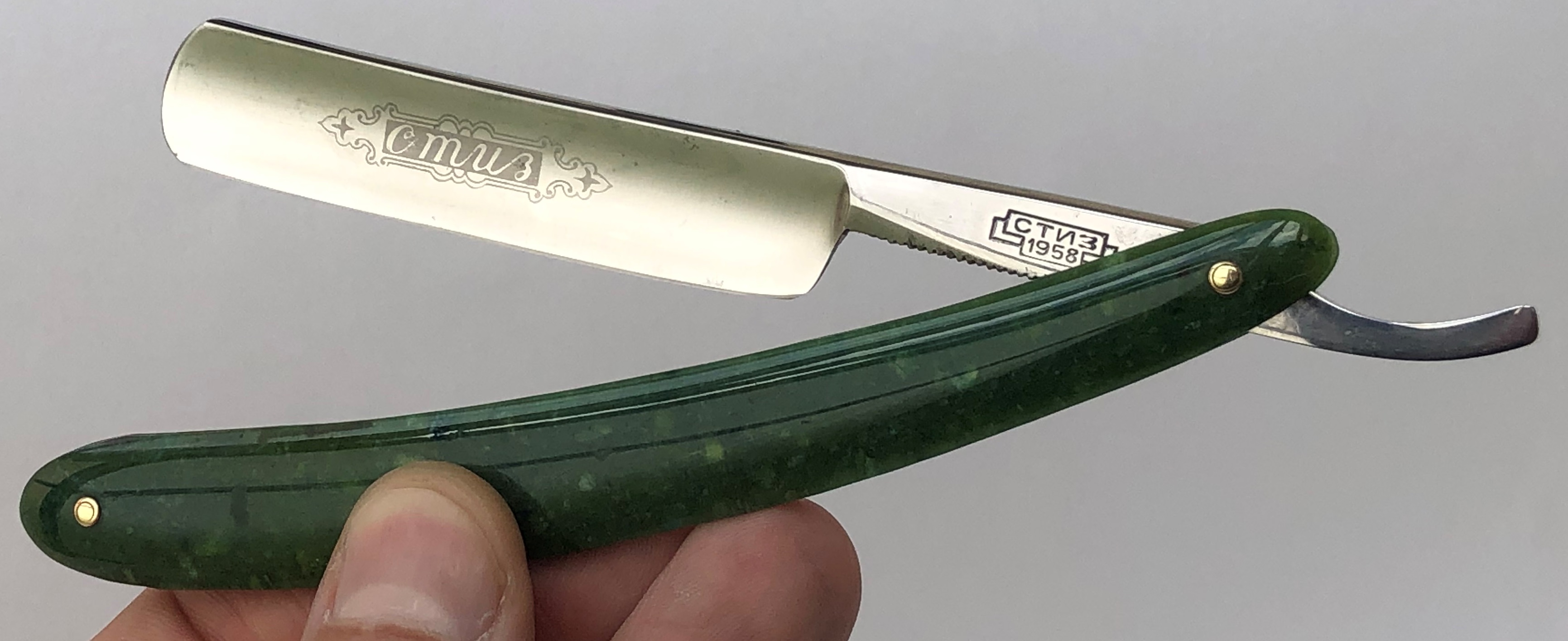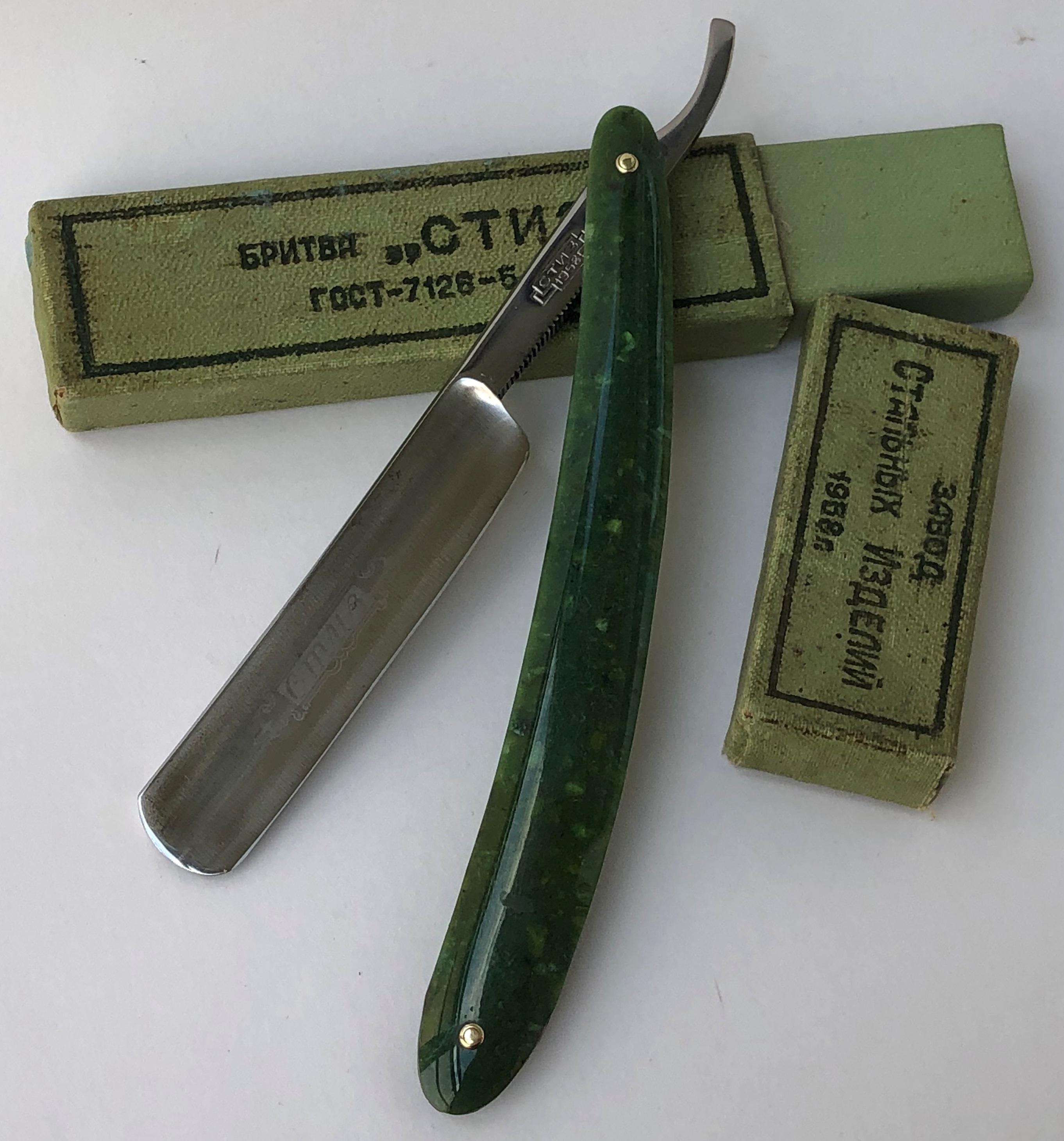 Бритва коллекционного состояния,изначально была с заводской заточкой. Была разобрана, для удаления окисления в районе осевого пина, собрана с добавлением внутренних шайб, а также с сохранением родных пинов.Сталь чистая, без видимых дефектов.Нанесение на полотне четкое, без потертостей.Заводская шлифовка и полировка.Идеальная геометрия клинка. Эффектная ручка цвета малахита. В тон ручки родная коробочка также 1958 года! Идеальный вариант для новичка и в коллекцию.