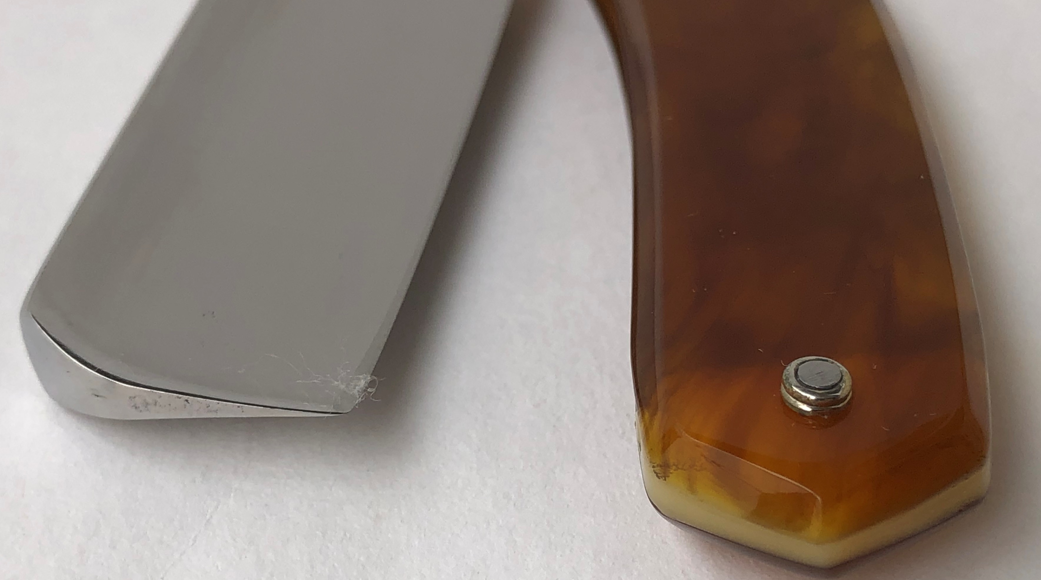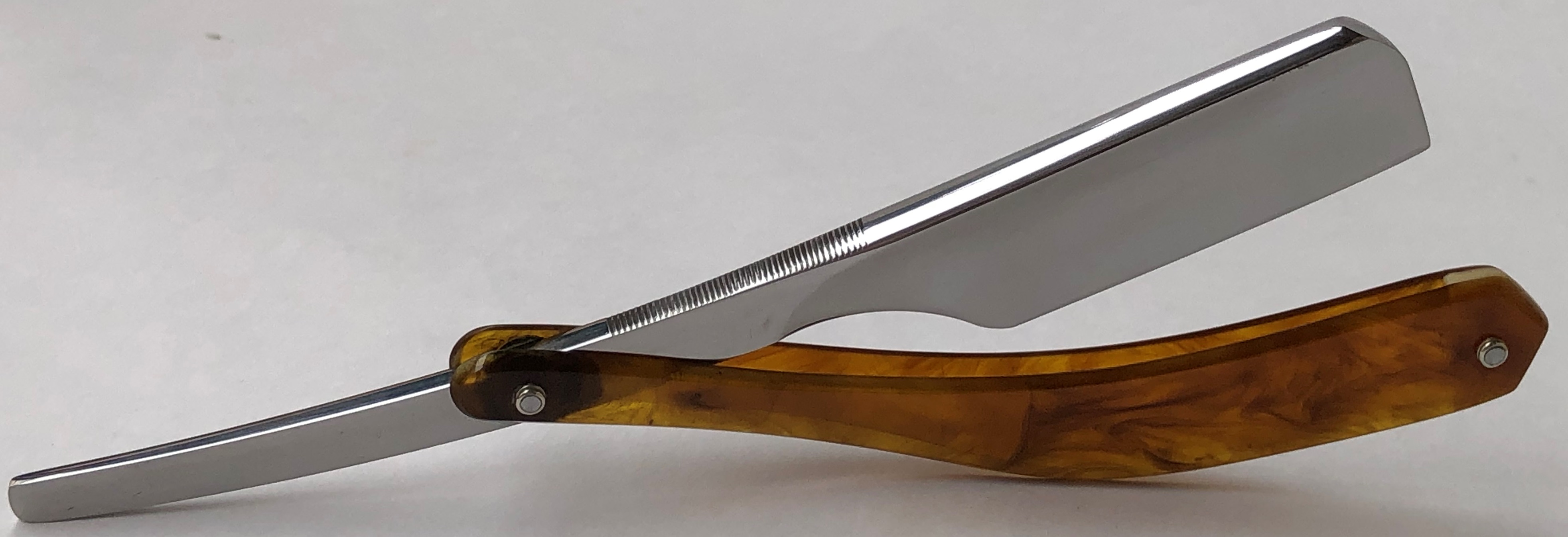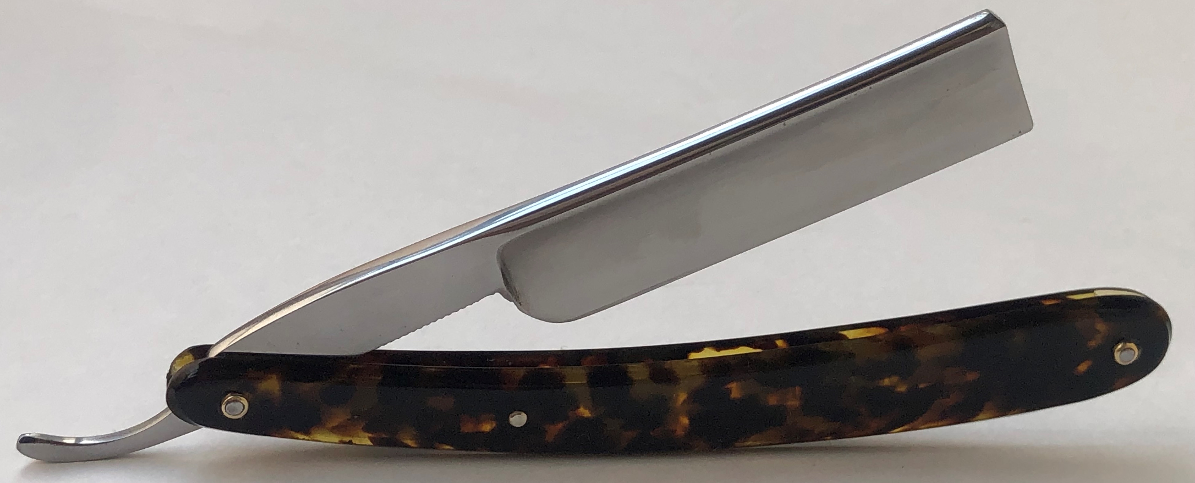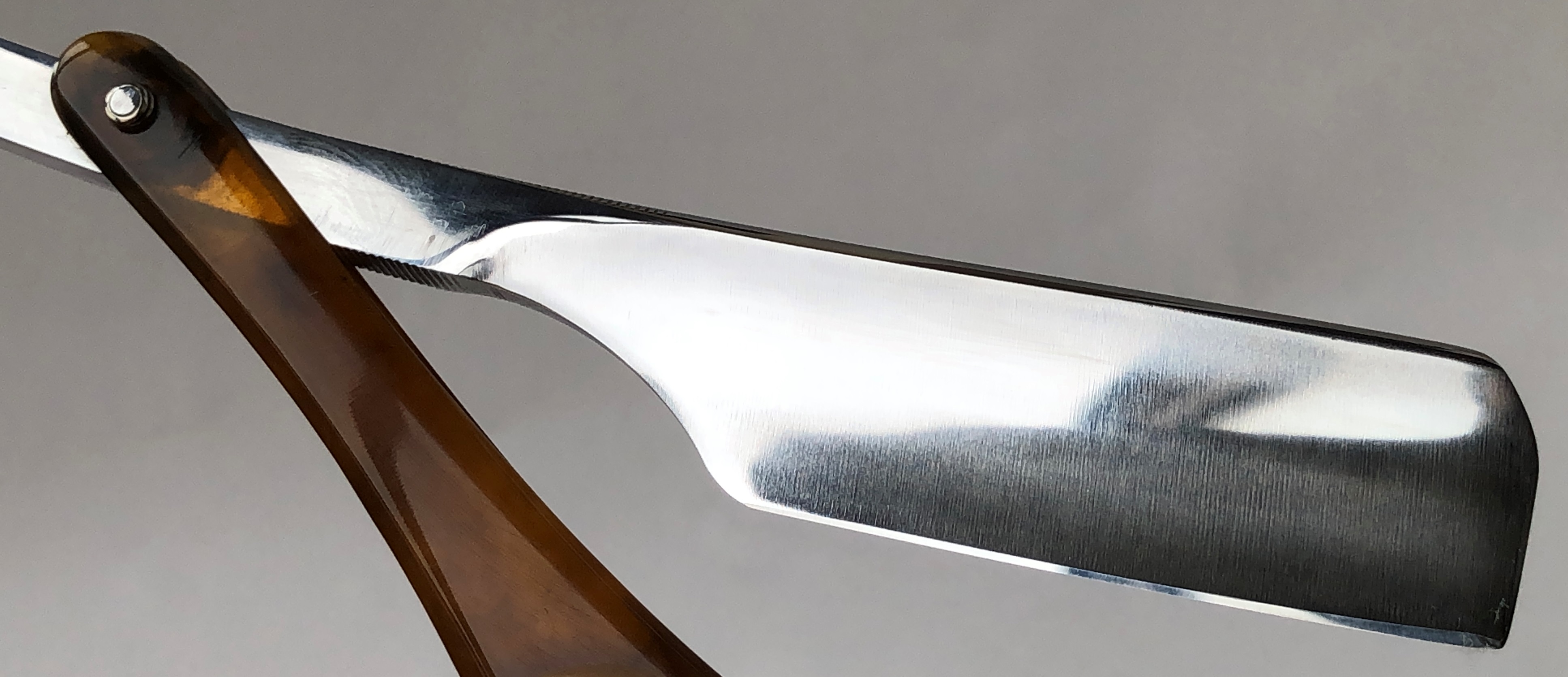 Ширина полотна-20.0 мм. Толщина обушка=5.8 мм. Полная вогнутость. Углеродистая сталь. Судя по всему это начало прошлого века. Клинок имел остатки старой сломанной оправы, с надписью "solingen".Сам клинок находится в очень приличном и аккуратно пользованном состоянии.Полотно было почищено(без регринда) и умеренно отполировано. Идеальная геометрия:кромочка равномерна по всей длине.Не долго думая,раскопал старую ,мощную немецкую ручку "под черепаху", от Бисмарка.Немного неестественно смотрится толстенный эрль относительно плашек ручки, но в общем и целом бритва получилась неплохой, особенно с клинком из высококачественной стали.Бритва достаточно крупная , с удобным хватом.Заточена и готова к бритью. Цена-10500 р с доставкой.ПРОДАН Spoiler Show