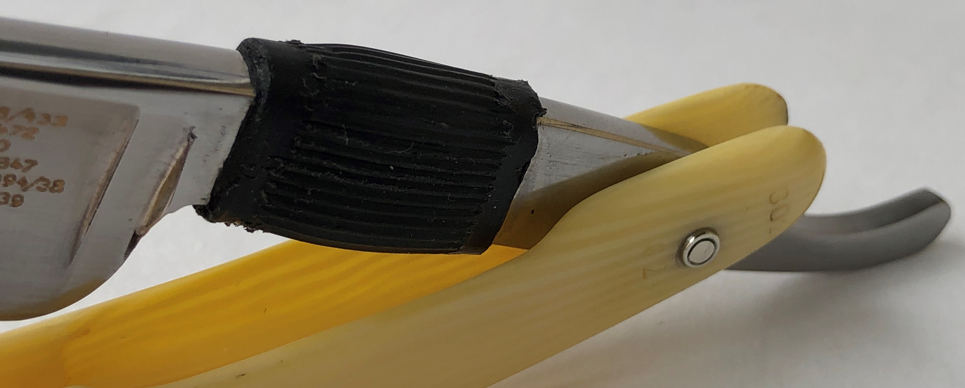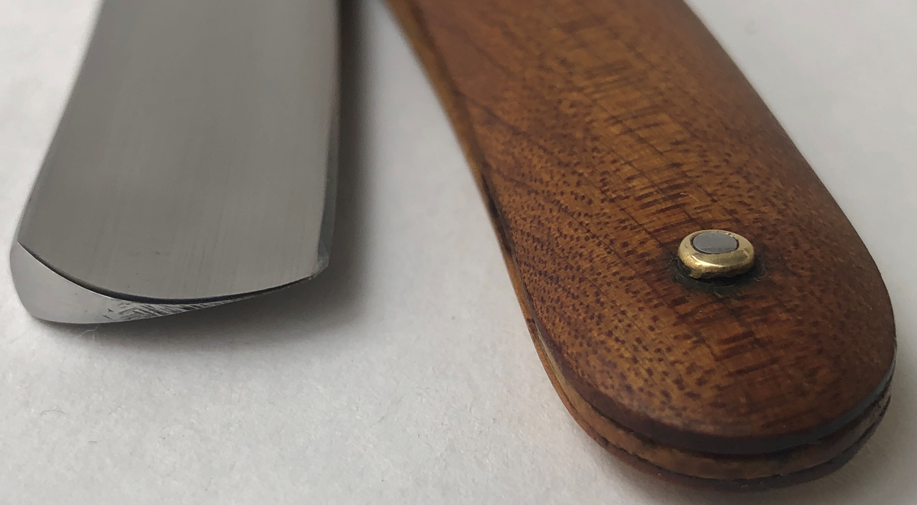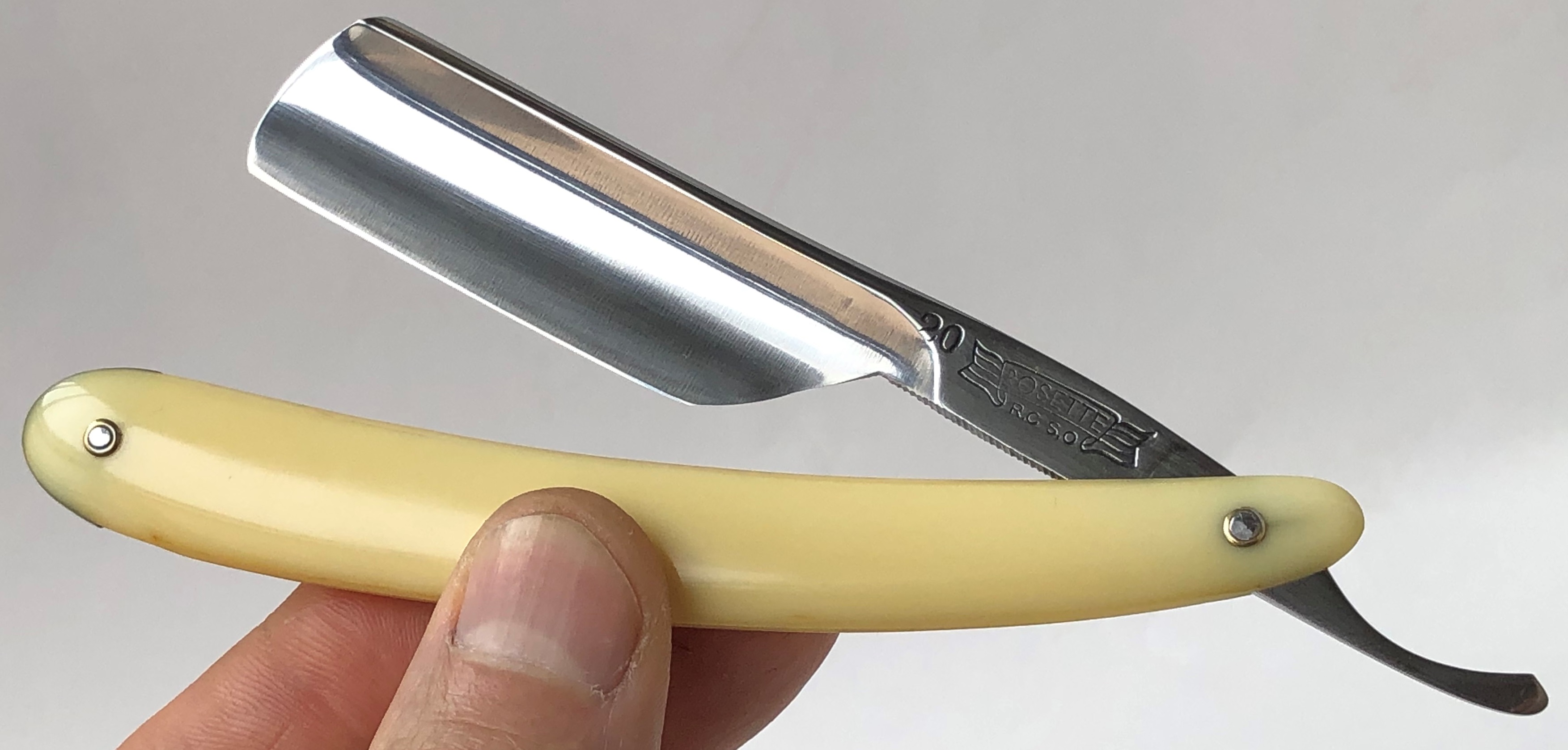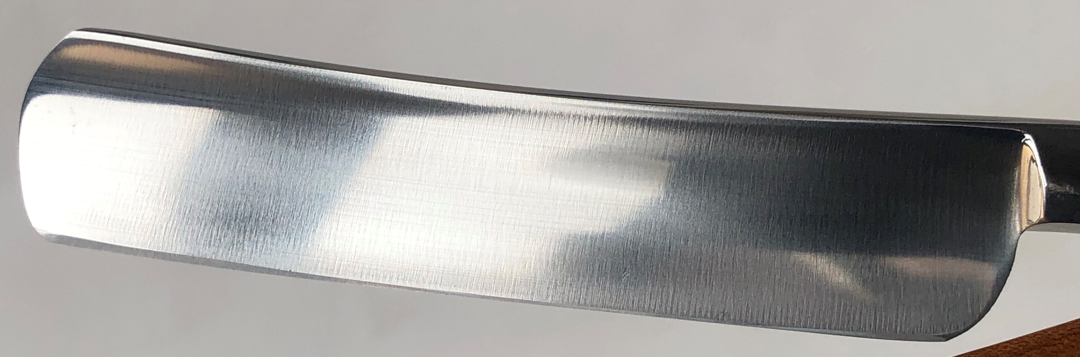 Ширина полотна-20.0 мм. Толщина обушка=5.8 мм. Полная вогнутость. Углеродистая сталь. Судя по всему это начало прошлого века. Клинок имел остатки старой сломанной оправы, с надписью "solingen".Сам клинок находится в очень приличном и аккуратно пользованном состоянии.Полотно было почищено(без регринда) и умеренно отполировано. Идеальная геометрия:кромочка равномерна по всей длине.Не долго думая,раскопал старую ,мощную немецкую ручку "под черепаху", от Бисмарка.Немного неестественно смотрится толстенный эрль относительно плашек ручки, но в общем и целом бритва получилась неплохой, особенно с клинком из высококачественной стали.Бритва достаточно крупная , с удобным хватом.Заточена и готова к бритью. Цена-10500 р с доставкой.ПРОДАН Spoiler Show