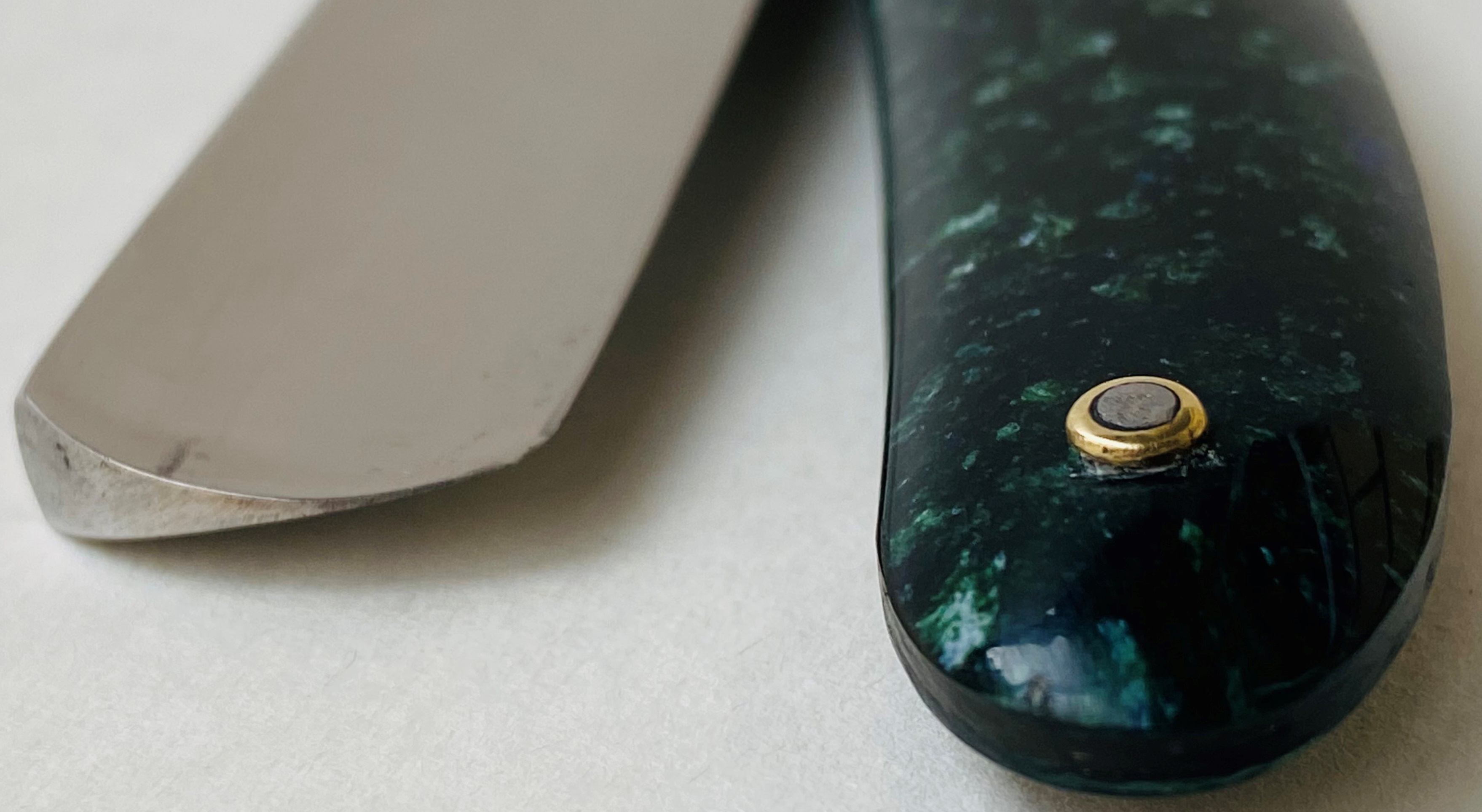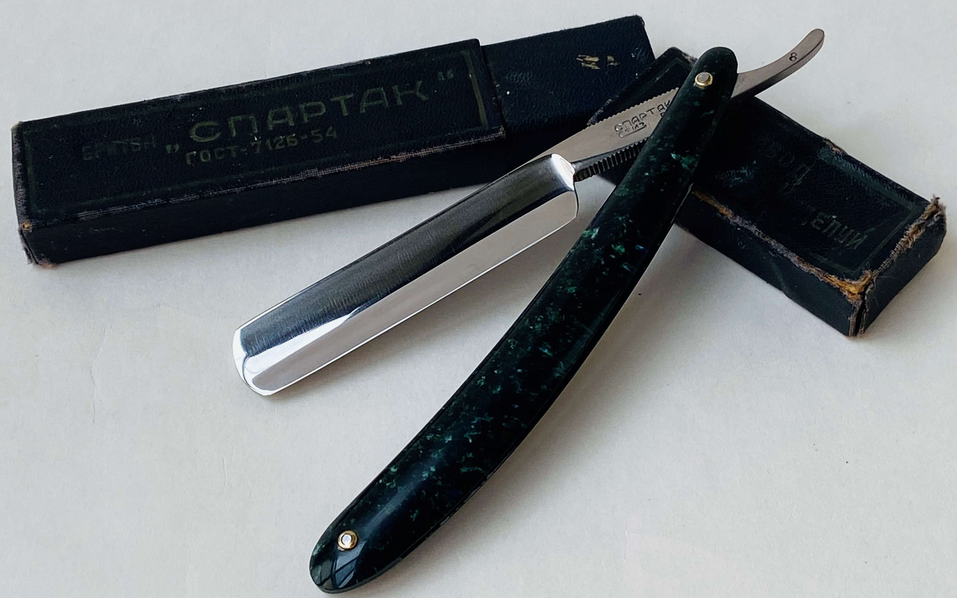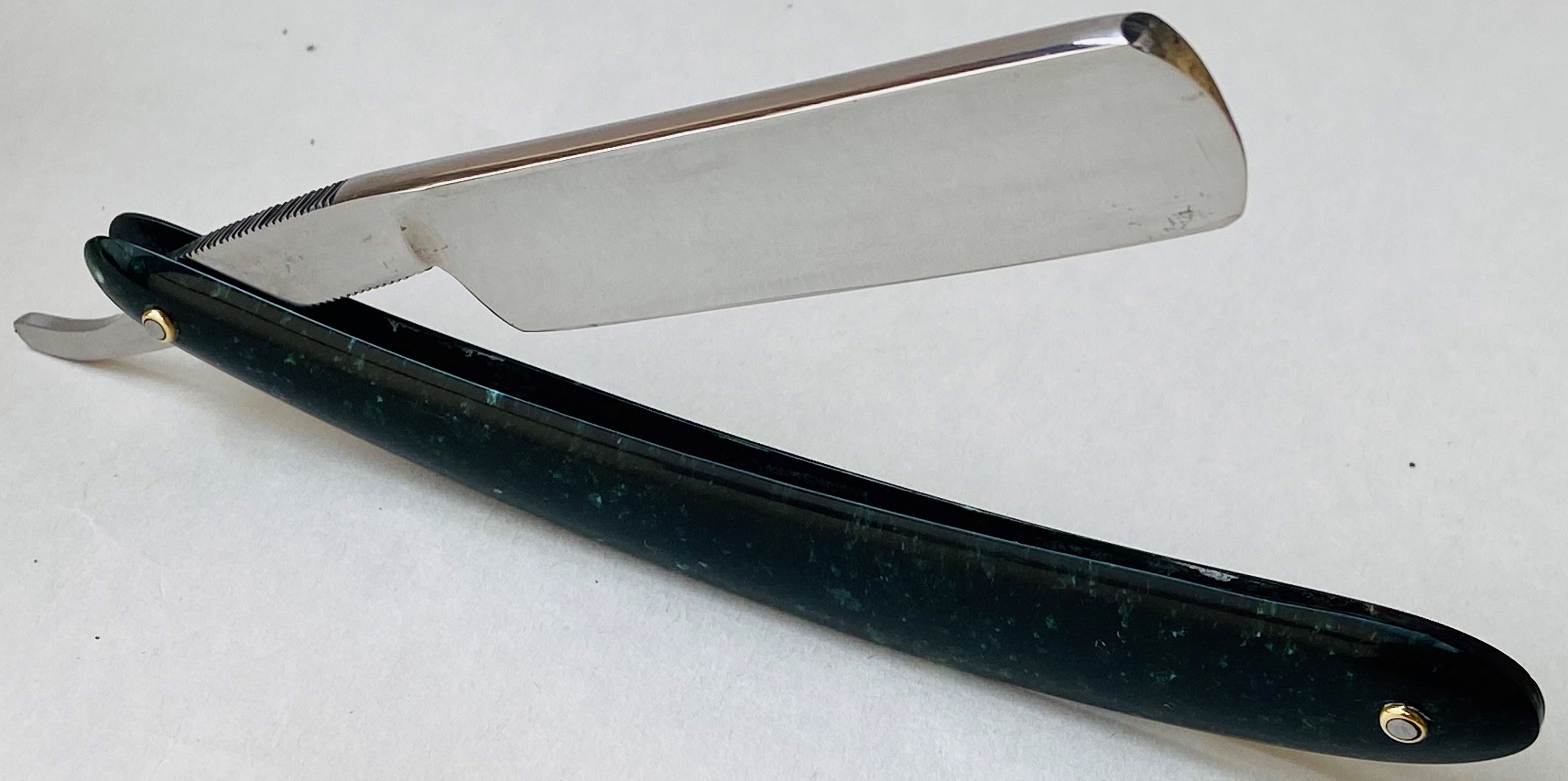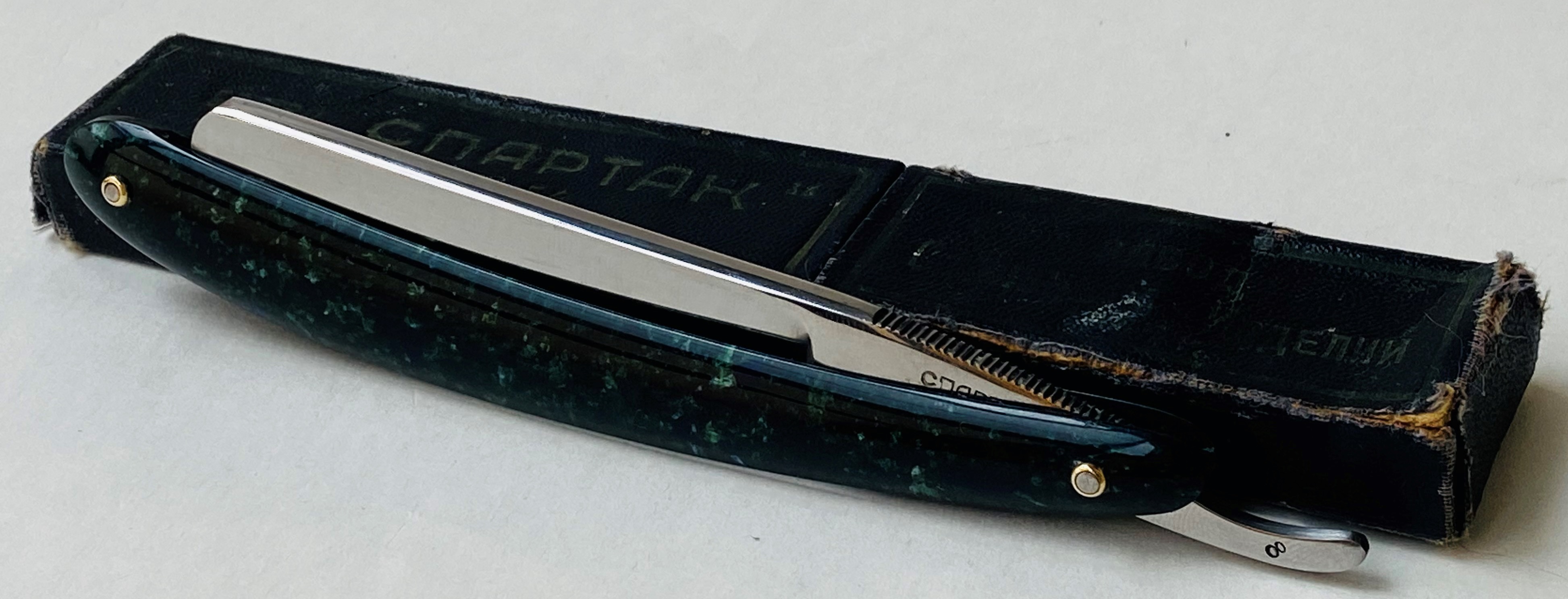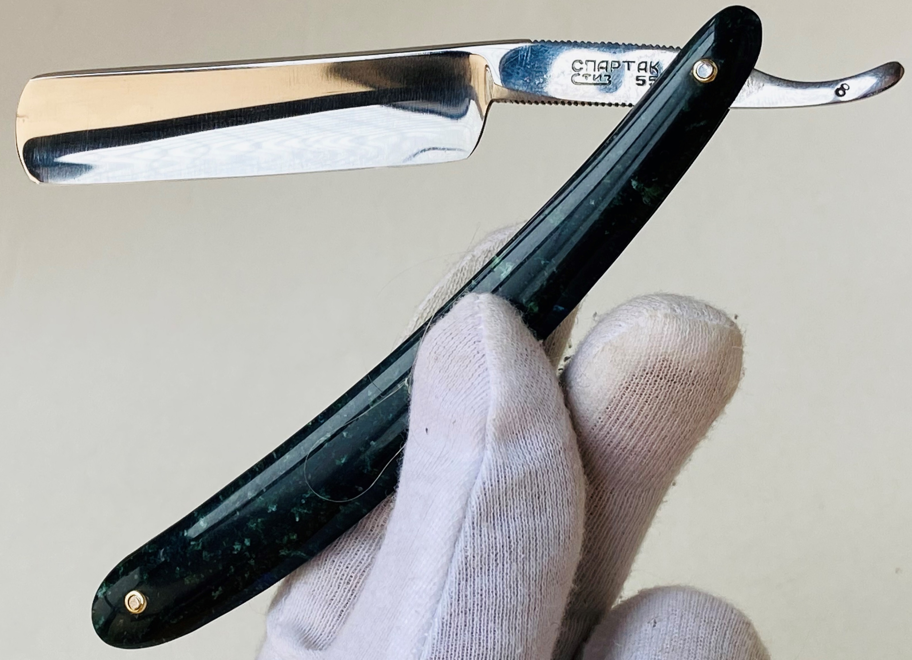 Бритва в состоянии близком к идеальному. Самая крупная и "горбатая" бритва из всей линейки Стиз. Бритва без следов пользования и по всей видимости в работе не была. Нет следов от заточных камней на обушке.Оригинальная шлифовка и полировка клинка.Кромочка тоненькая по всей длине.Перебрал бритву, чтобы добавить внутренние шайбы и поменять заклепки на более практичные втулки.Шикарная и не часто встречающаяся оправа малахитового оттенка. Коробочка оригинальная также 1955 года. Короче, полный комплект.Бритва заточена и готова к бритью.