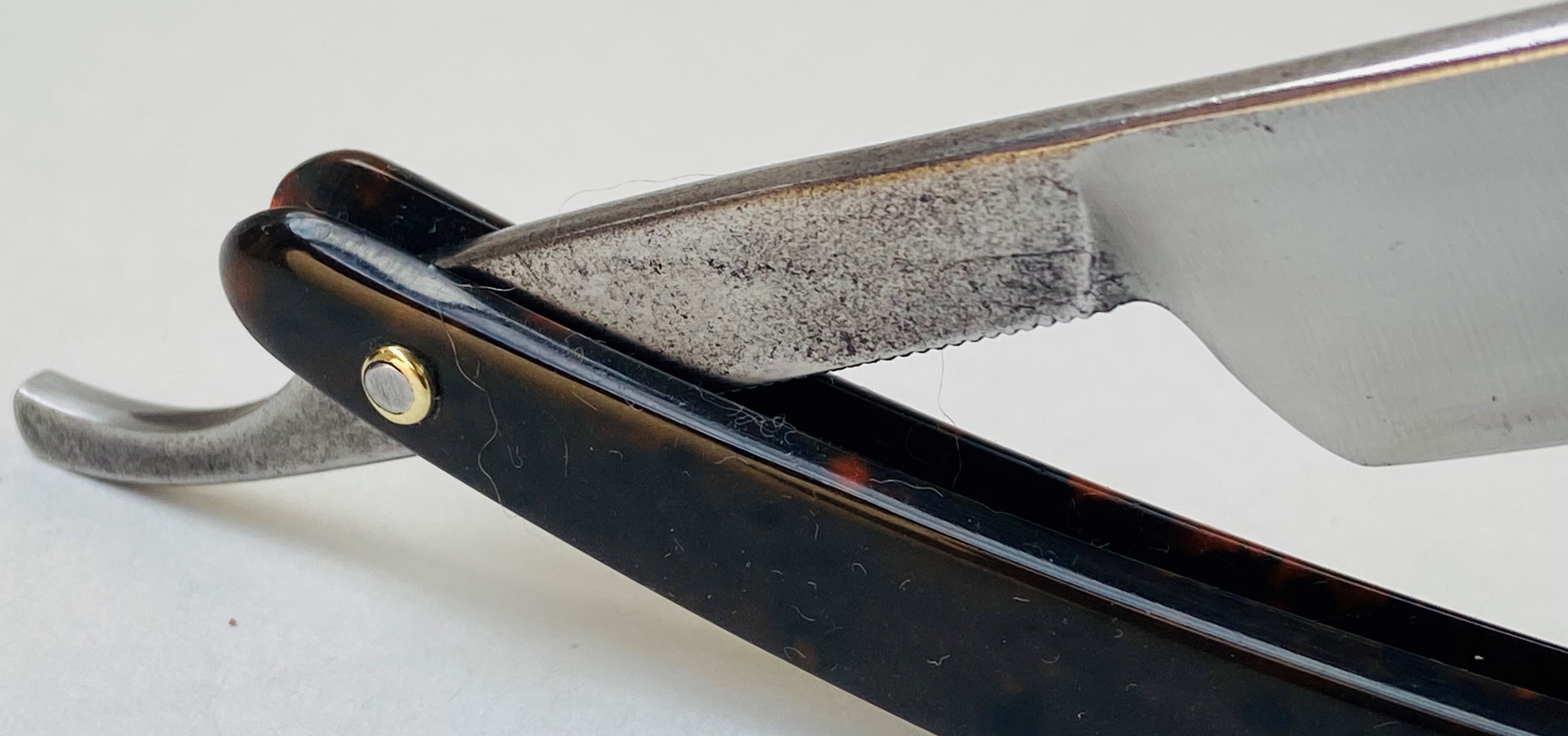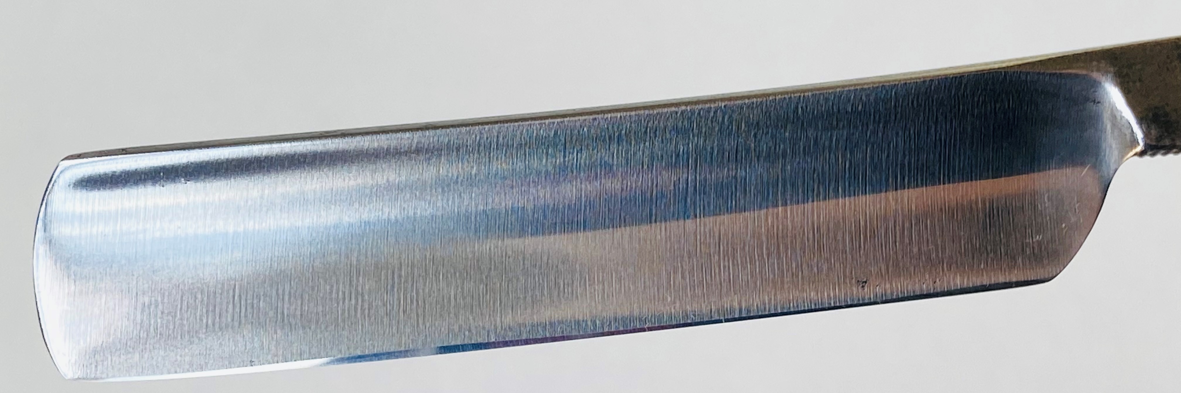 Бритва находится в идеальном состоянии и никогда в пользовании не была. Остатки масла с консервации удалены.Можно заметить шикарную, чуть уловимую патину на обратной стороне клинка,которую просто рука не поднялась удалять.Также видны следы от заводской электро-химической заточки. Идеальная геометрия клинка:кромочка равномерна по всей длине и еле заметна.Оригинальная шлифовка и полировка полотна.Травление чёткое, без потертостей.