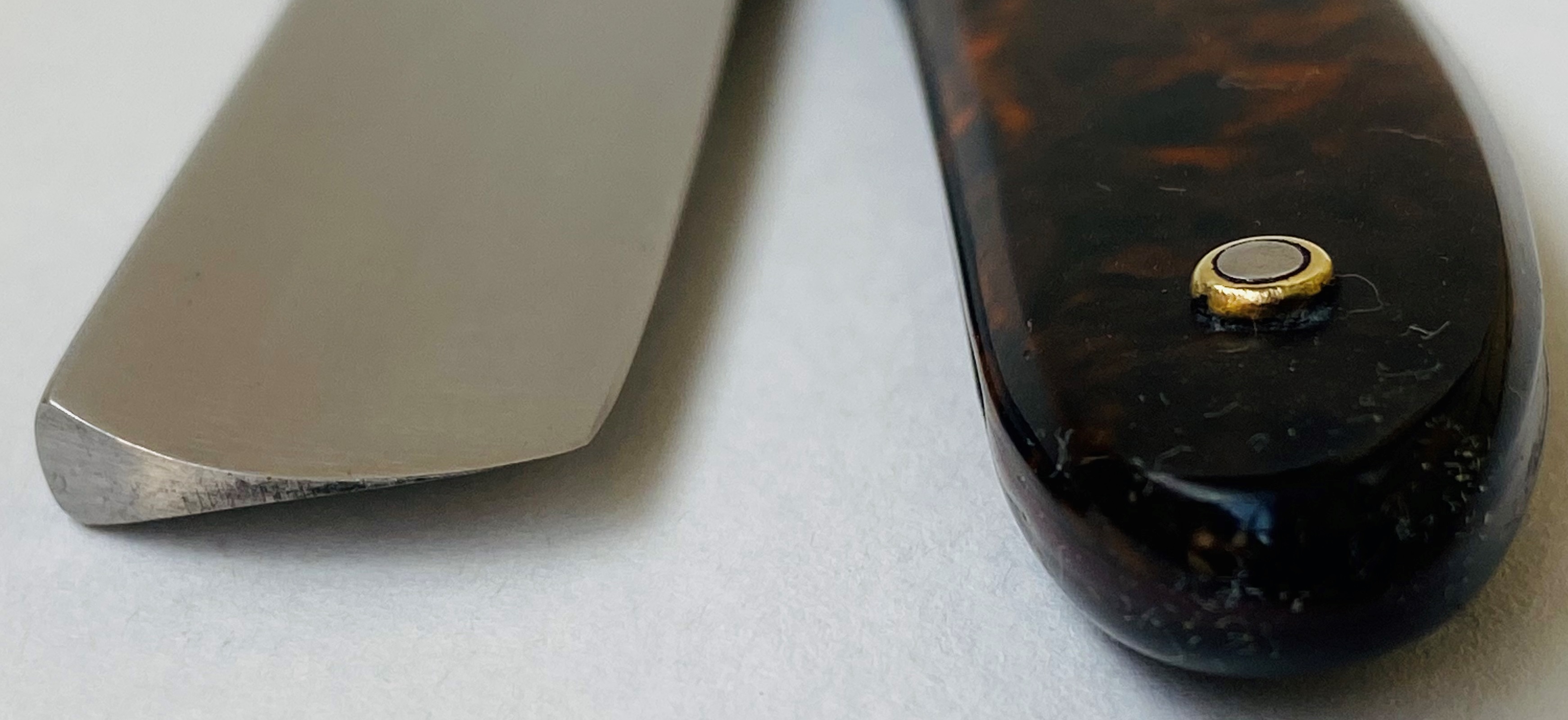 Бритва в пользовании не была, не имеет следов от заточных камней на обушке.Совсем минимальные, косметические работы.Новая двухцветная втулка взамен родному пину. Внутренние шайбы, для улучшения осевого механизма. Идеальная геометрия полотна:кромочка равномерна по всей длине.Видны остатки от заводской электо-химической заточки.Бритва находится сейчас в идеальном состоянии. Родная коробочка.