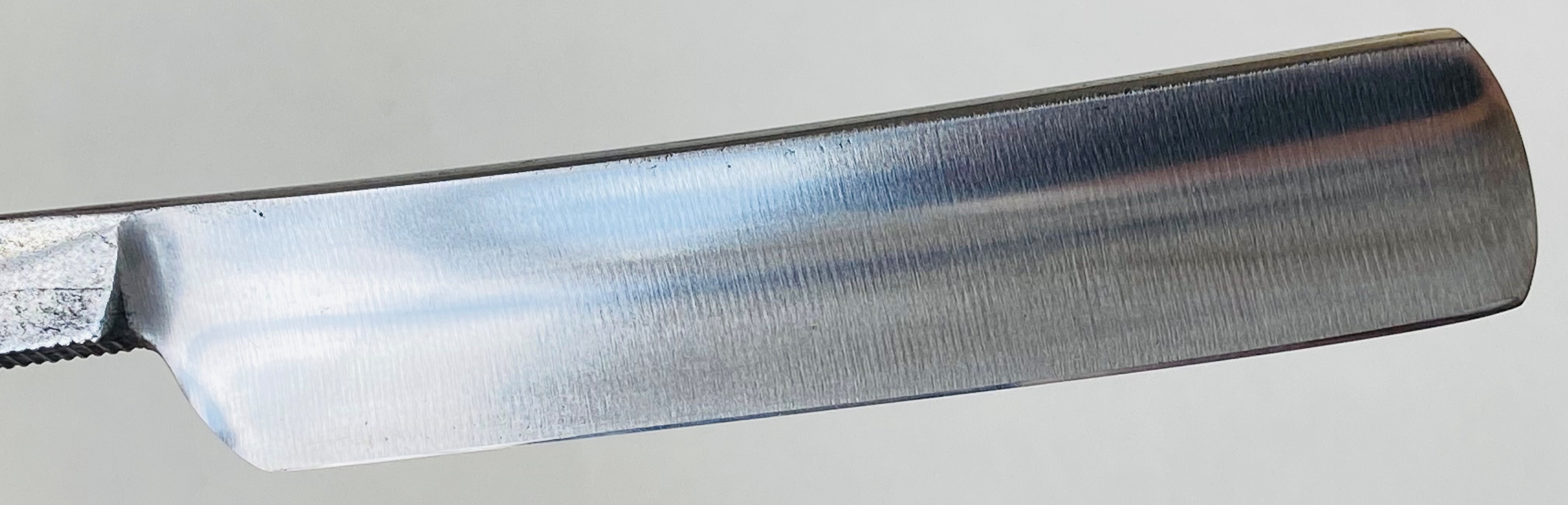 Отлично проявился след-переход от закалки клинка. Также, как на топовых бритвах Ивасаки и Камиджо Юкио. Красивая, мощная, тяжёлая и не часто встречающаяся бритва,так что не пропустите!