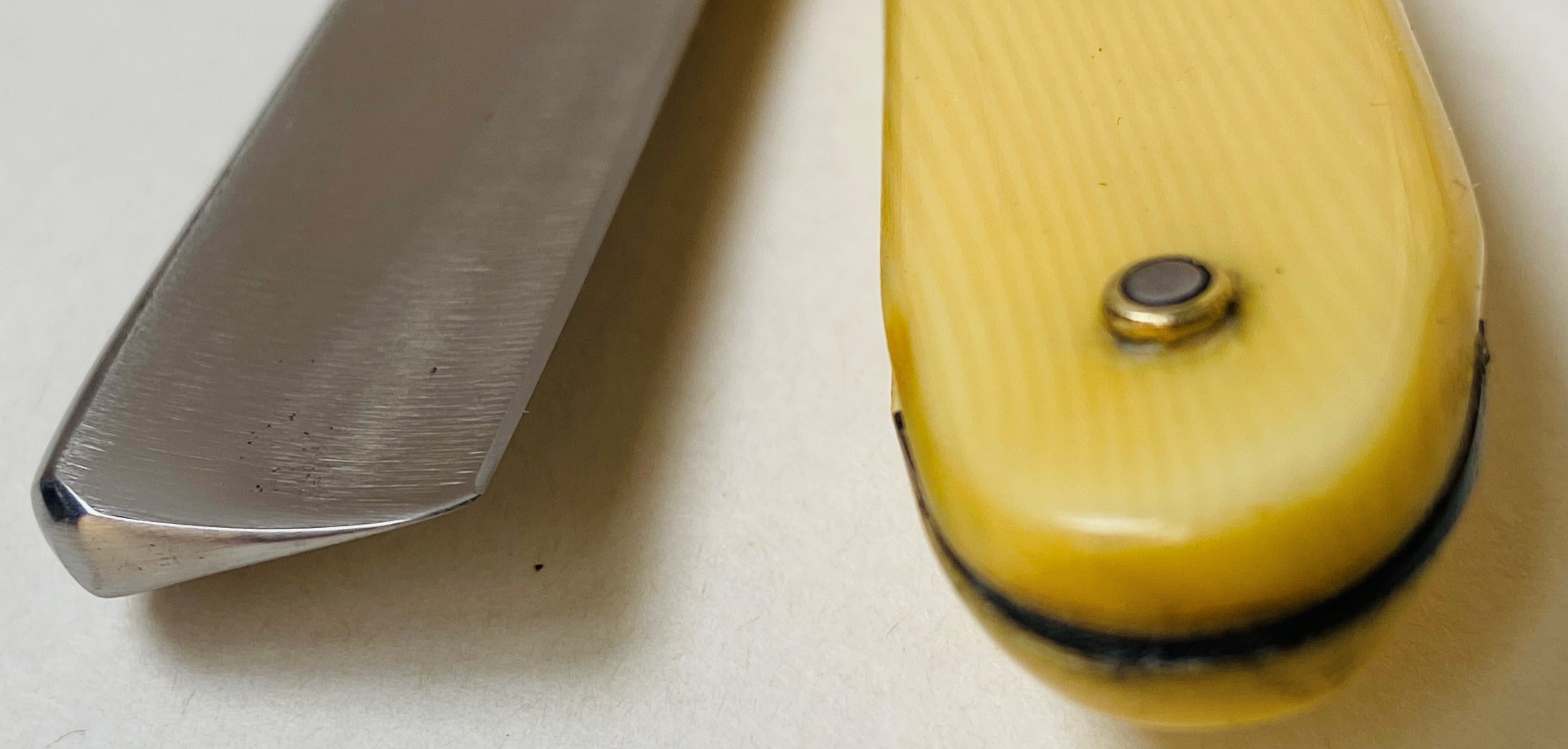 Бритва хоть и пользованная,но находится в очень хорошем состоянии для своих лет. По всей видимости была в пользовании у барбера,так как немного задран носик.Была разобрана, для приведения клинка в порядок.Шлифовка и умеренная полировка. Кромочка равномерна по всей длине.Оригинальные пины были перебраны и заново поставлены. Родная оправа ровная и мощная.( Небольшая трещинка в районе нижнего пина была надёжно проклеена с обеих сторон,отшлифована и отполирована.Так что практически незаметно и ни на что не влияет).