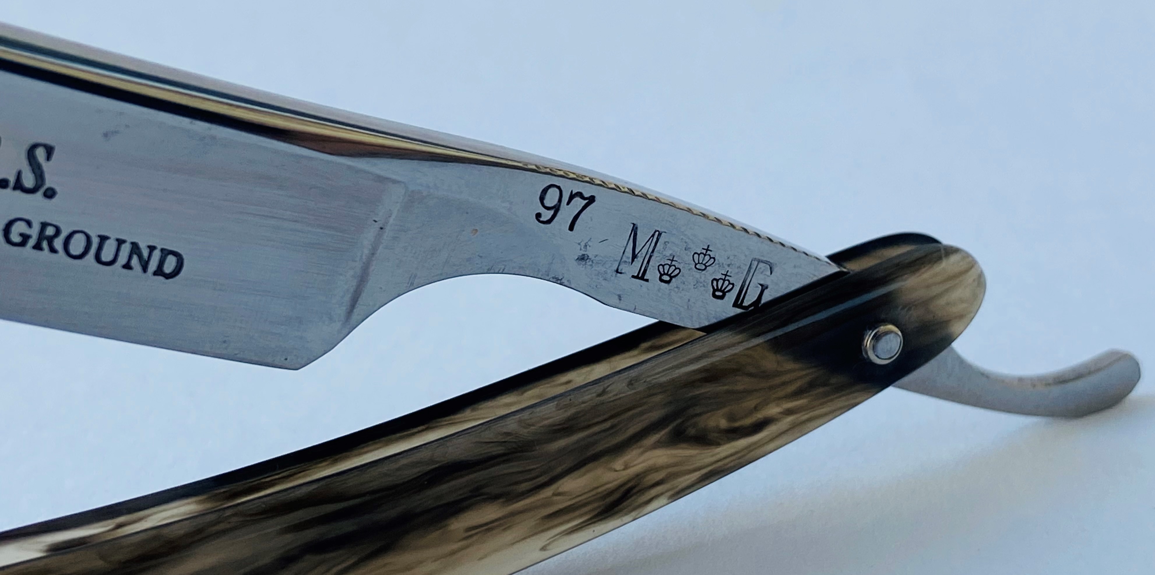 Клинок в хорошем состоянии.Произвел восстановительные работы по коррекции утОчки обушка,шлифовки и полировки. Родная оправа не сохранилась,но дабы не увеличивать конечную стоимость предмета,поставил трёх-пиновую оправу от старинного немца.Ручка восстановлена,но поз гарантийной защитой. Ничего там не должно поломаться, но если в процессе пользования ручка сломается в месте ремонта,тогда бесплатно все поменяю. Но, уверен,все там хорошо проклеено и послужит долго.Кромочка равномерна по всей длине.Достаточно тяжёлая.Заточена и готова к бритью.