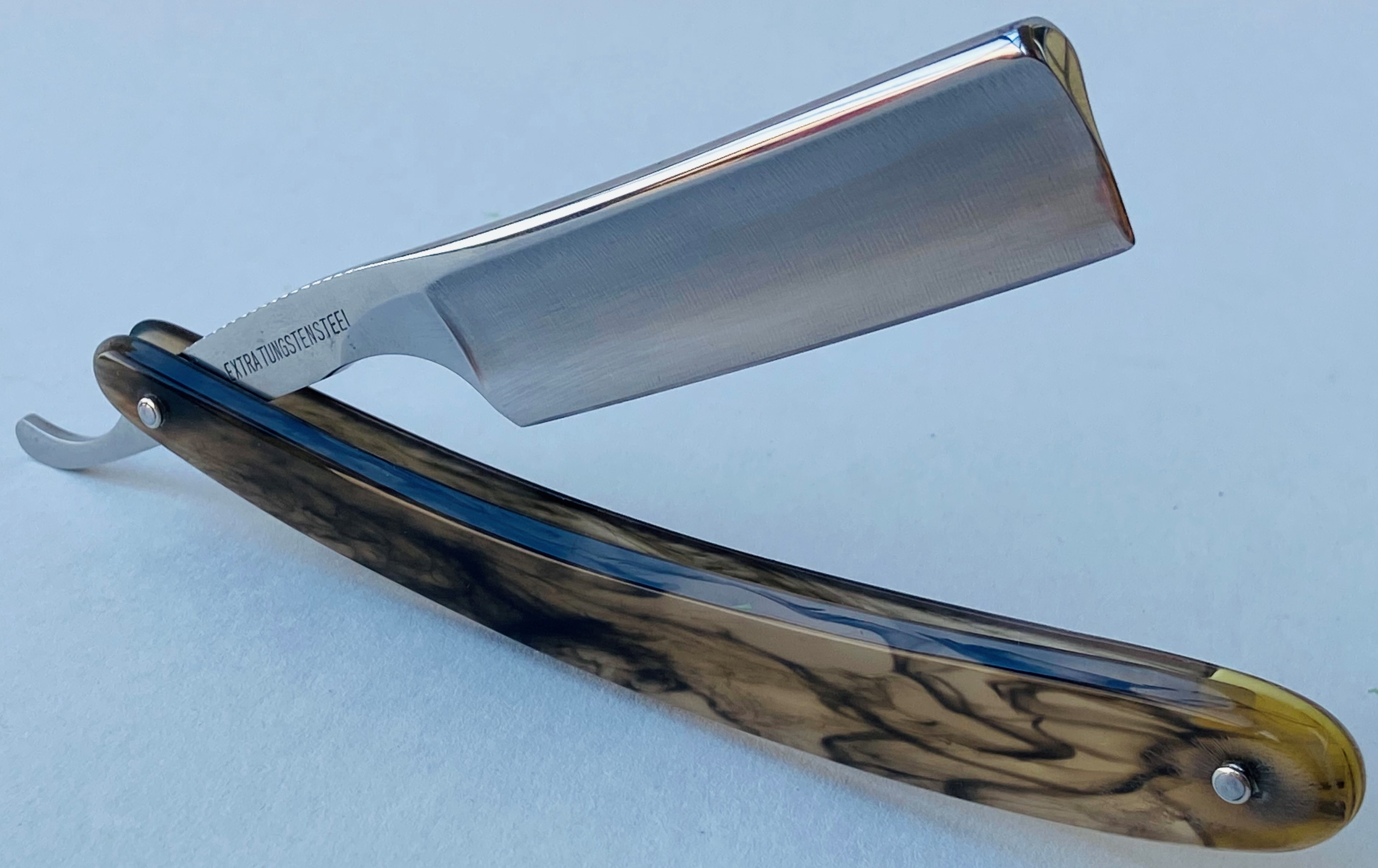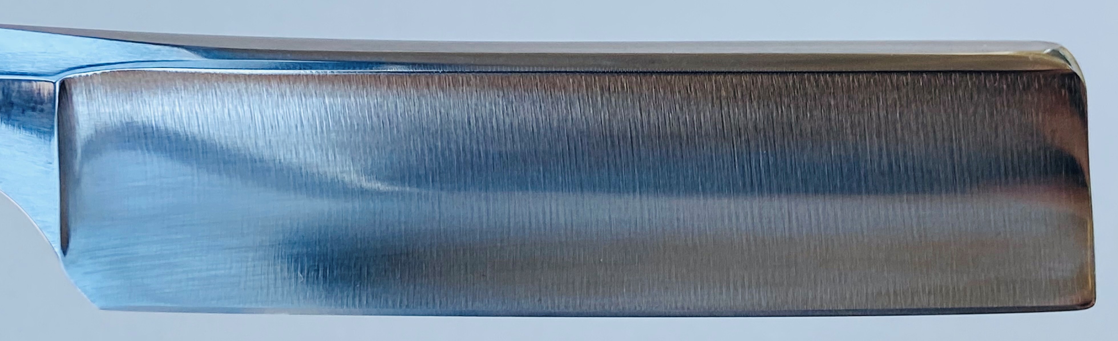 Бритва непользованная, но была подвергнута минимальным,косметическим работам.Умеренная шлифовка и полировка. Впервые вижу Вачу и такой шириной клинка.В общем и целом бритва достаточно крупная и тяжёлая.Новые втулки и внутренние шайбы.Кромочка почти равномерна по всей длине.Заточена и готова к бритью.