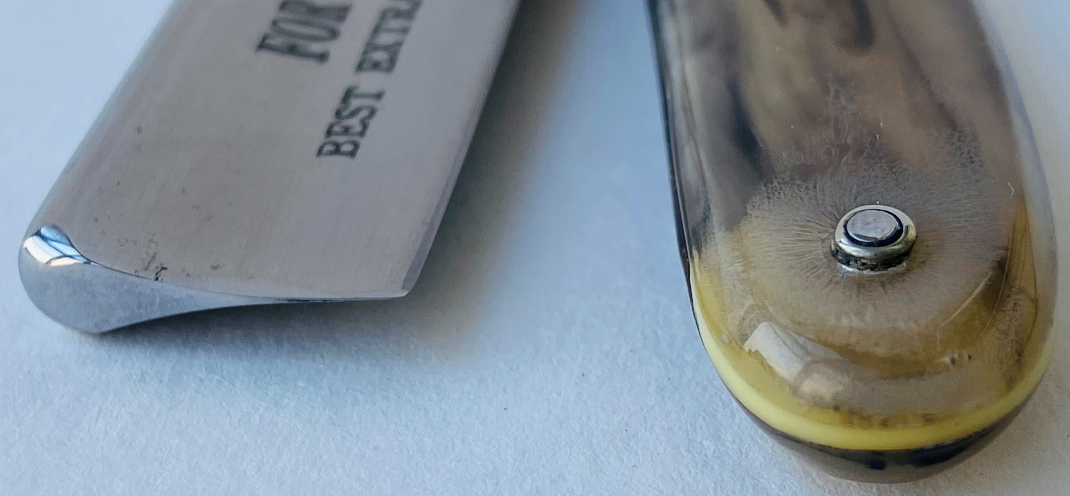 Мною было принято решение полностью сохранить внешний вид такого раритета,поэтому шикарную патину оставил как есть,предварительно разобрав бритву и удалив полиролью лишний налет.Родные пины удалось сохранить, впрочем как и оригинальную ручку,которая имела небольшую трещину снизу и ни на что не влияла. Новые внутренние шайбы. Аккуратная и равномерна выработка обушка. Кромочка идеально ровная по всей длине.В итоге получилась очень приятная бритва, с сохранением старинного,антикварного вида. Была заточена и уже несколько раз лично протестирована. Отличная, качественная сталь,впрочем как и большинстве немецких бритв,рубежа 19 и 20-х веков.