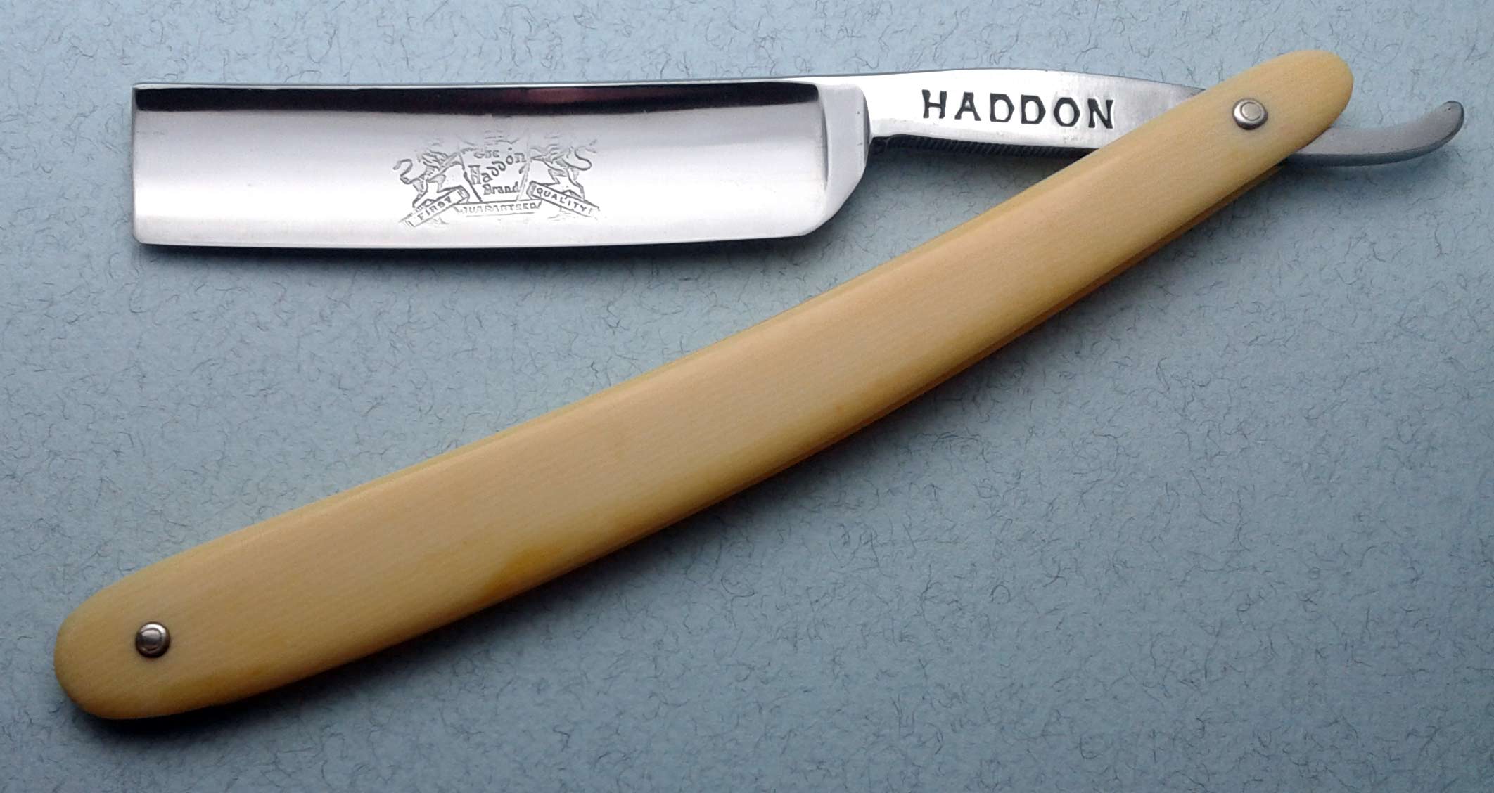Сведения о производителе: http://britva.ru/forum/viewtopic.php?f= ... lit=haddon" onclick="window.open(this.href);return false; Ручка - целлулоид, имитация слоновой кости - в отличном состоянии, клинышек - металл. По-видимому, ручка, клинышек и пины родные. Заточена и полностью готова к бритью. Ширина полотна 17 мм, толщина в обушке 4.5 мм.