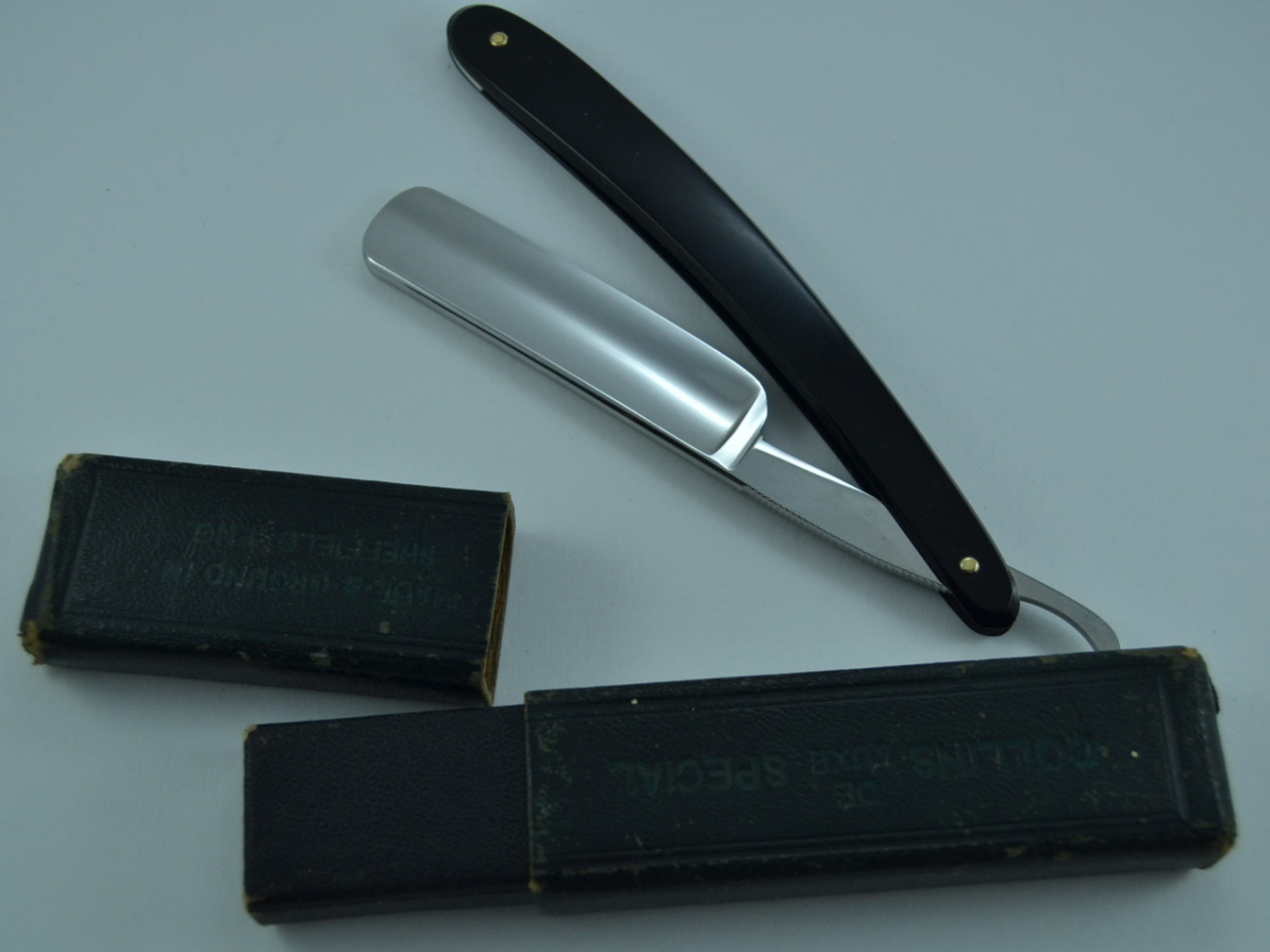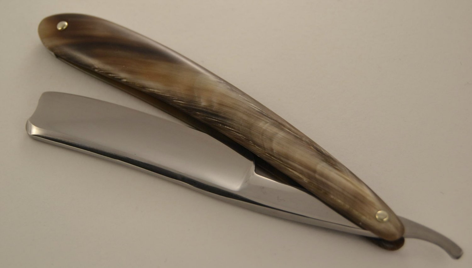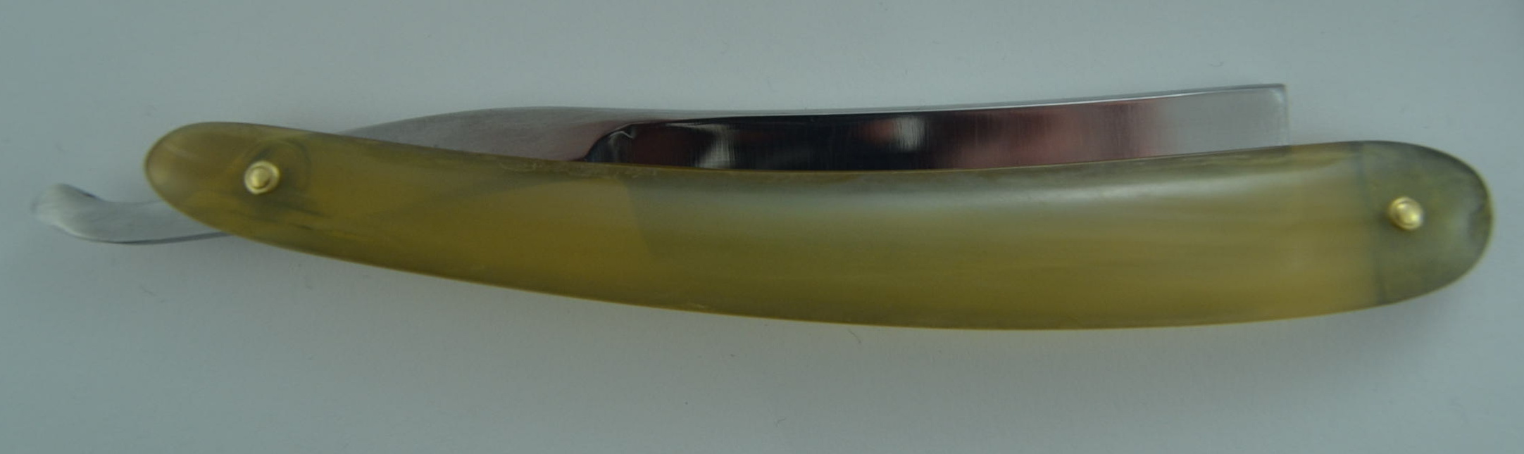 Английская бритва под торговой маркой Eclipse от Братьев Гилберт. Вогнутость 1/2, ширина 6/8. Необычная форма спинки. Новая ручка из рога буйвола насыщенной черно-белой расцветки. Рог очень высокого качества. В комплекте родной футляр гробиком в замечательном сохране. Заточена, готова к бритью. Продано Spoiler Show