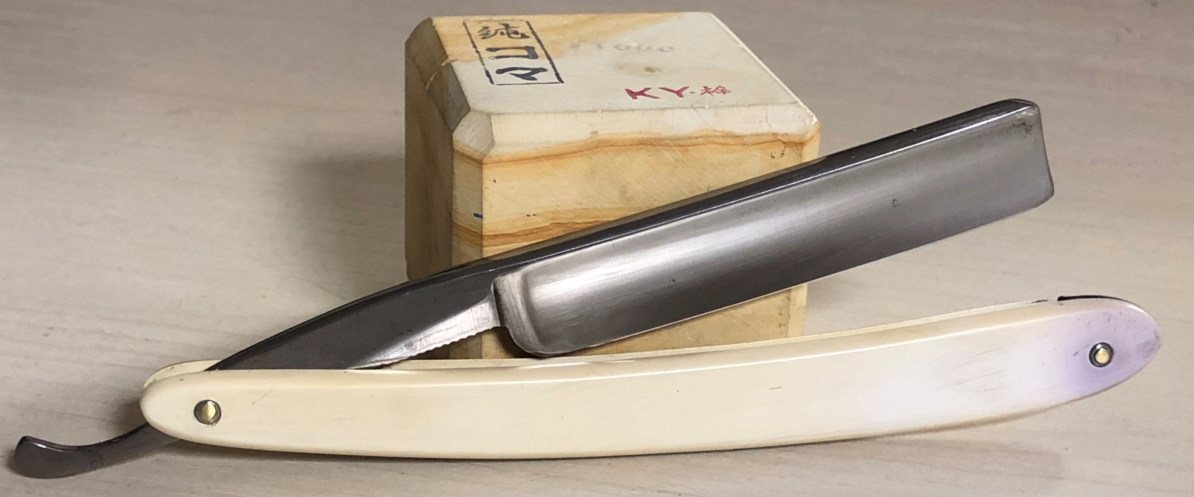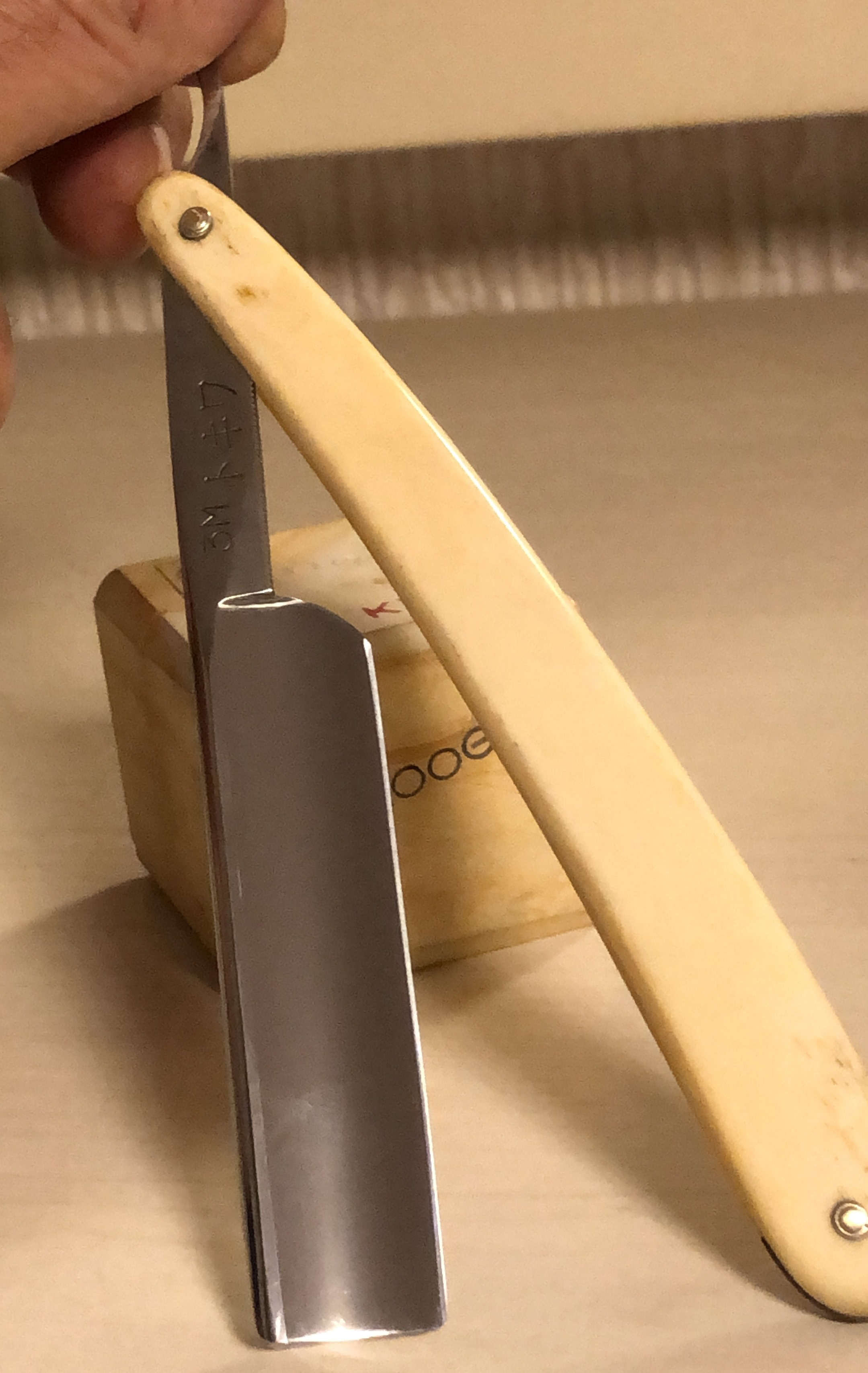 Изюминкой в компоновке данного раритета стал сюртук , пошива конца 19-го,начала 20-го веков.Имеется ввиду ручка из натуральной кости, от старинного донора. Оправа мощная, крепкая, тяжёлая, в идеальном состоянии.Пины удалось заново поставить оригинальные, от Ивасаки.Клинок в прекрасном состоянии,без видимых дефектов. Идеальная геометрия полотна:кромочка равномерна по всей длине.Сталь звонкая, отличного качества. По всем параметрам твердая, больше подошла бы для жёсткой щетины, но и для опытного пользователя будет очень неплоха. В общем и целом я доволен своей работой. На мой взгляд, отличная вещь для повседневного бритья.Заточена и готова к бритью.
