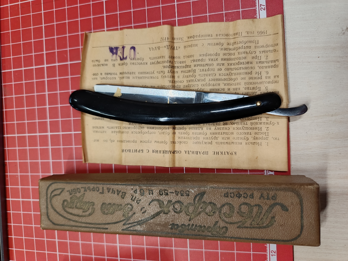 Продаётся от Олег БритваИнструкция и футляр не родные. Инструкция от 66 года, на коробке РТУ 59 года. Хотя в теории, бритву могли сделать раньше, а уже потом доукомплектовать и отправить в сбыт. Ну или в магазине сами заменили по каким то причинам