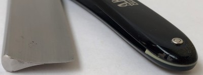 Ширина полотна-21 мм. Толщина обушка-5.9 мм. Форма лезвия-1/2 клина. Серебряная шведская углеродистая сталь. Примерно 50-60-е годы прошлого века. Бритва в очень хорошем и малопользованном состоянии. Разобрал, немного освежил металл клинка и снова собрал, с заменой пинов на немецкие втулки. Идеальная геометрия полотна:кромочка равномерна по все длине.Сталь и кромка чистые от разного рода видимых дефектов.Эффектная ручка"под черепаху".Тяжёлая, но за счет своего укороченного полотна верткая бритва, под разные задачи.Не часто сейчас встречаются укороченные японцы, так что не пропустите. Цена-11500 р с доставкой. ПРОДАН Spoiler Show Spoiler Show