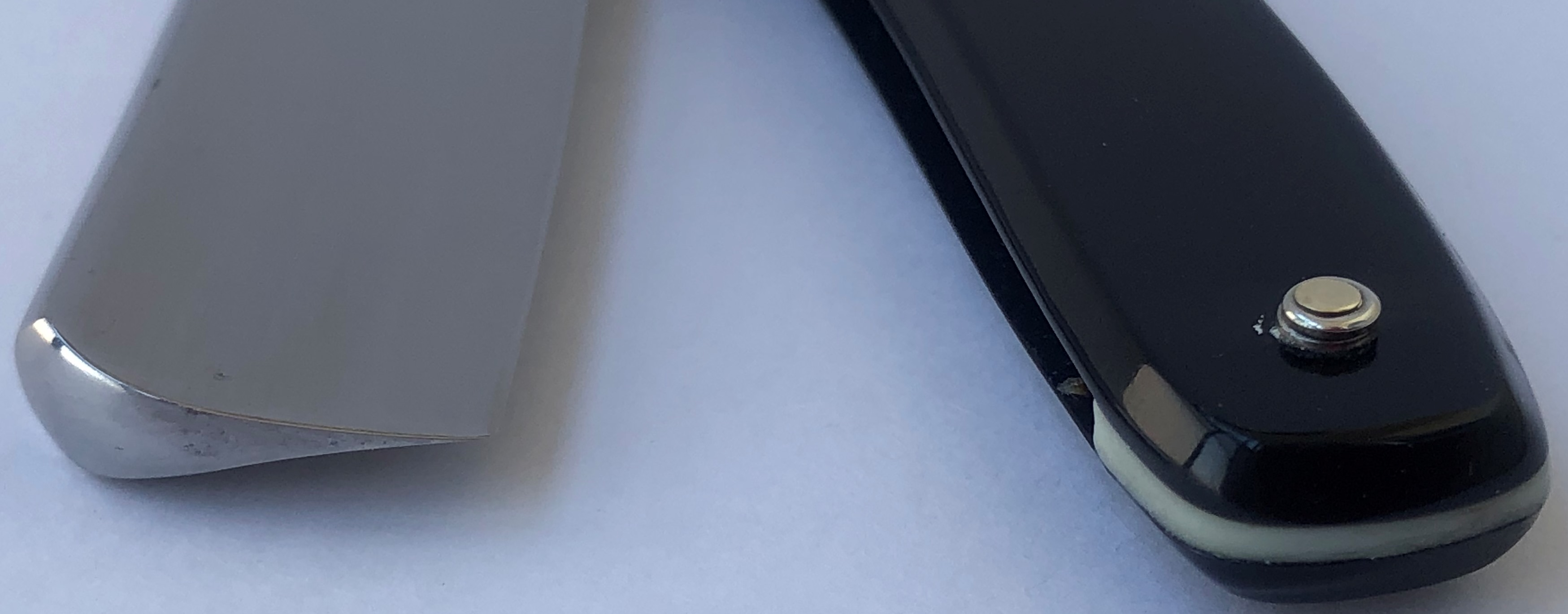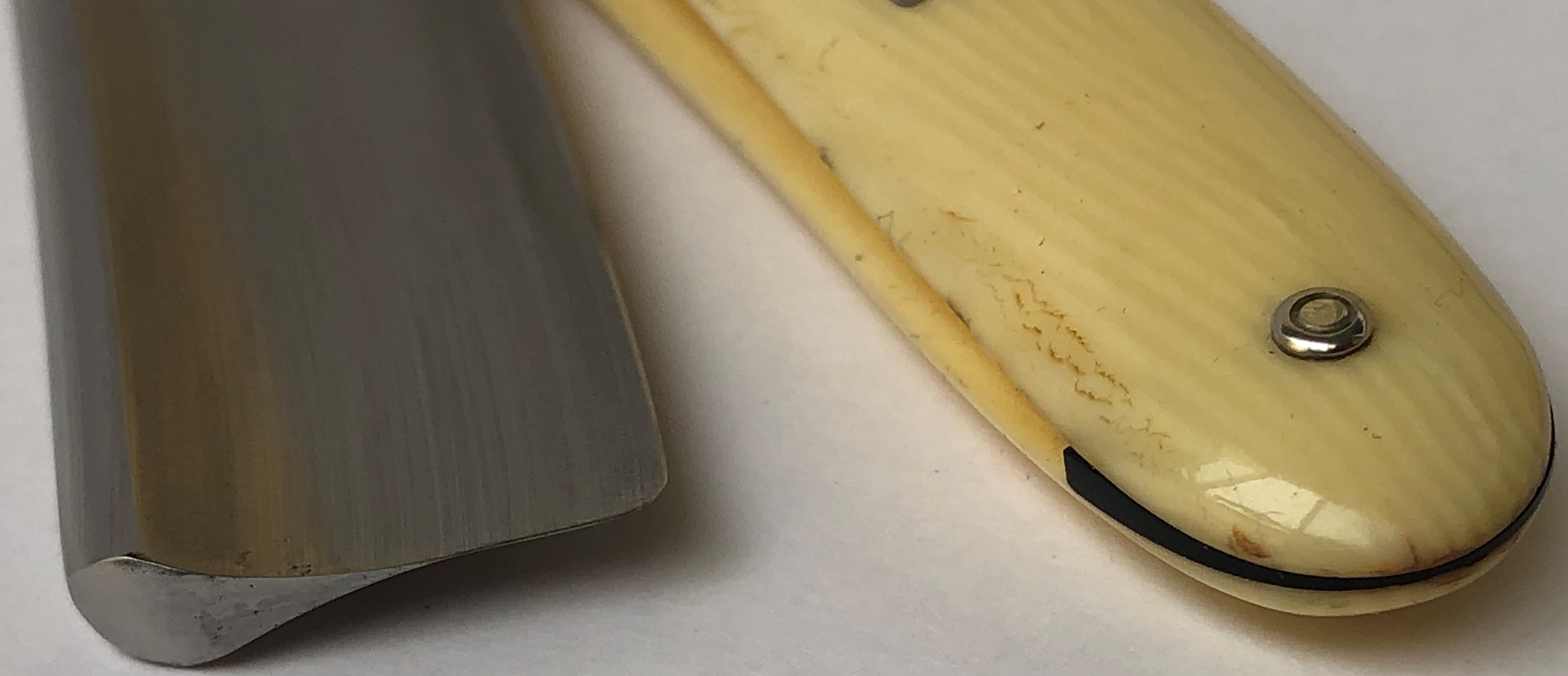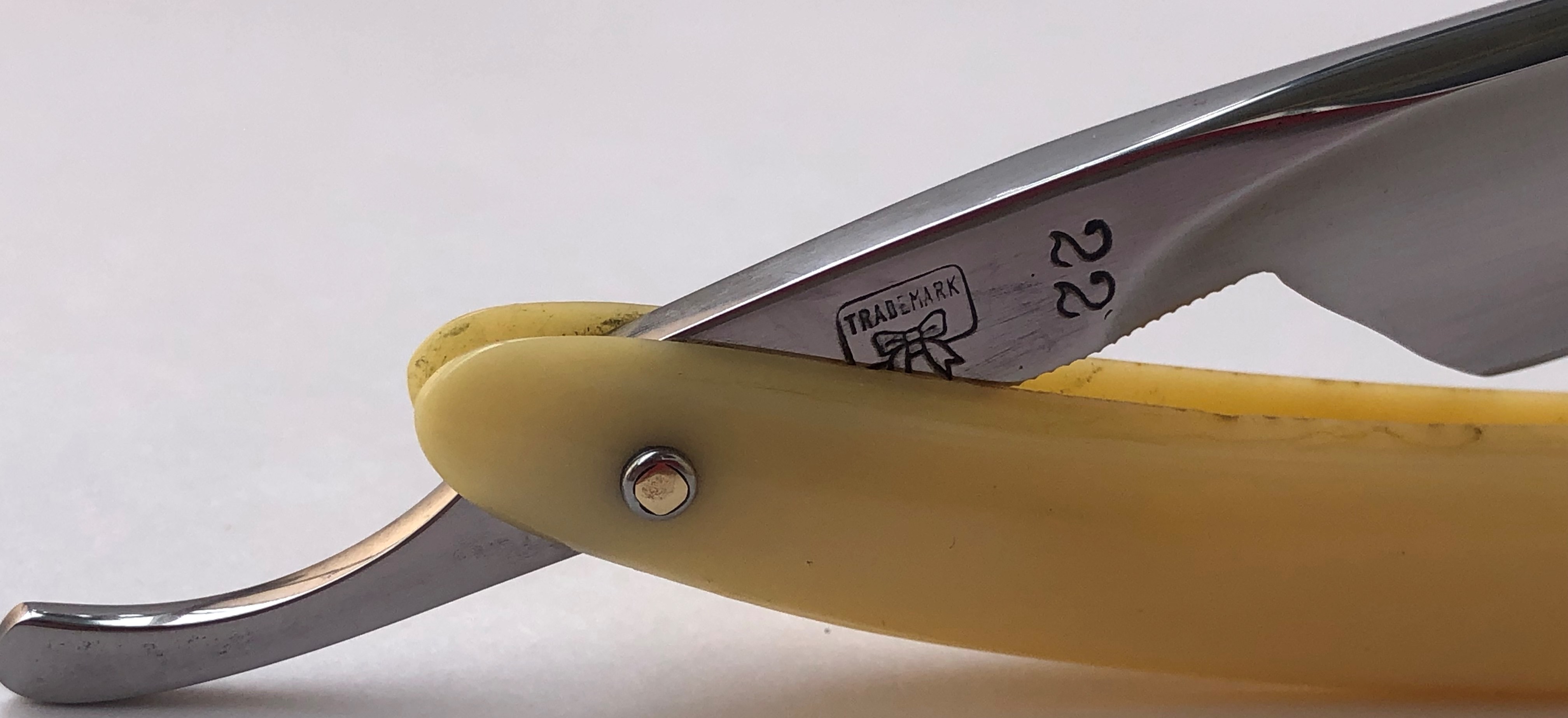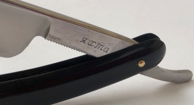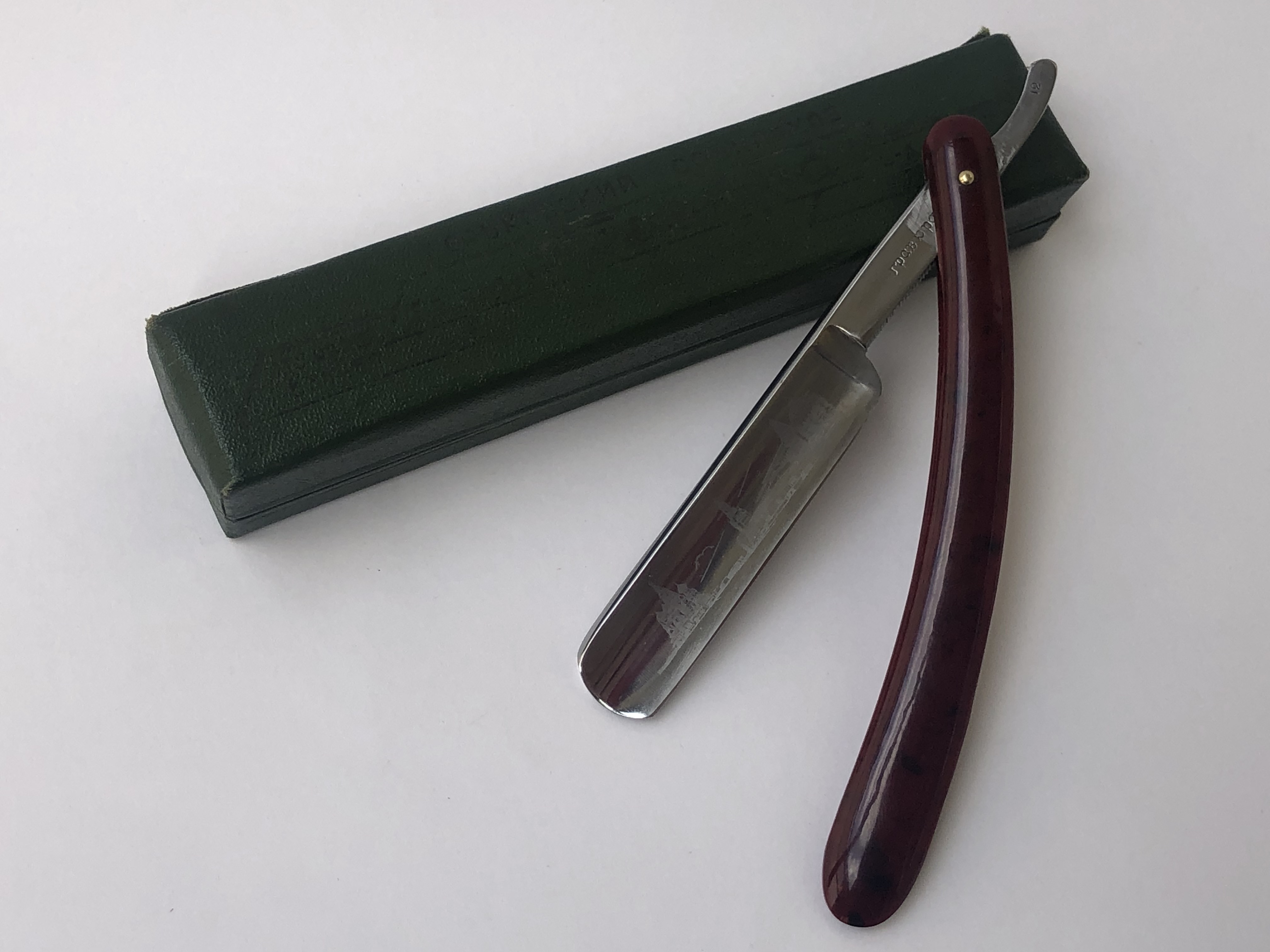 Бритва без следов пользования. Бритва была разобрана, немного освежено полотно от патины и снова собрано, с сохранением оригинальных пинов.Идеальная геометрия клинка:кромочка равномерна по всей длине.Сталь и кромка чистые от видимых дефектов.Бритва тяжёлая, мощная.Состояние новой.