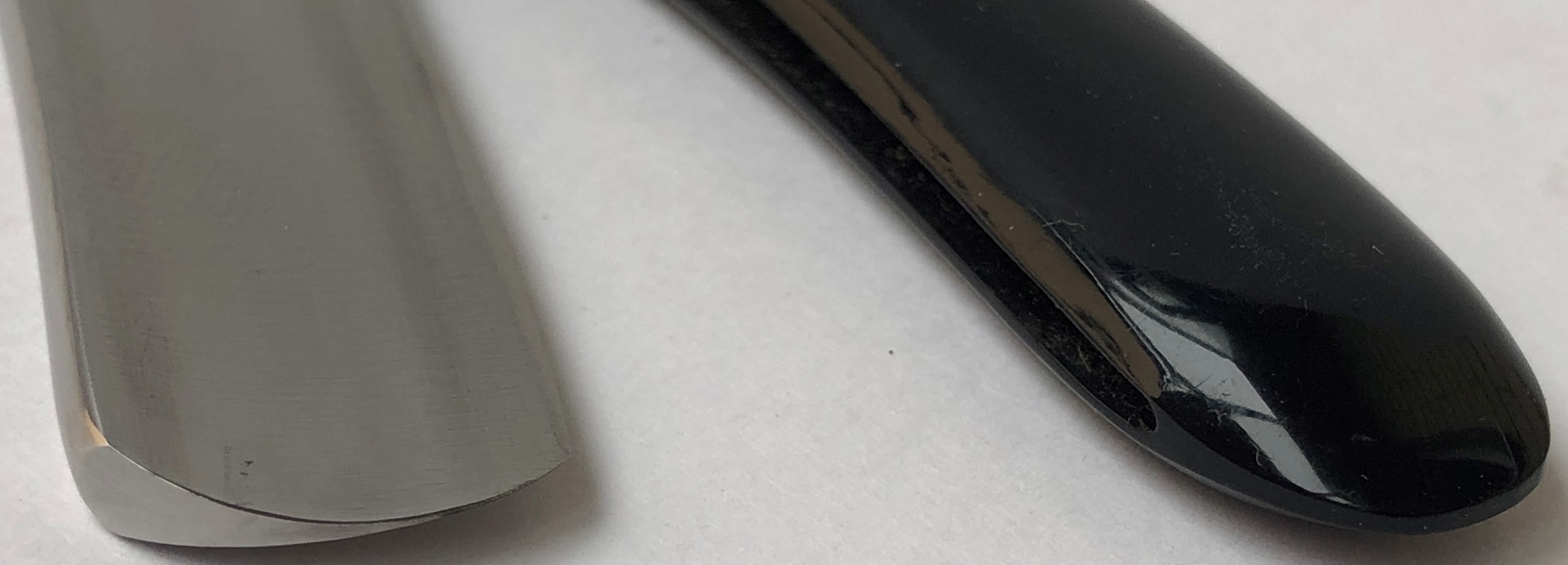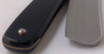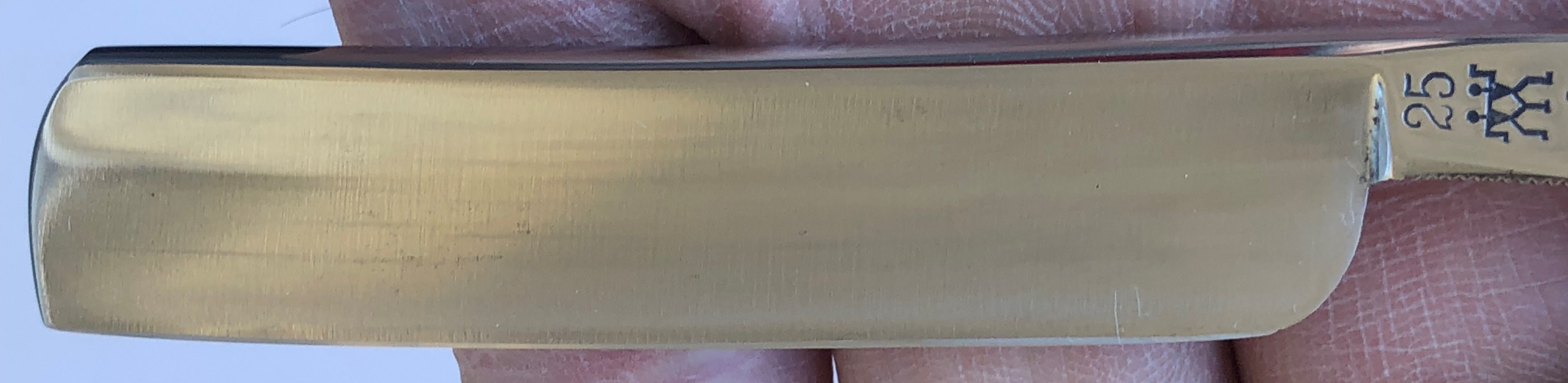 Бритва в пользовании не была.Клинок в идеальном состоянии.На самых тонких абразивах был освежен металл,с повторением "родного" гринда, а также умеренно отполирован.Оригинальную ручку заменил на эффектную оправу от японского послевоенного донора.В отличие от оригинала сейчас бритва смотрится намного интереснее.Само полотно чистое от разного рода видимых дефектов. Идеальная геометрия:кромочка равномерна по всей длине.Двух-цветные японские старинные пины, с добавлением внутренних шайб, для порядка.Отличный и недорогой вариант для новичка. Не пропустите.