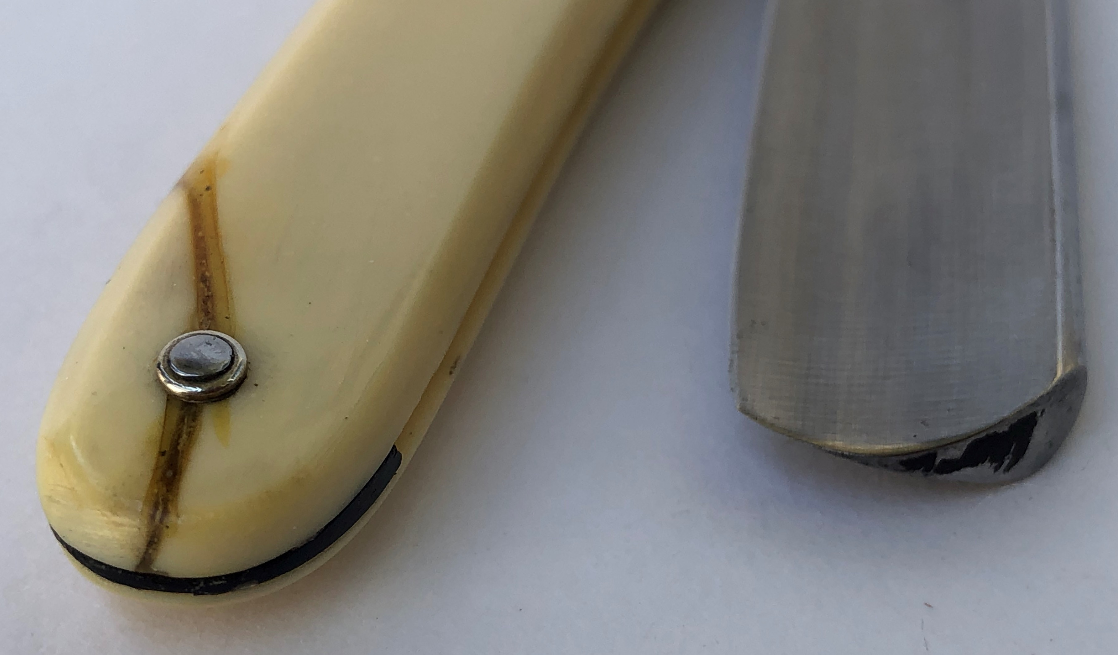 Кто бритву реставрировал и шлифовал полотно, мне не известно. По всей видимости бритва не разбиралась.Шлифовка аккуратная,кромочка ровненькая.Не стал ничего разбирать и чистить в районе осевого пина, но следы времени никоим образом не повлияют на процесс эксплуатации.