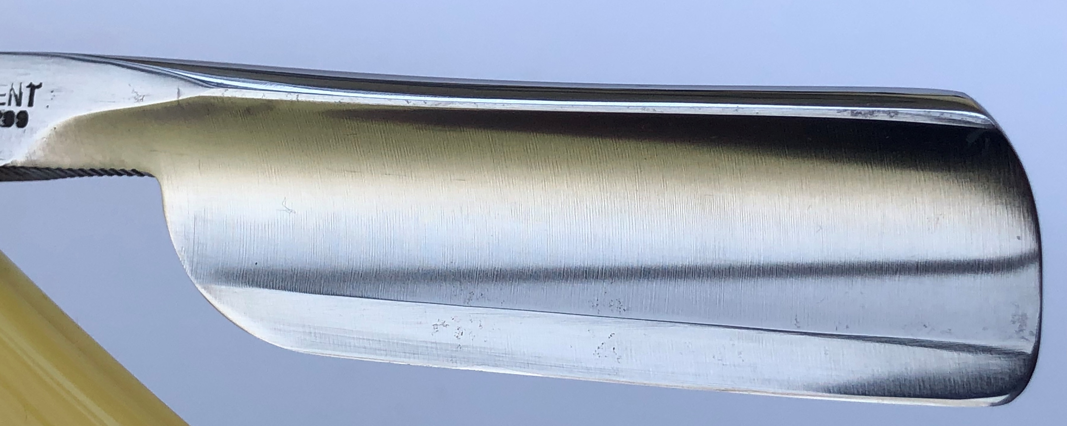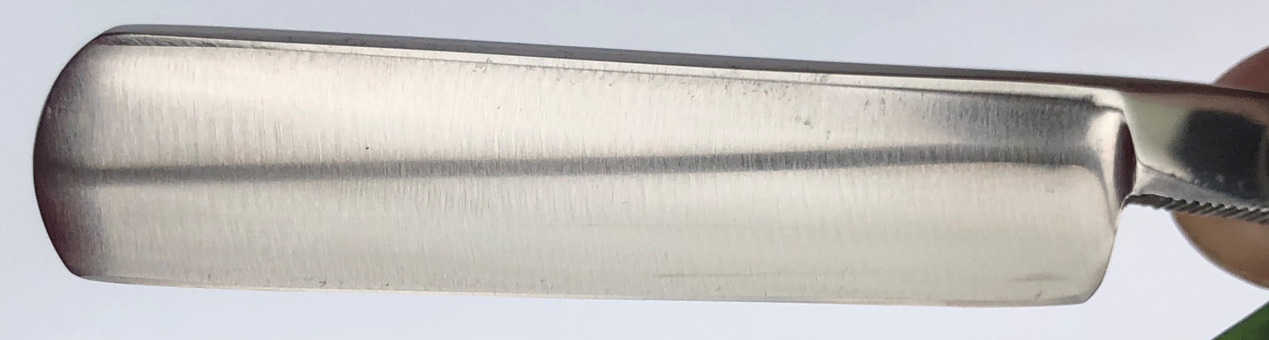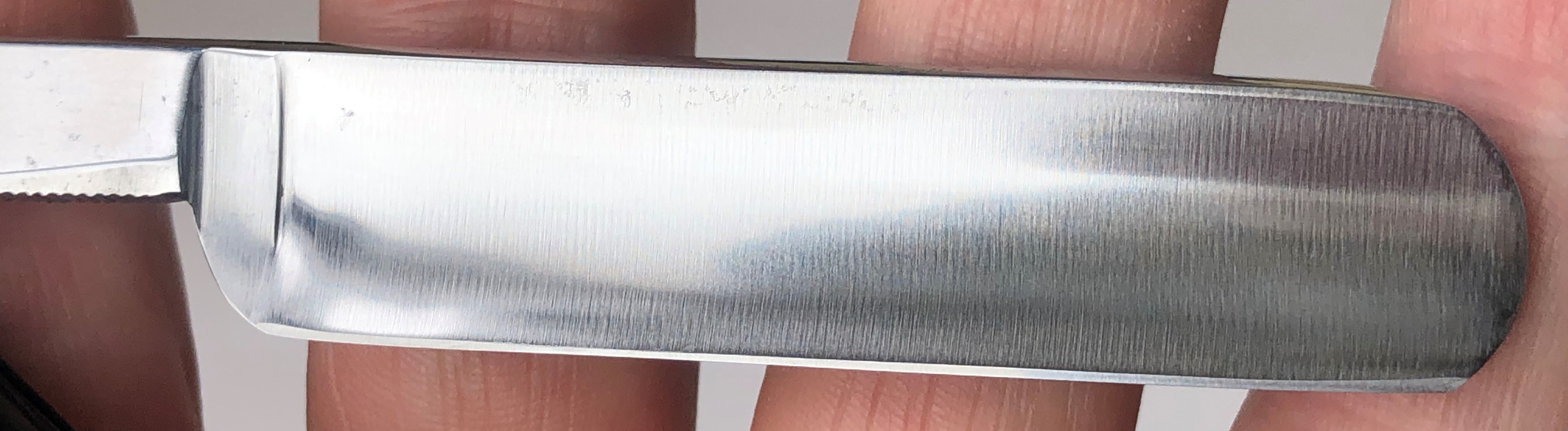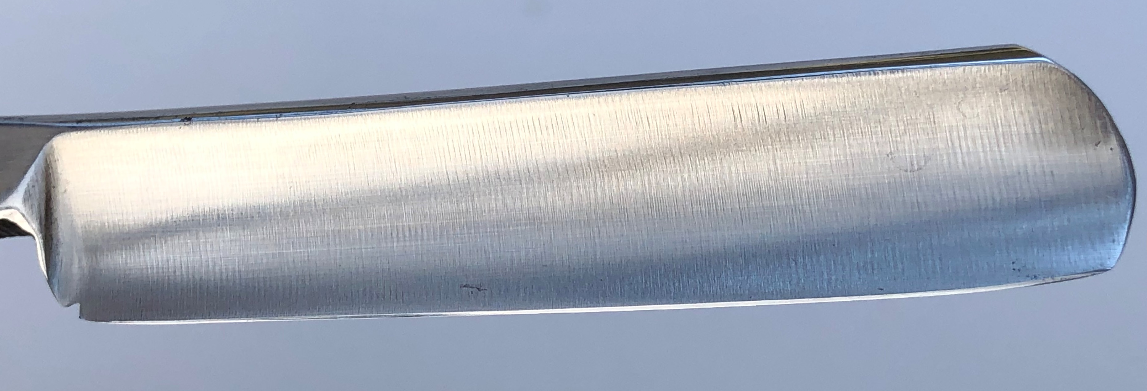 Само полотно на несколько мм укорочено.Было немного освежено от патины, с повторением "родного" характера шлифовки и умеренной полировки.Идеальная геометрия клинка. Сталь чистая, без видимых дефектов.Очень приятная во всех отношениях бритва, достаточно недорогая и если бы не укороченное полотно, то цены бы ей не было...