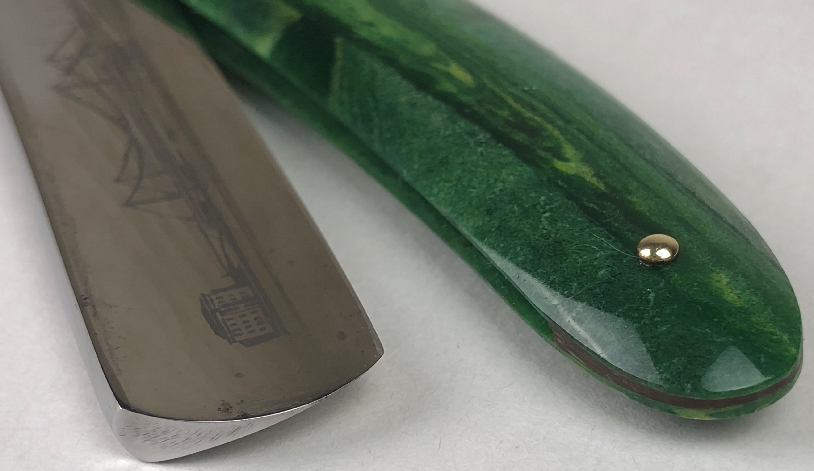 Бритва в прекрасном состоянии для своих лет.Следов от заточных камней на обушке не имеет, что может означать, что бритва или малопользованная, либо не была в употреблении вообще.Разобрал, чтобы немного освежить район осевого пина и сам клинок и снова собрал, с добавлением внутренних шайб и заменой пинов на двух-цветные втулки.Как обычно в таких случаях, стараюсь оставить шикарную патину на эрле, идущую на контрасте с чистым полотном.