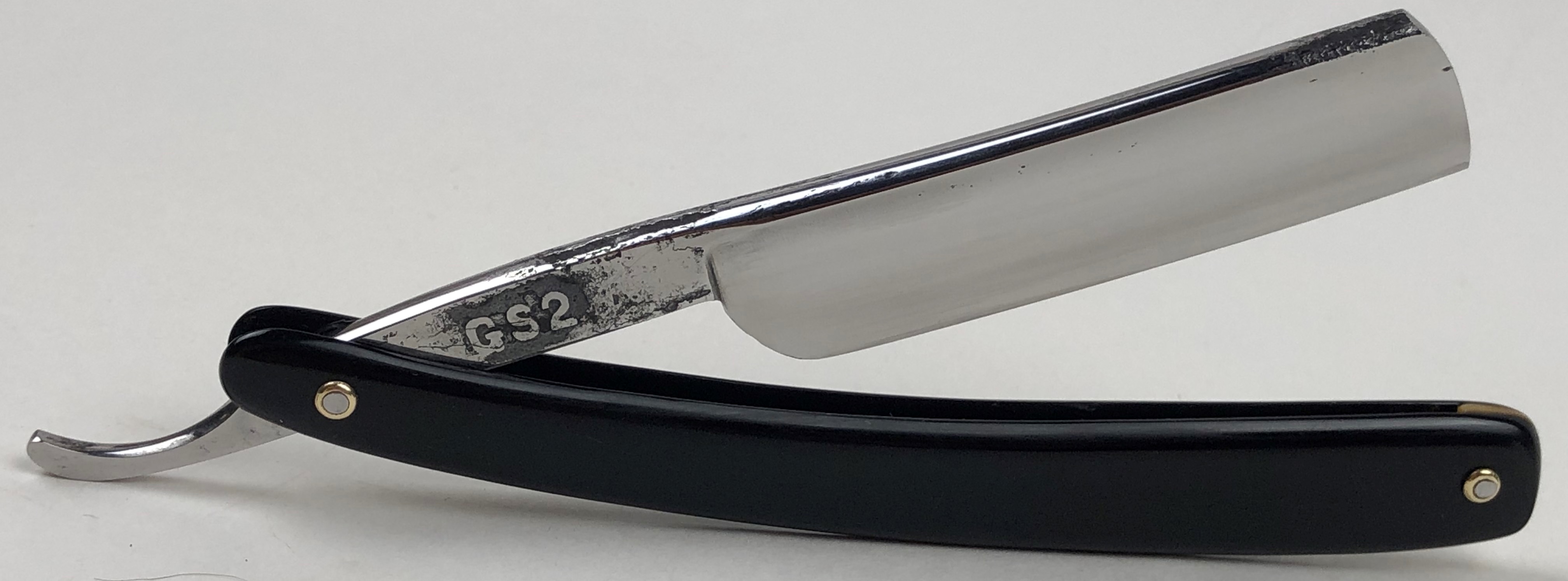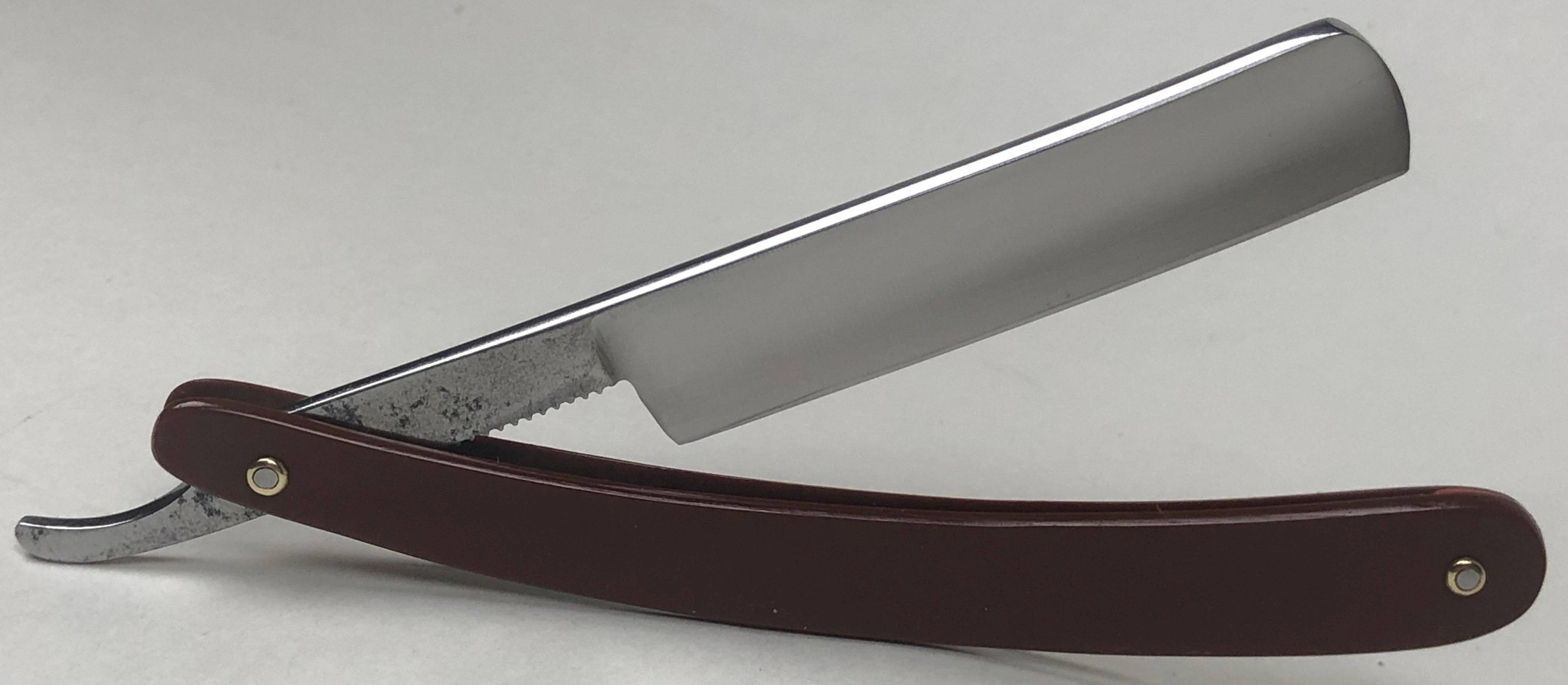 Бритва в очень хорошем состоянии. Немного откорректировал утОчку обушка и умеренно отполировал клинок.Поменял пины на двух-цветные втулки и добавил внутренние шайбы.Идеальная геометрия:кромка ровненькая по всей длине полотна.Тяжёлая.Заточена и готова к бритью.