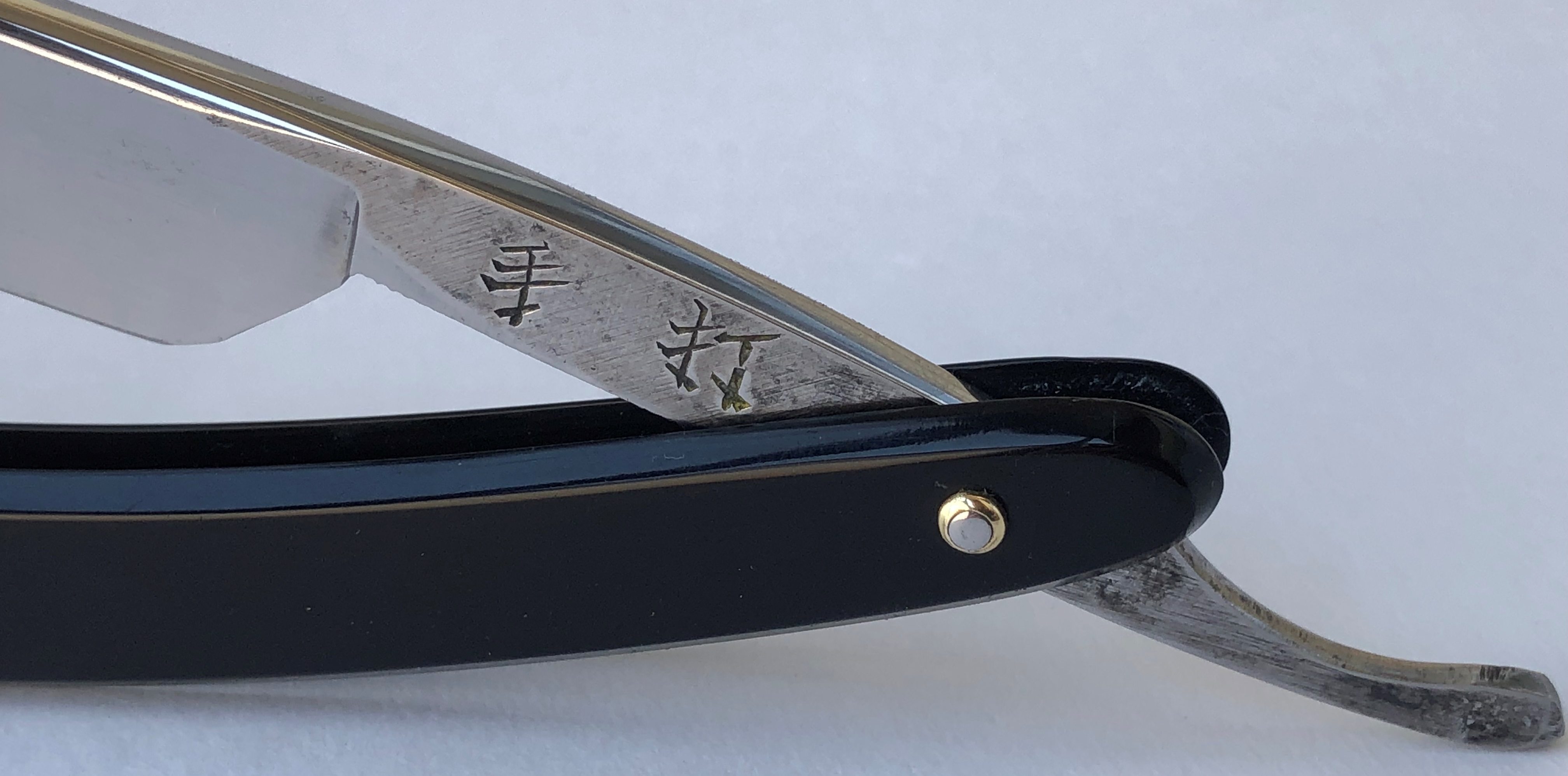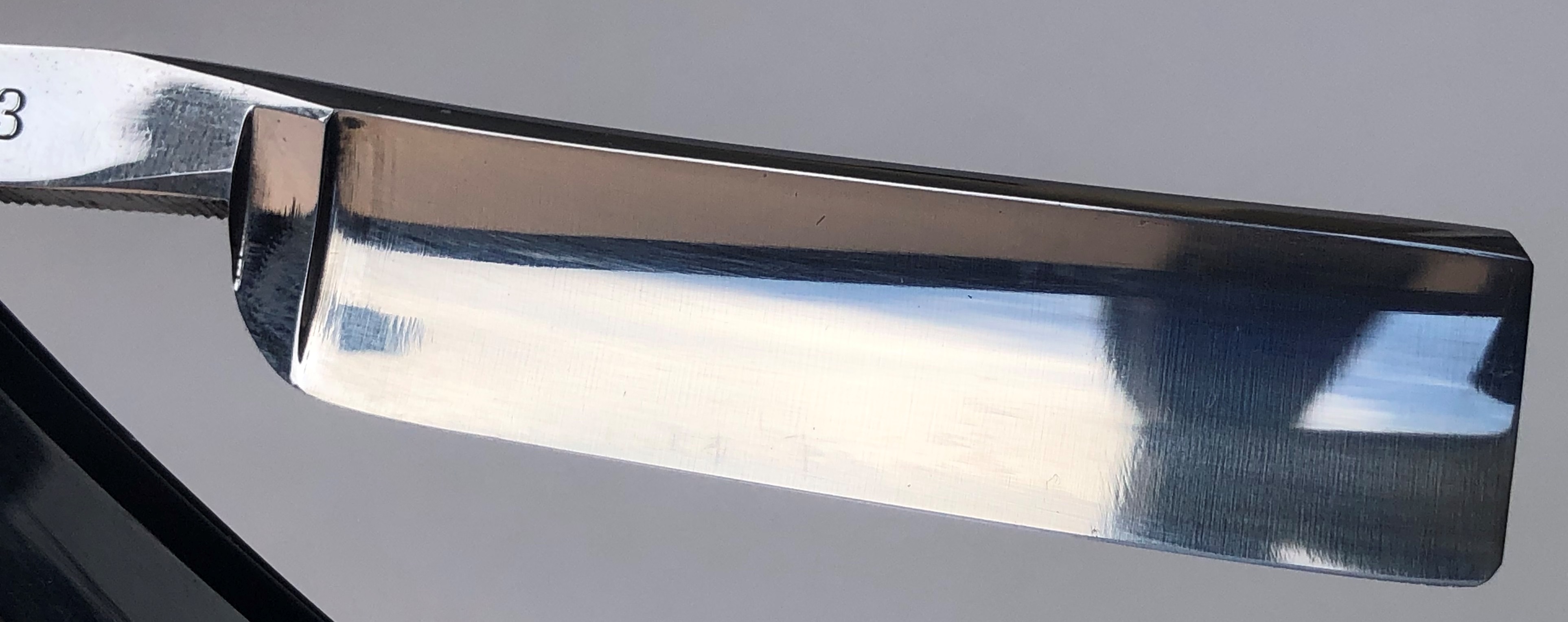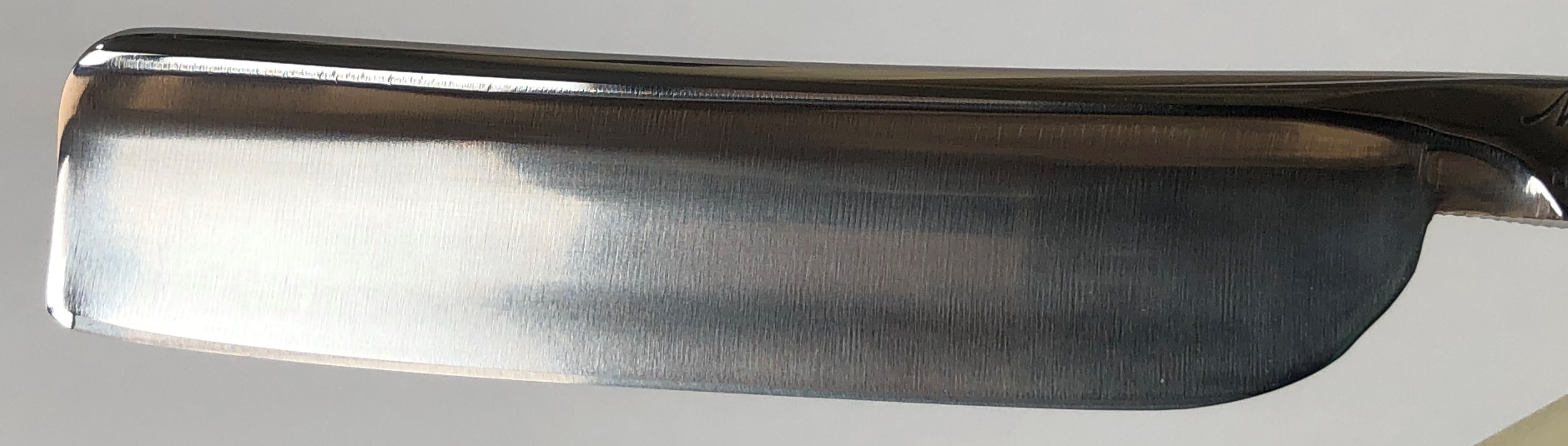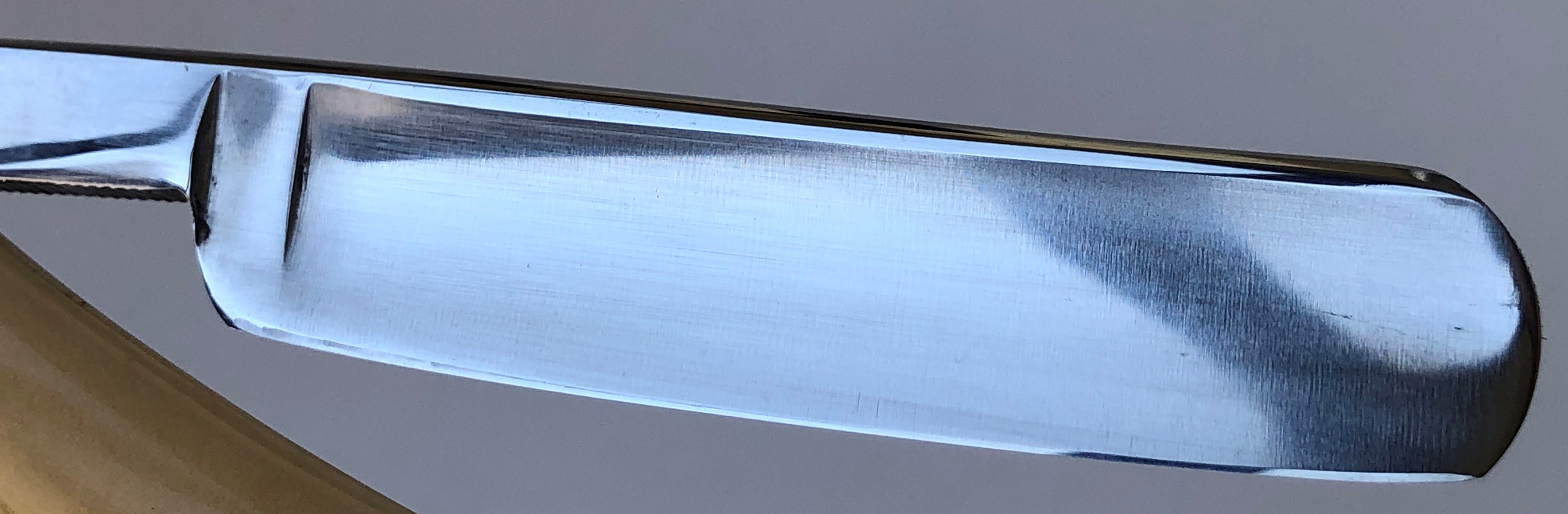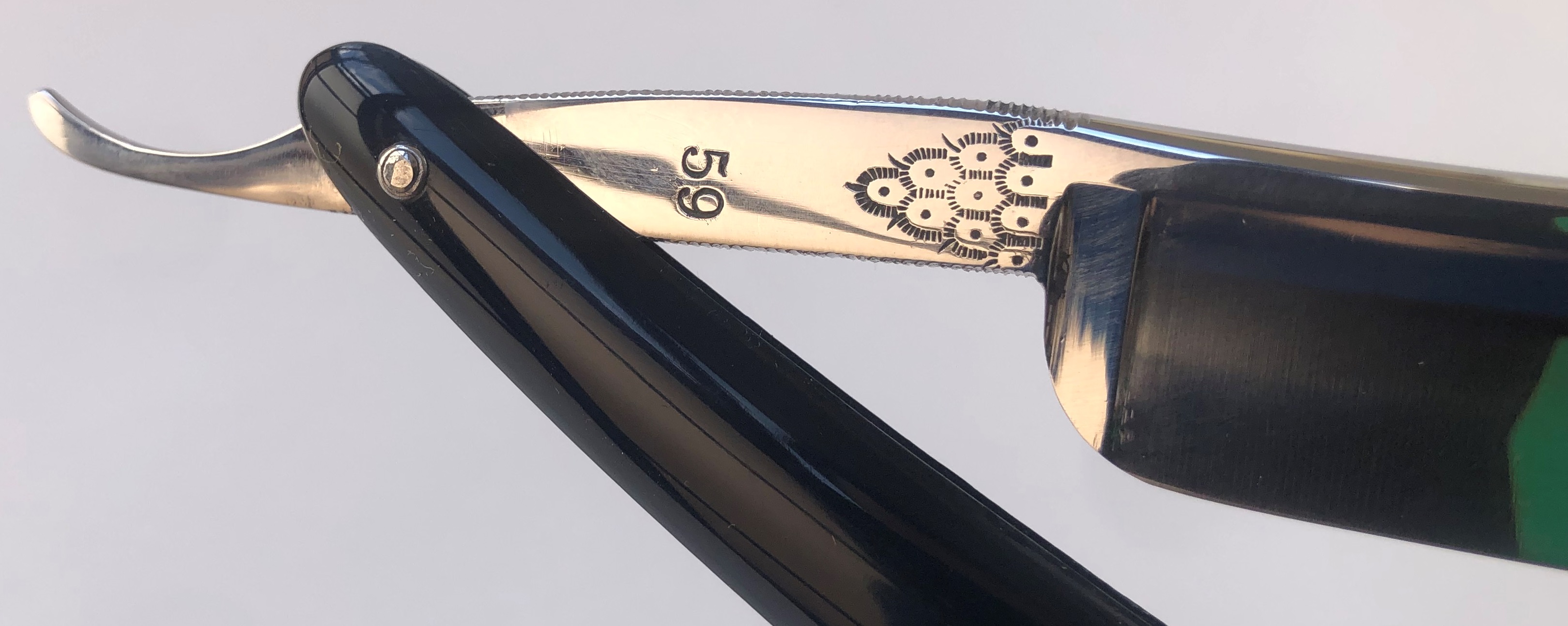Бритва прибыла из Японии, но на японку совершенно не похожа. По всей видимости все таки немецкая.Лицевая сторона оригинальная, тут ничего не делал. Обратную сторону немного освежил от царапин и патины. Осевой перебрал , добавил внутренние шайбы и заново установил родной пин.Эффектный ажурный обушок,редко когда представленный на опасных бритвах. Идеальная геометрия полотна:кромочка равномерна по всей длине.Тяжёлая, с неплохой сталью и во целом красивая бритва. Будет заточена и подготовлена к бритью.