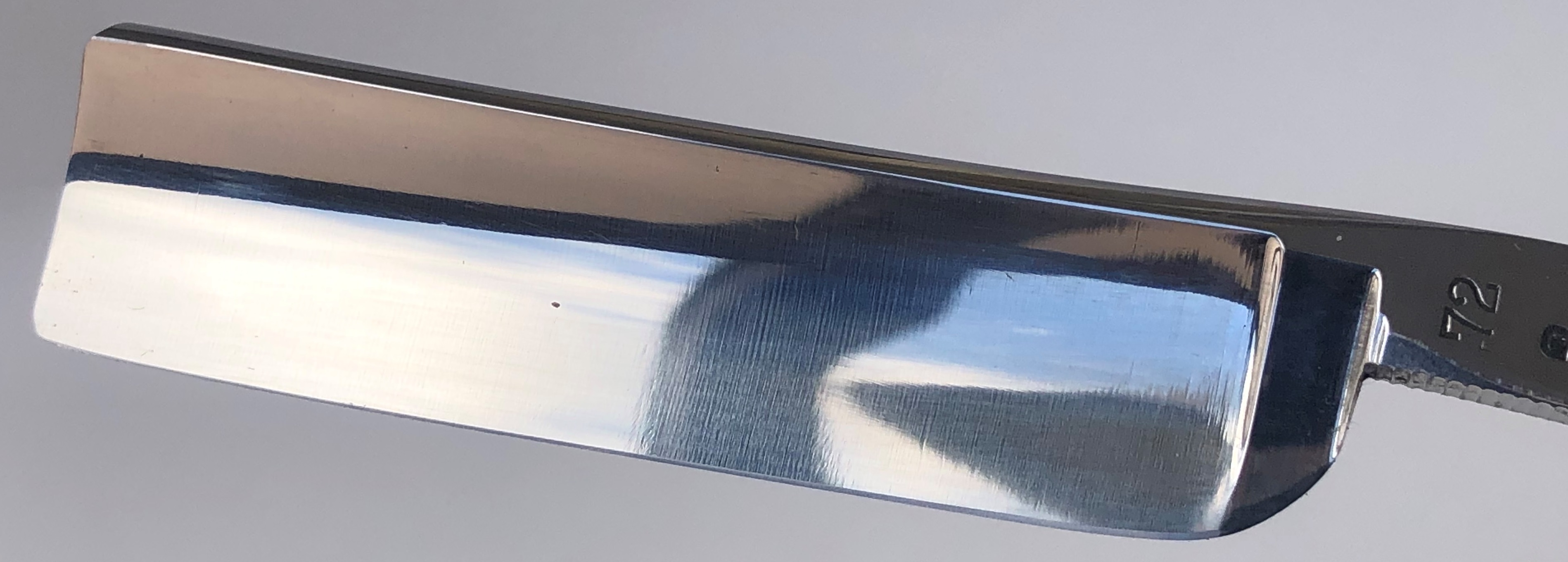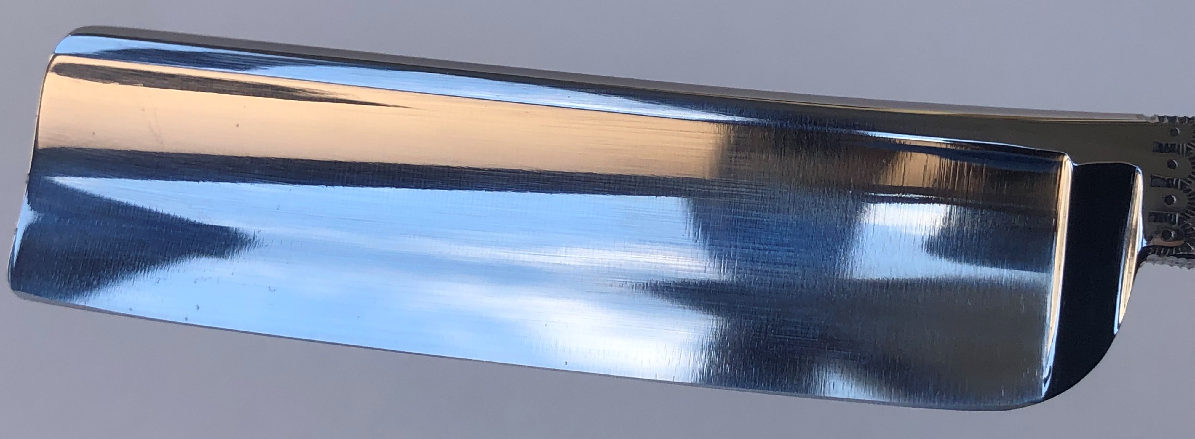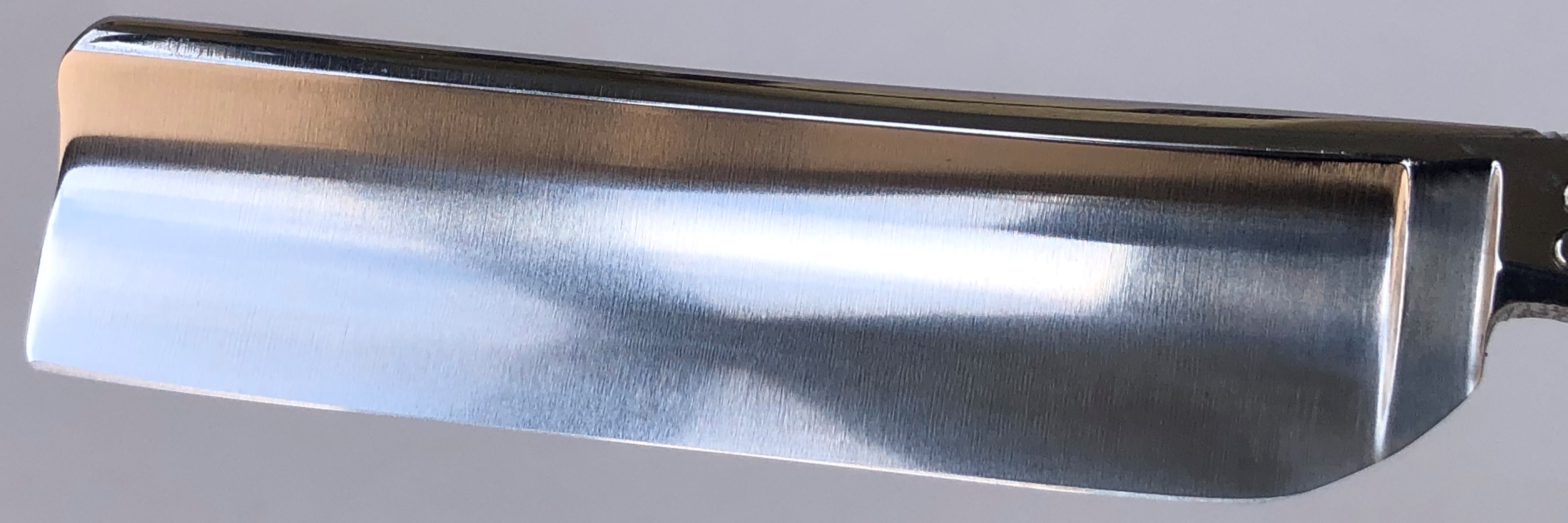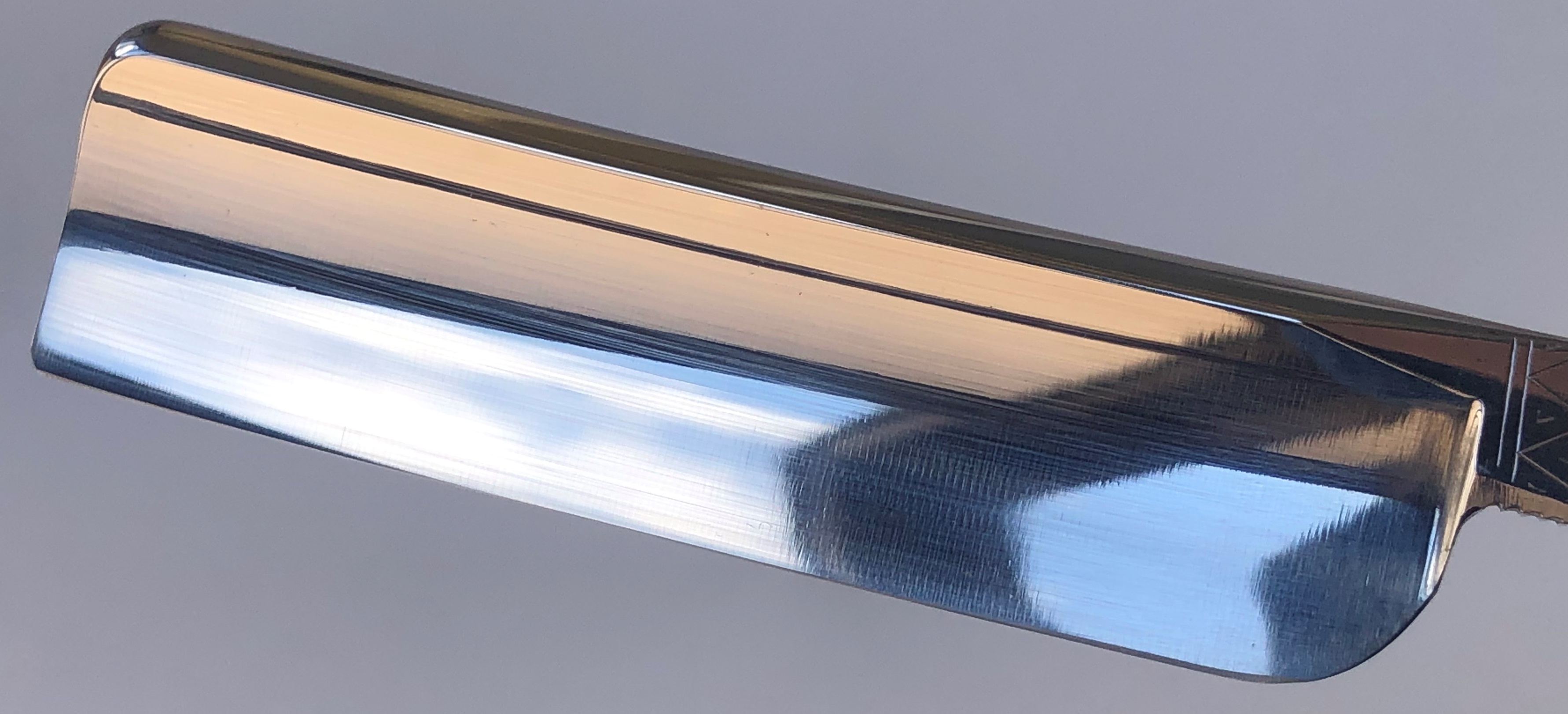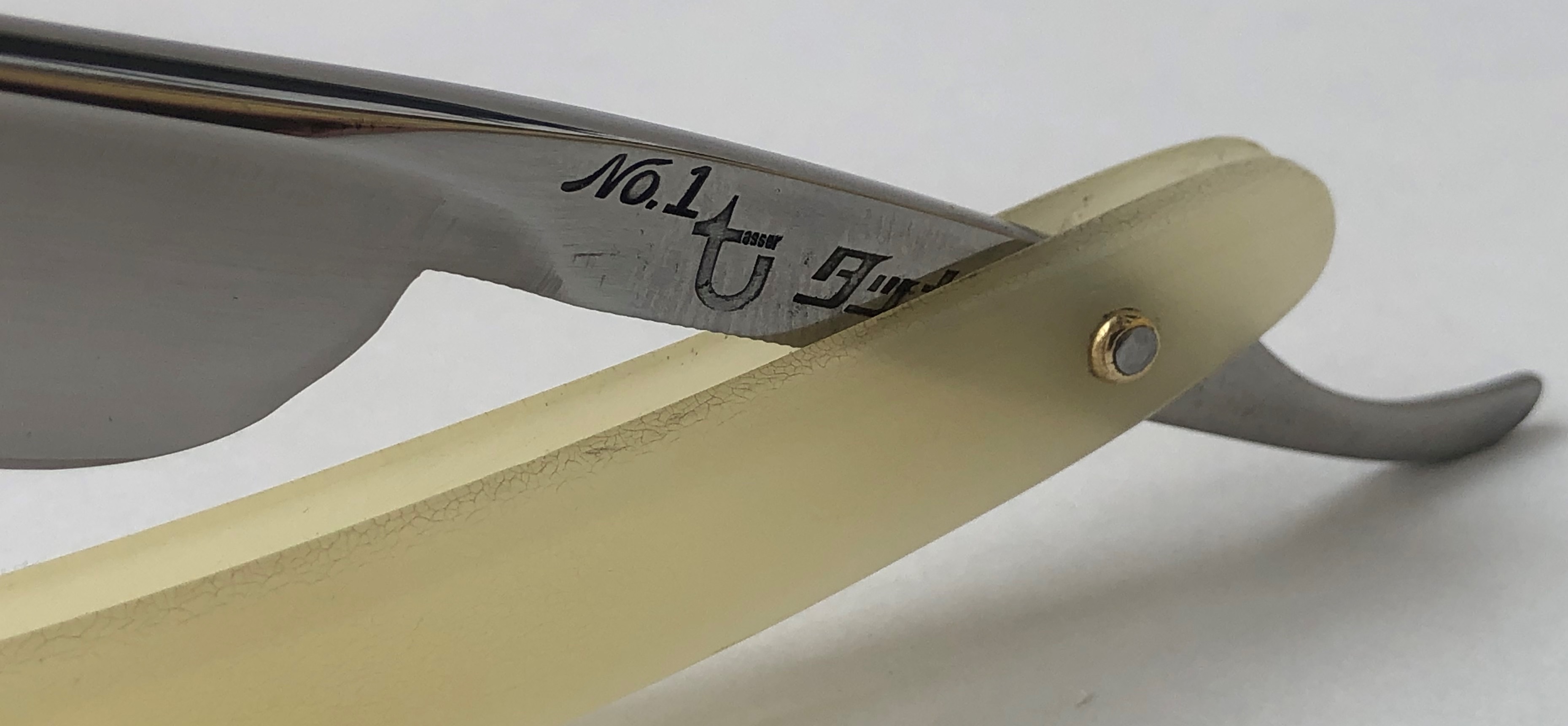 Бритва прибыла из Японии, но на японку совершенно не похожа. По всей видимости все таки немецкая.Лицевая сторона оригинальная, тут ничего не делал. Обратную сторону немного освежил от царапин и патины. Осевой перебрал , добавил внутренние шайбы и заново установил родной пин.Эффектный ажурный обушок,редко когда представленный на опасных бритвах. Идеальная геометрия полотна:кромочка равномерна по всей длине.Тяжёлая, с неплохой сталью и во целом красивая бритва. Будет заточена и подготовлена к бритью.