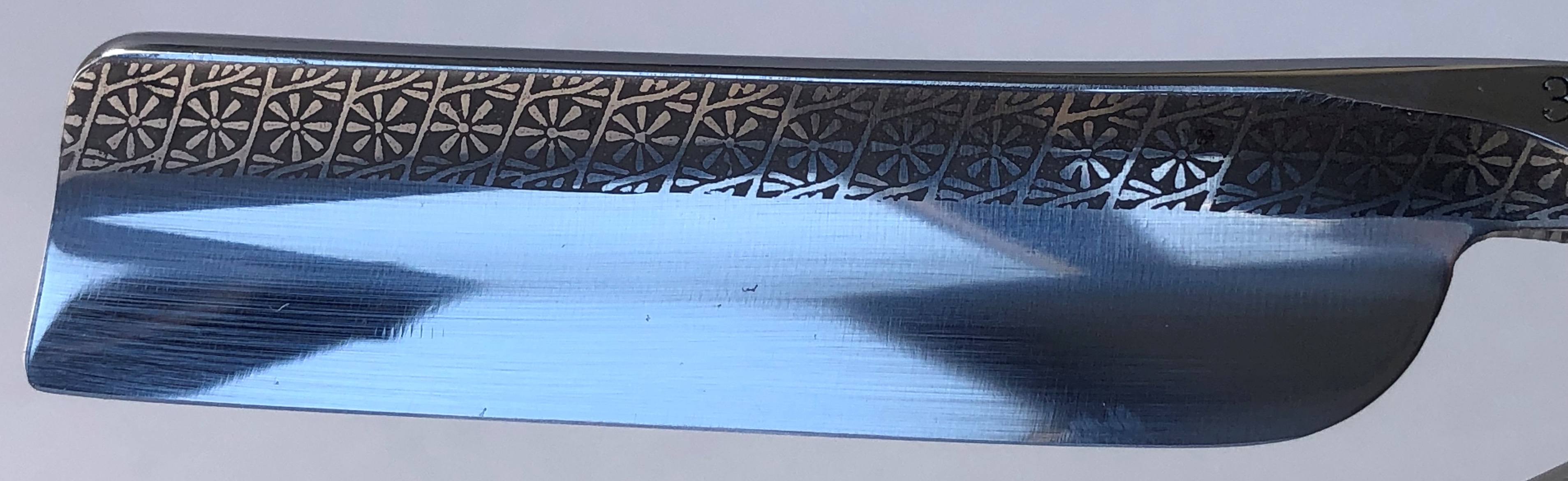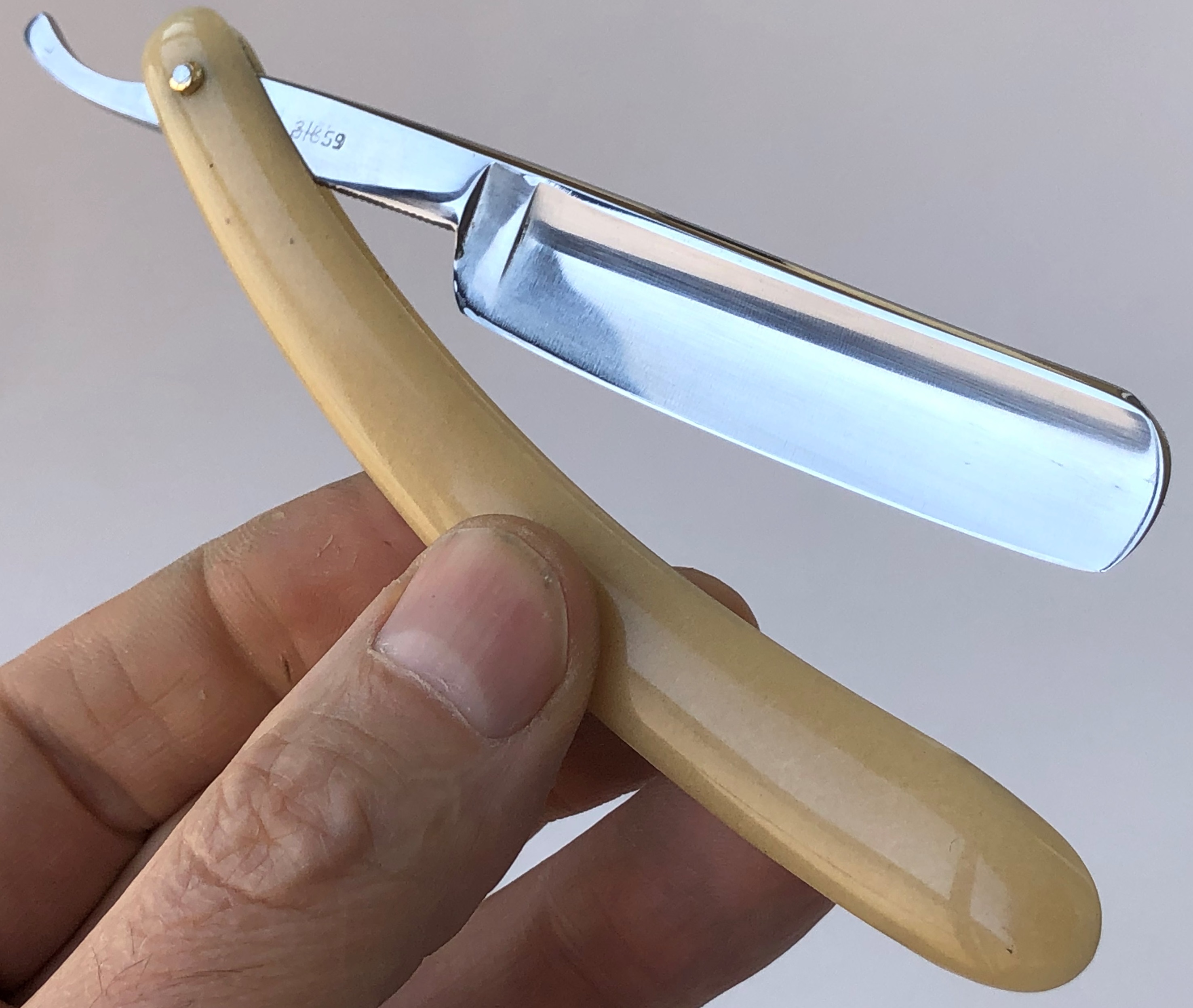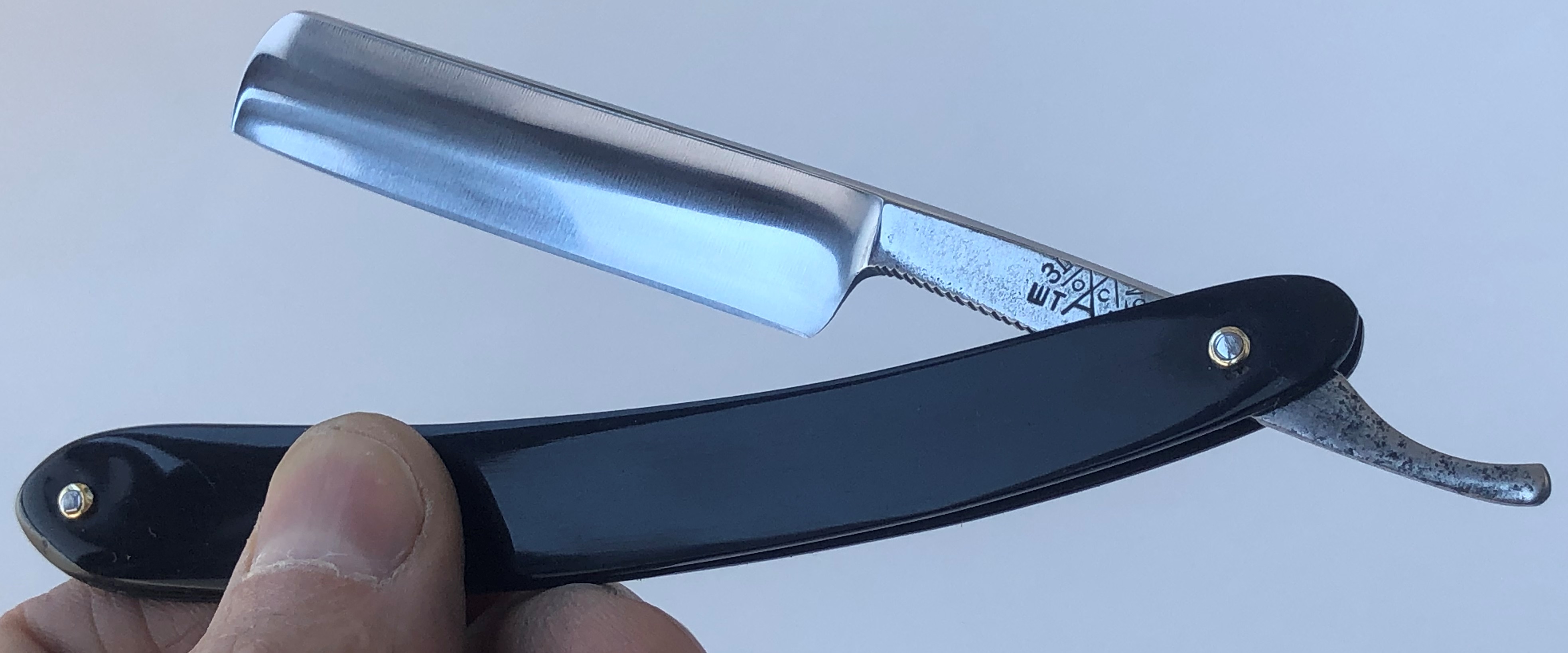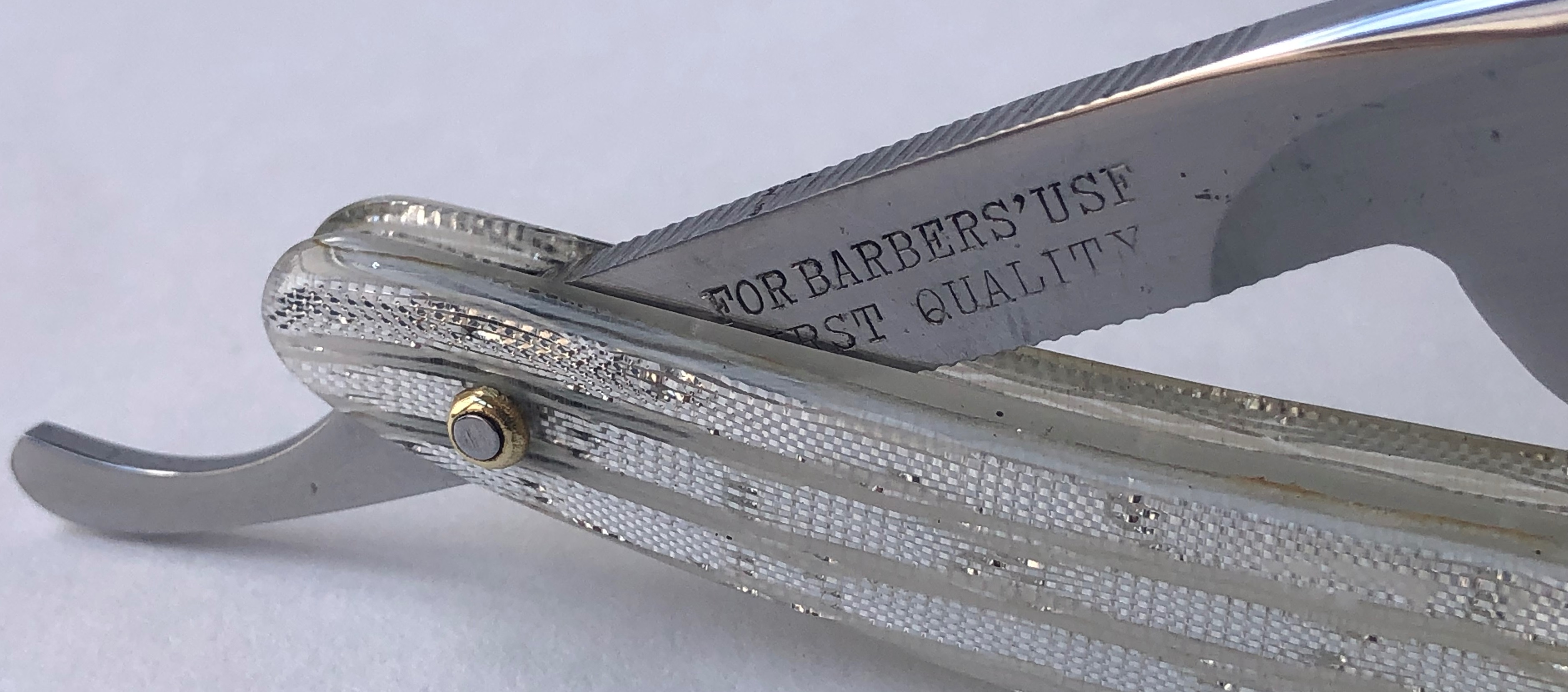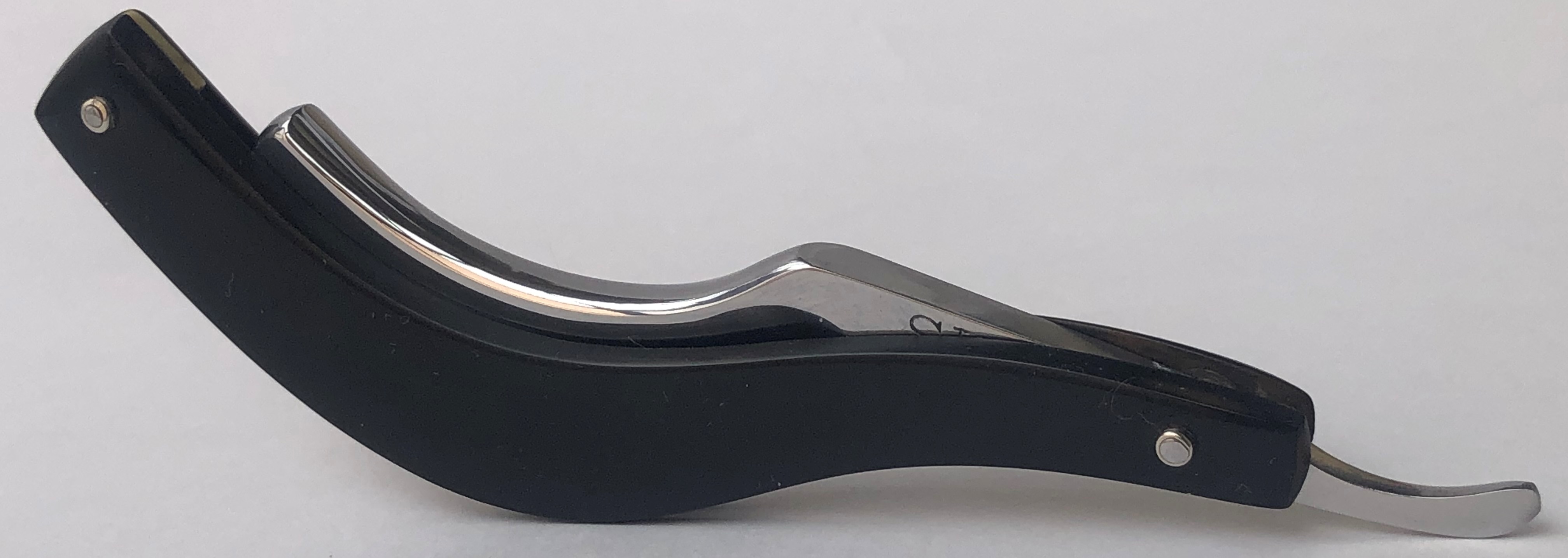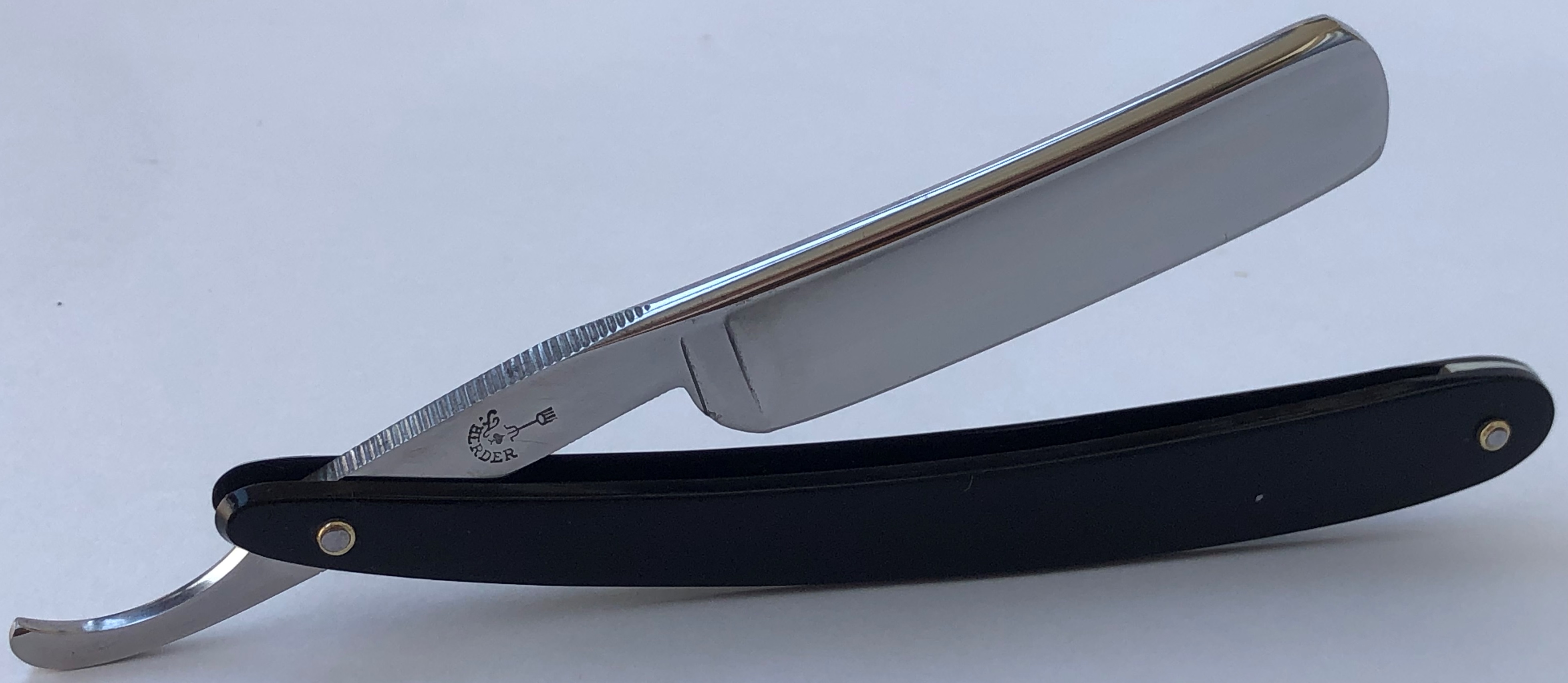 Бритва прибыла из Японии, но на японку совершенно не похожа. По всей видимости все таки немецкая.Лицевая сторона оригинальная, тут ничего не делал. Обратную сторону немного освежил от царапин и патины. Осевой перебрал , добавил внутренние шайбы и заново установил родной пин.Эффектный ажурный обушок,редко когда представленный на опасных бритвах. Идеальная геометрия полотна:кромочка равномерна по всей длине.Тяжёлая, с неплохой сталью и во целом красивая бритва. Будет заточена и подготовлена к бритью.