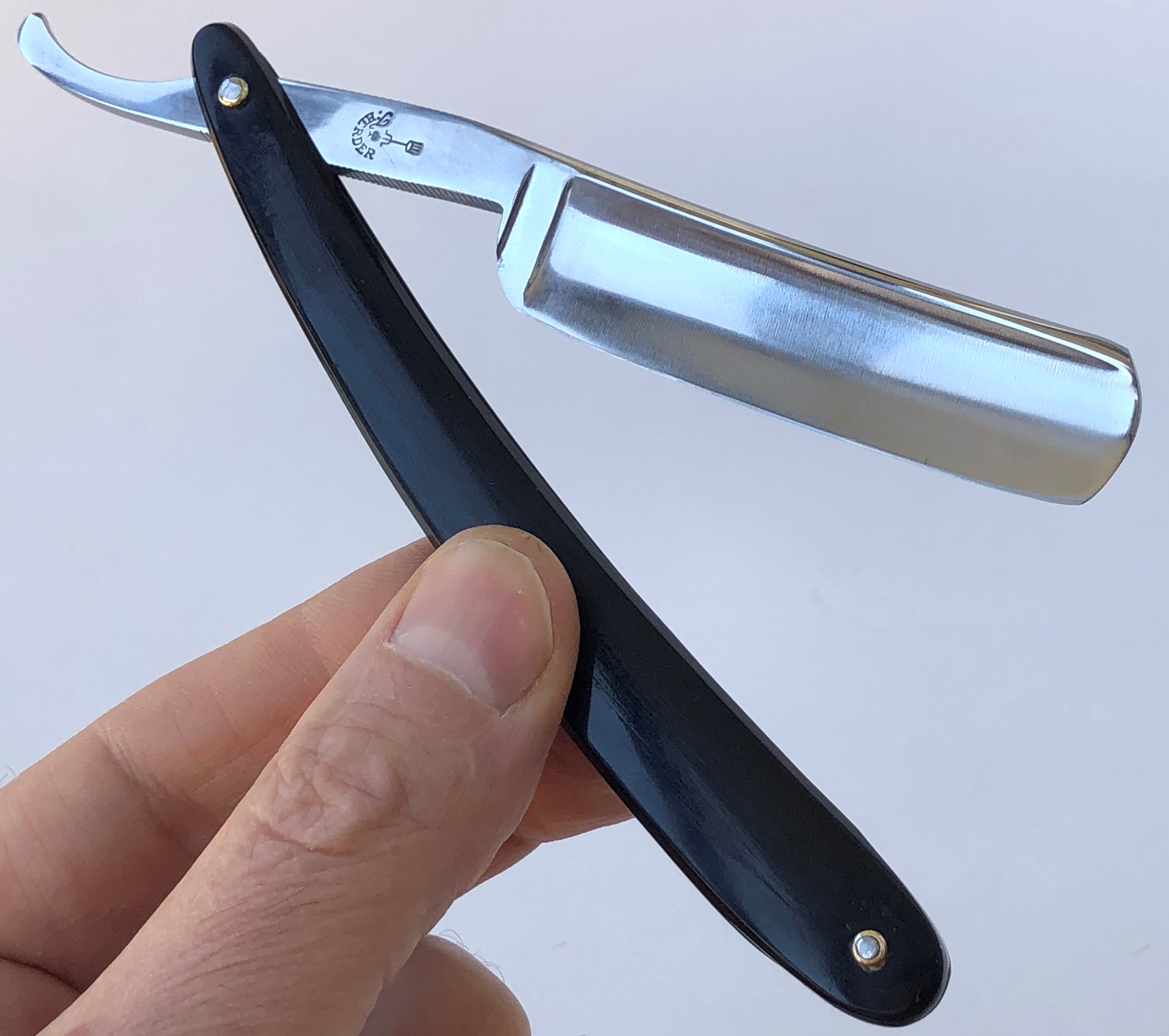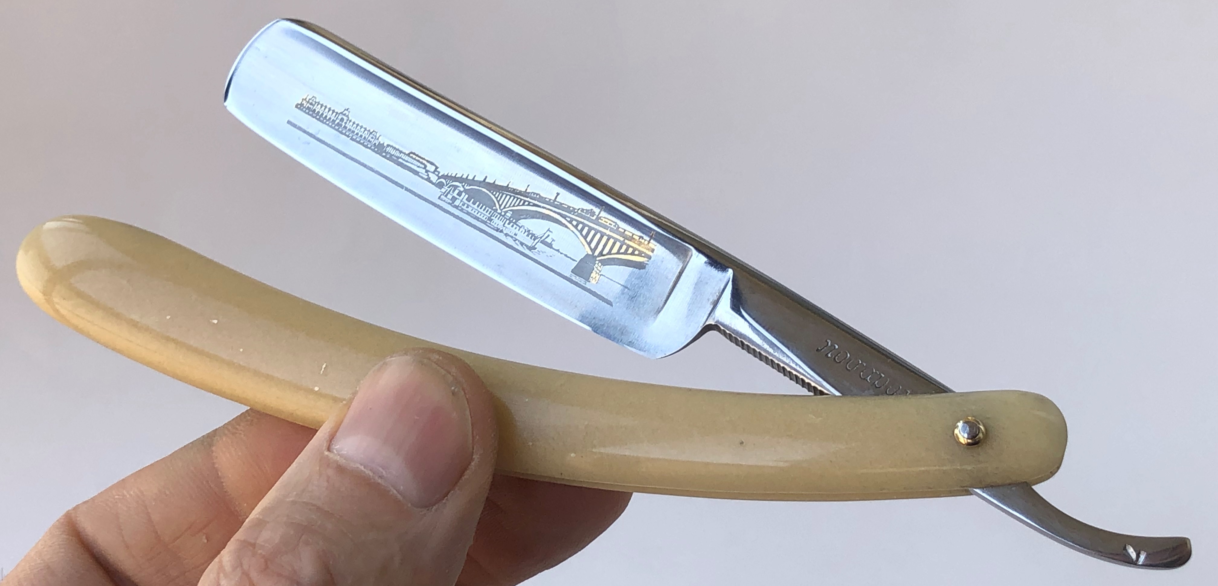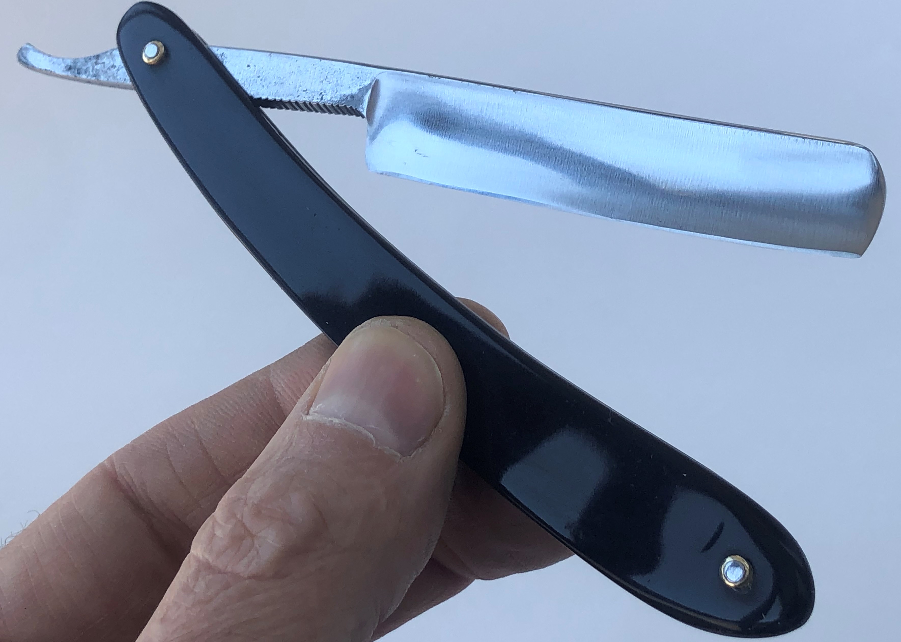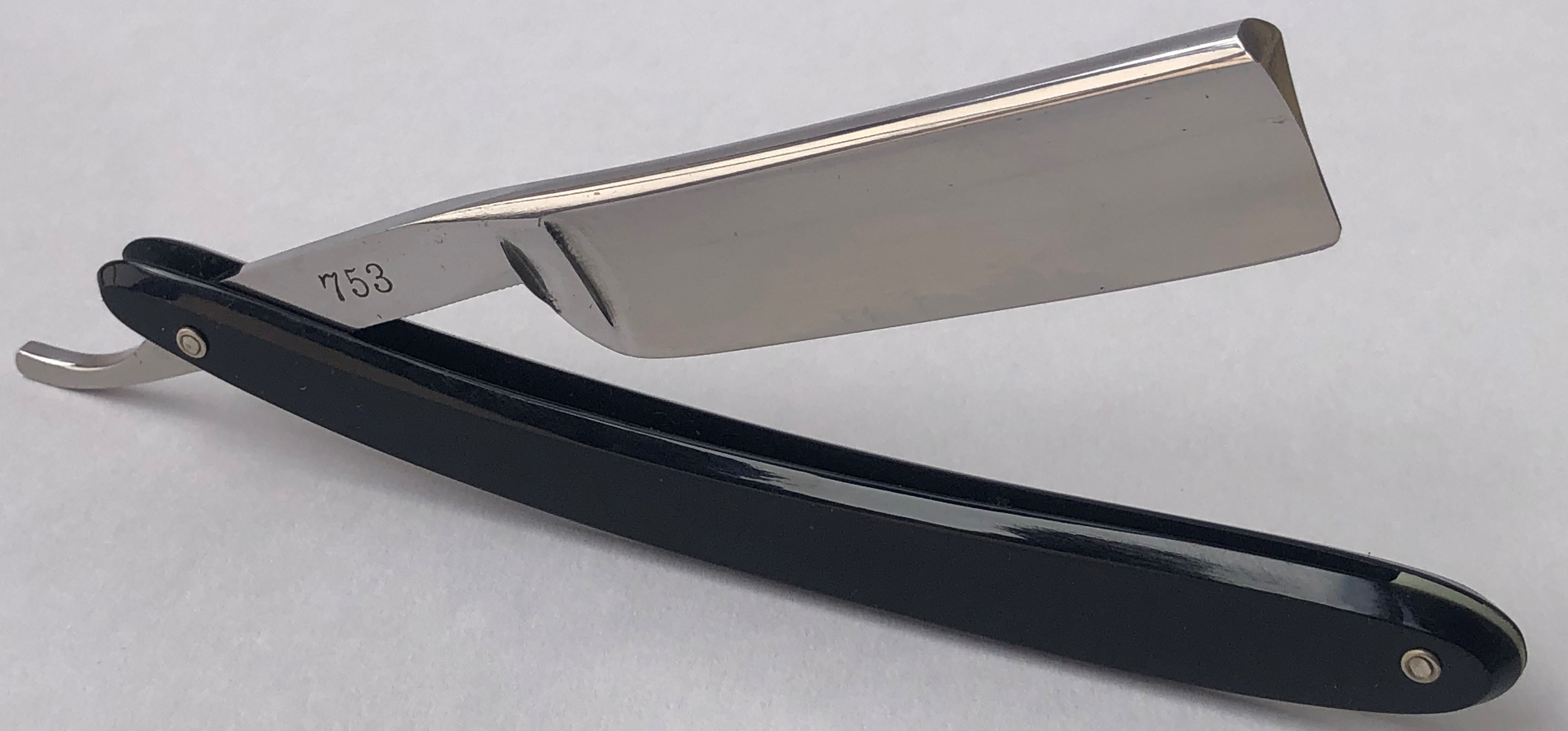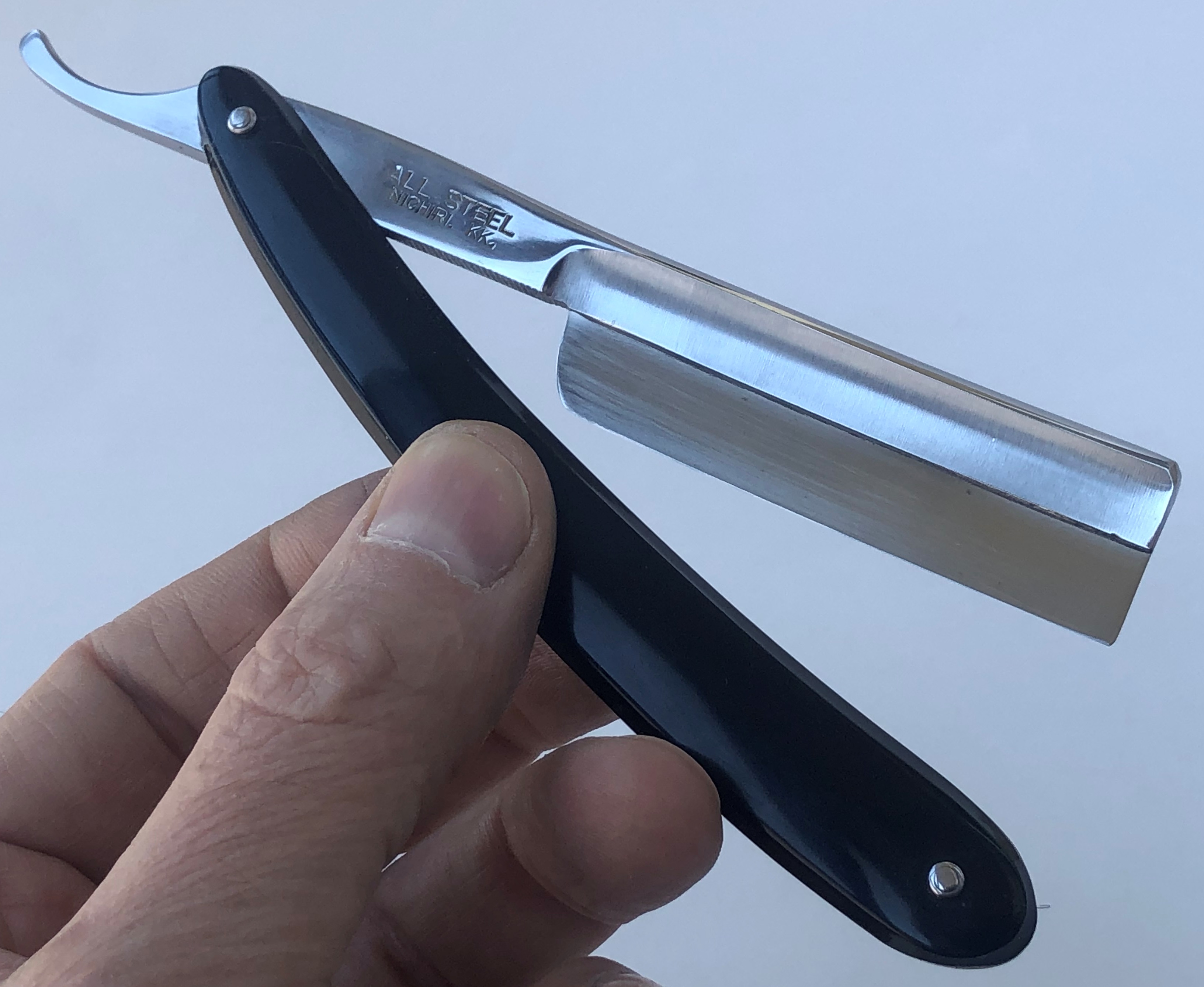 Бритва прибыла из Японии, но на японку совершенно не похожа. По всей видимости все таки немецкая.Лицевая сторона оригинальная, тут ничего не делал. Обратную сторону немного освежил от царапин и патины. Осевой перебрал , добавил внутренние шайбы и заново установил родной пин.Эффектный ажурный обушок,редко когда представленный на опасных бритвах. Идеальная геометрия полотна:кромочка равномерна по всей длине.Тяжёлая, с неплохой сталью и во целом красивая бритва. Будет заточена и подготовлена к бритью.