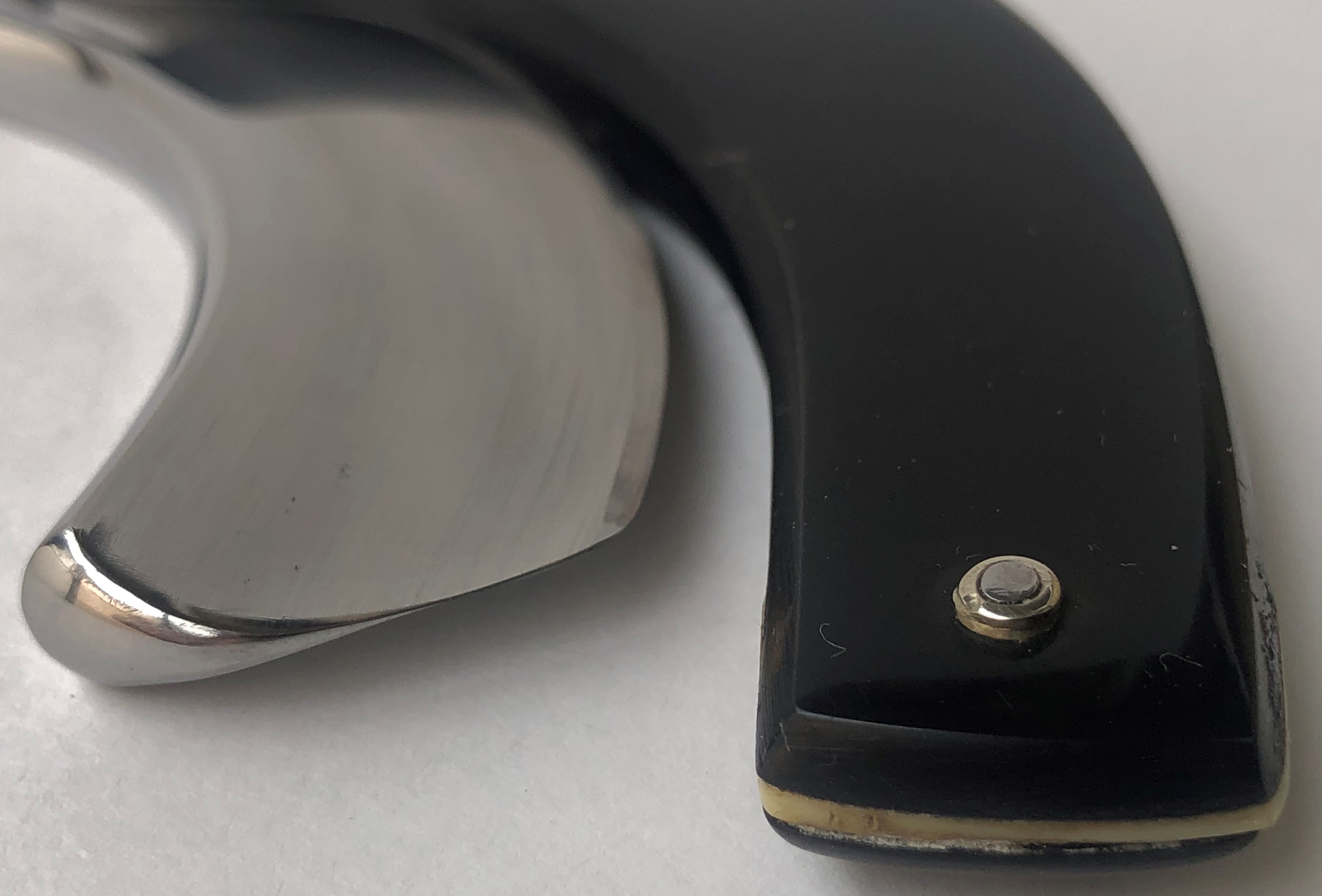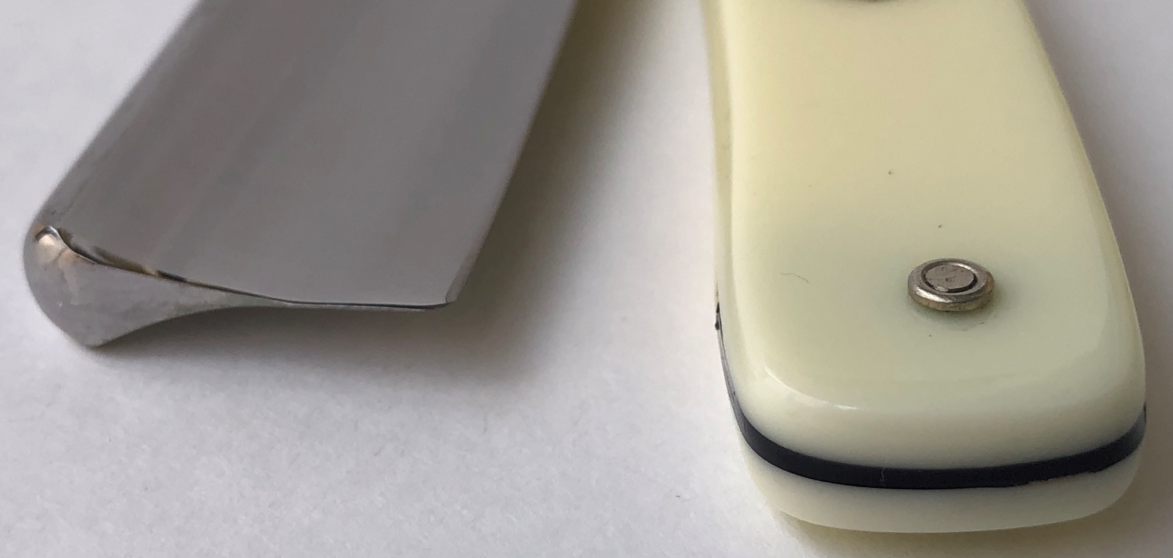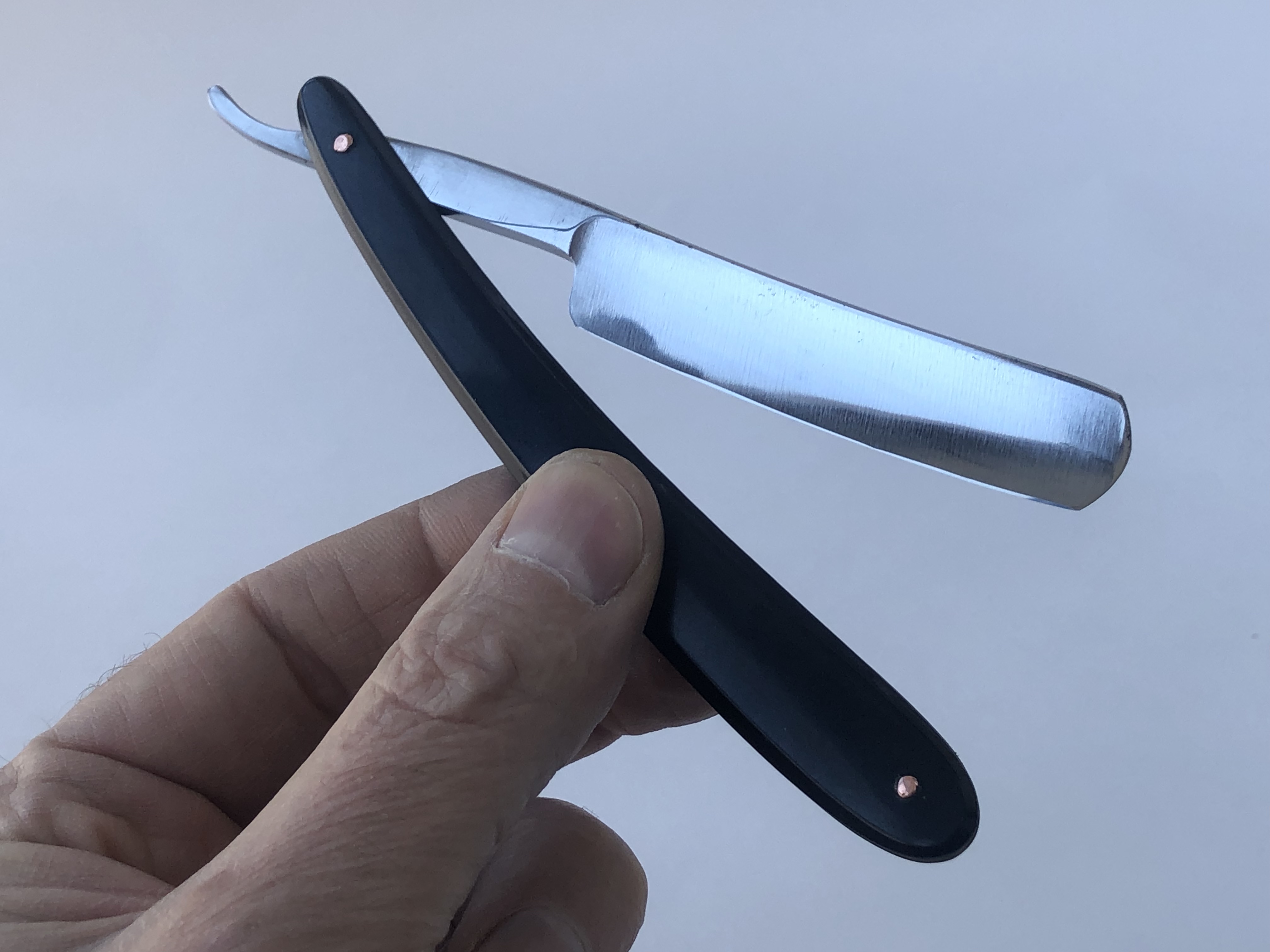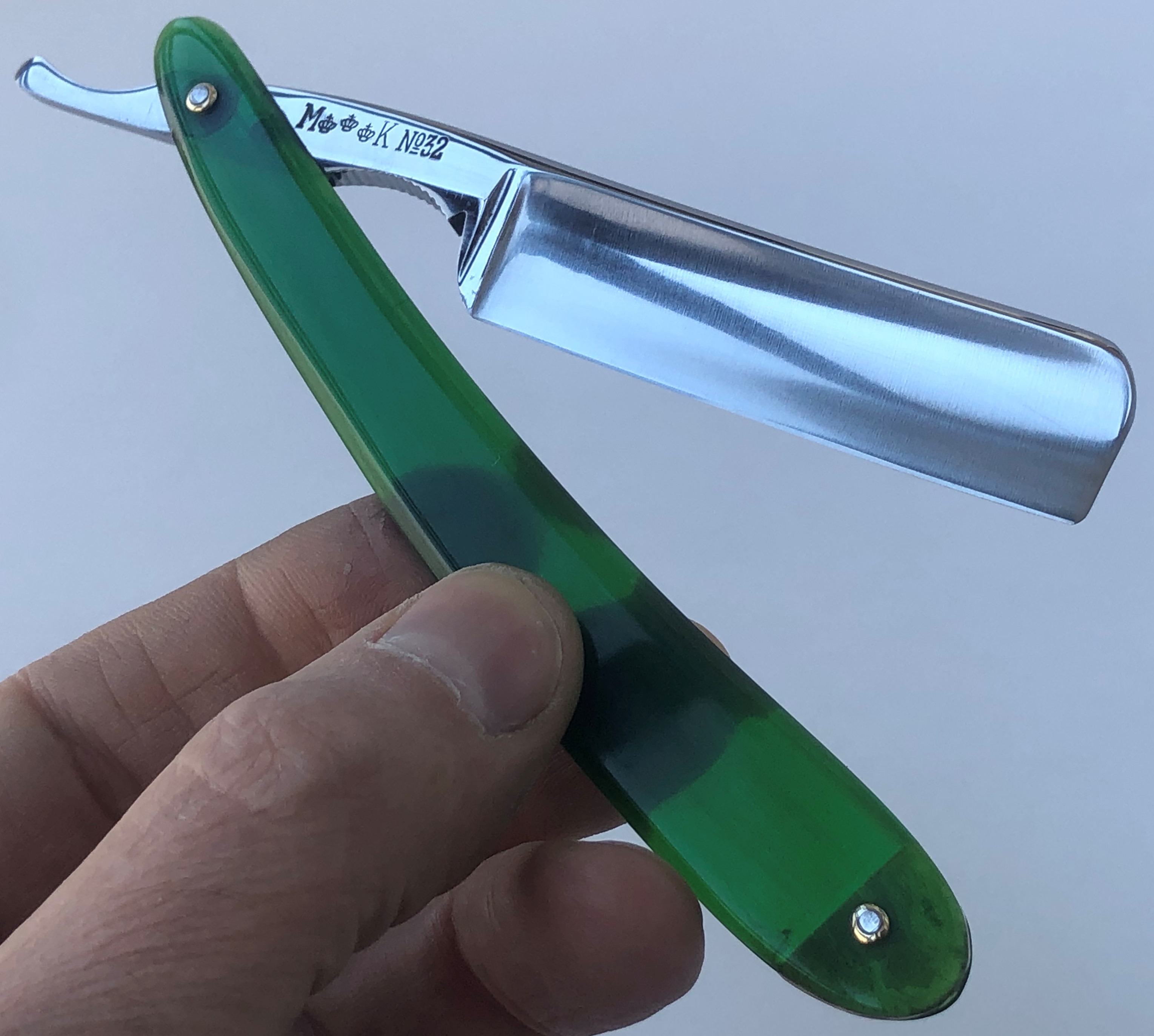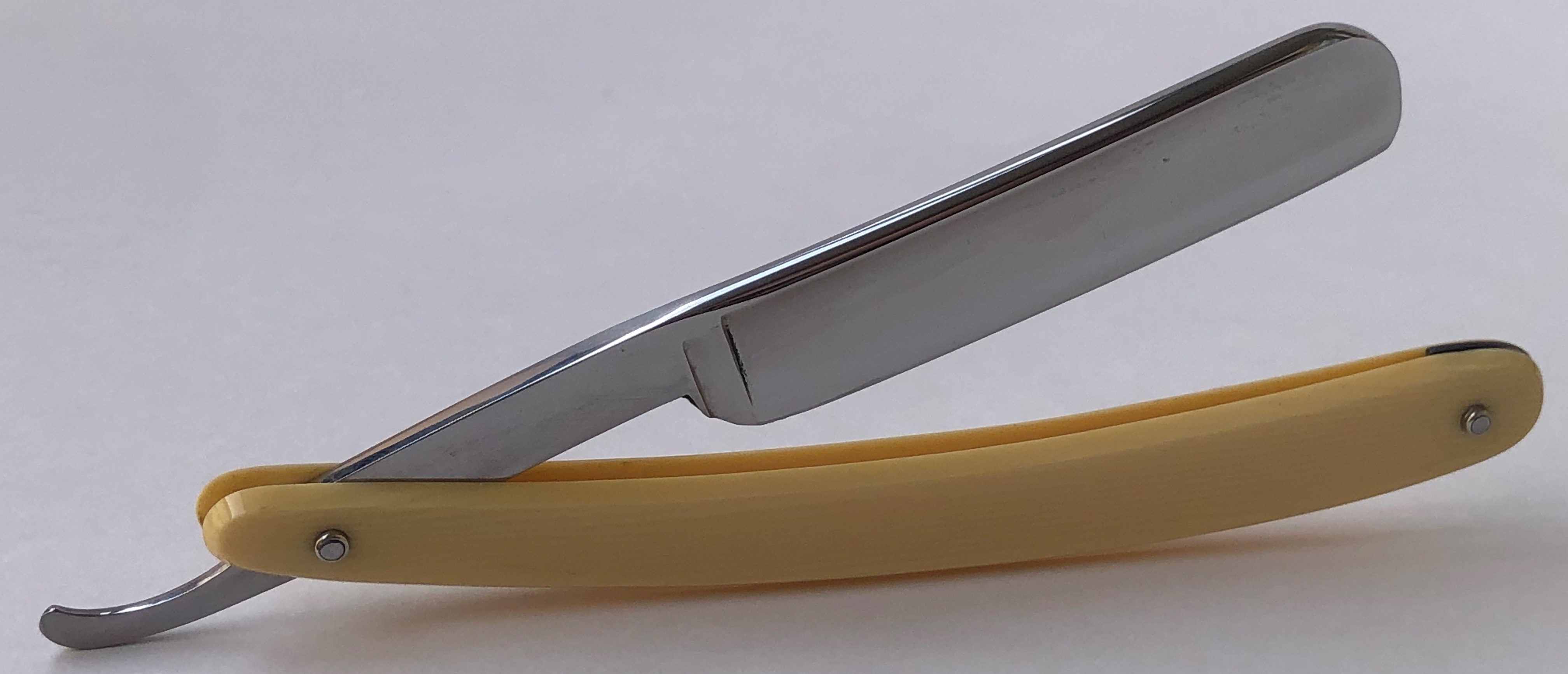 Бритва прибыла из Японии, но на японку совершенно не похожа. По всей видимости все таки немецкая.Лицевая сторона оригинальная, тут ничего не делал. Обратную сторону немного освежил от царапин и патины. Осевой перебрал , добавил внутренние шайбы и заново установил родной пин.Эффектный ажурный обушок,редко когда представленный на опасных бритвах. Идеальная геометрия полотна:кромочка равномерна по всей длине.Тяжёлая, с неплохой сталью и во целом красивая бритва. Будет заточена и подготовлена к бритью.