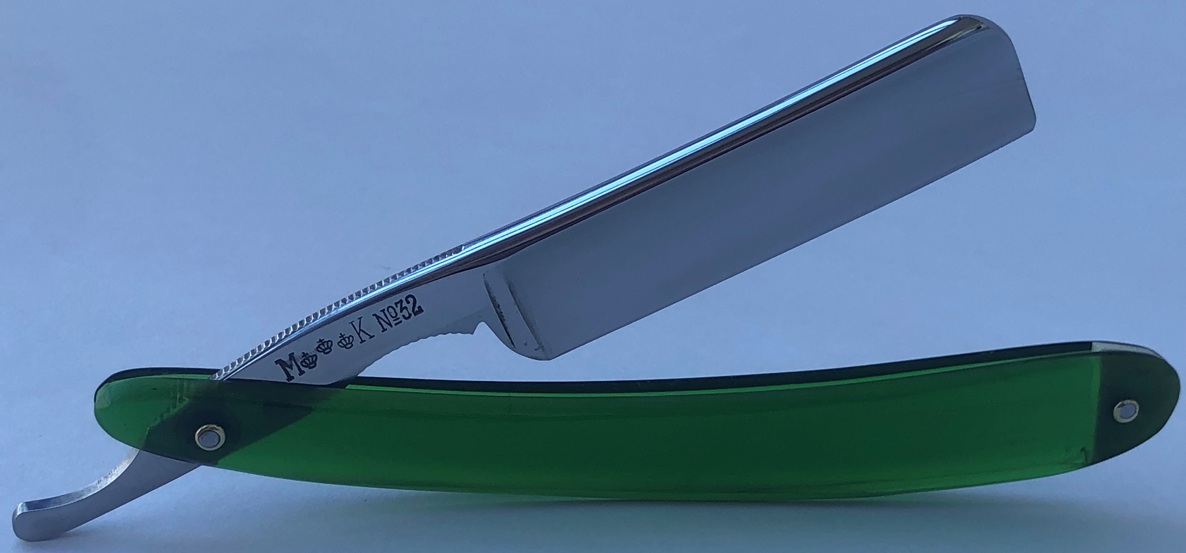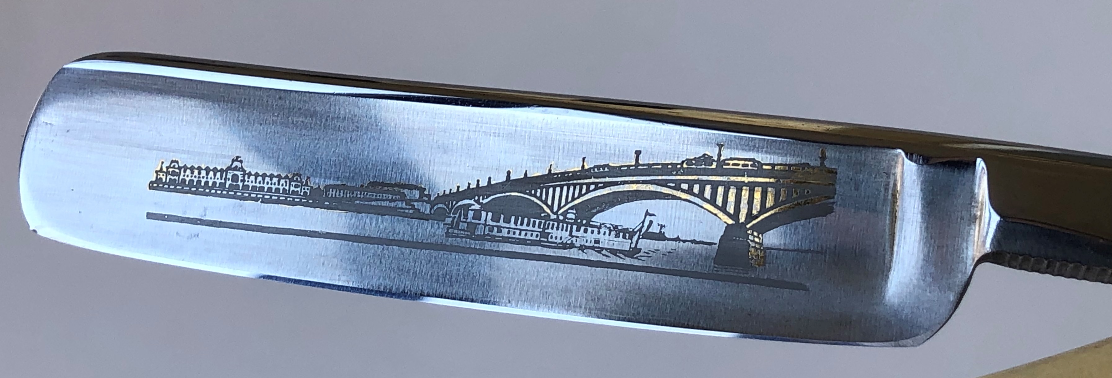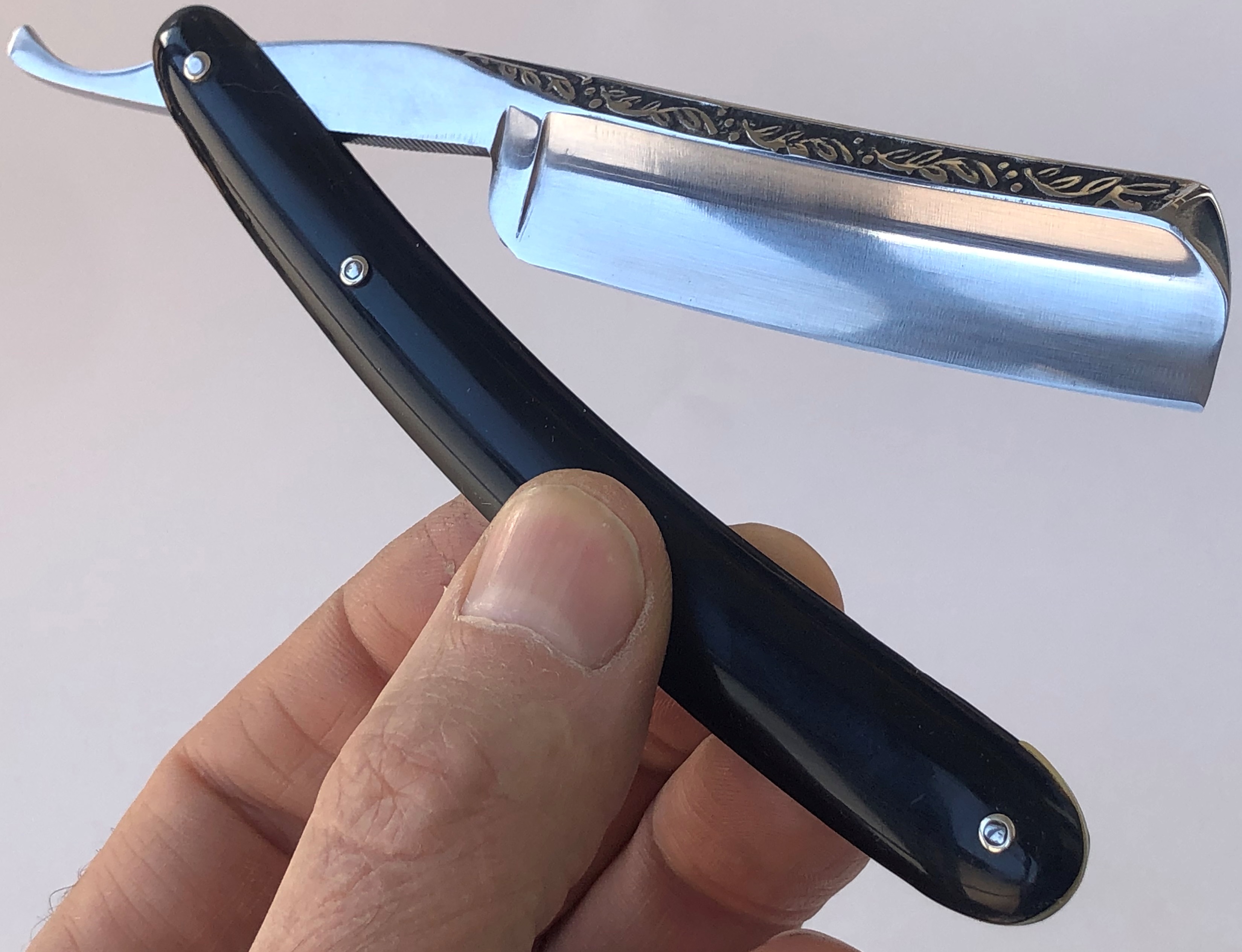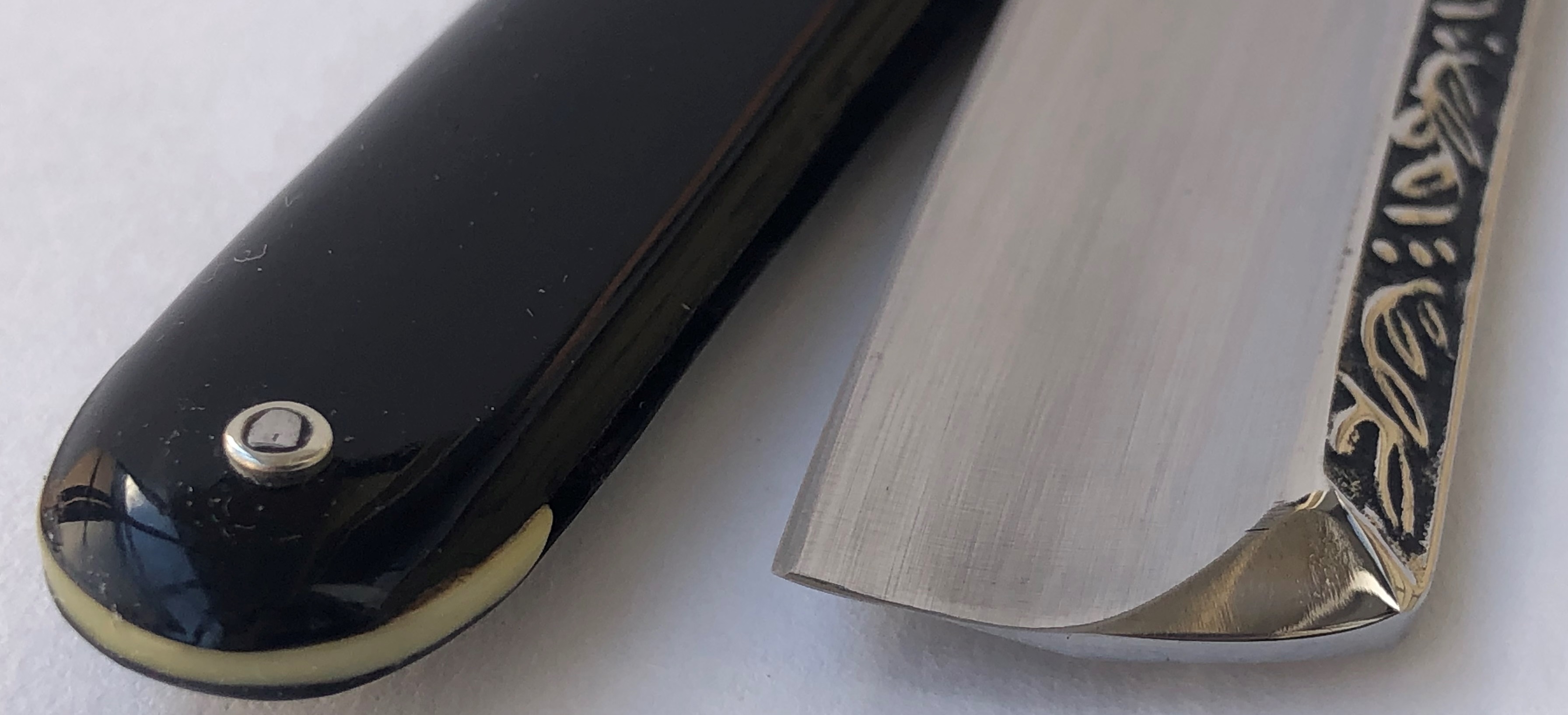 Бритва в очень хорошем малопользованном состоянии. Родная шлифовка полотна.Была разобрана,для косметических,минимальных работ.Удалось сохранить оригинальные пины и поставить заново.Добавил внутренние шайбы.Кромка равномерна по всей длине.Красивая гравировка.Удачная форма лезвия для новичка, а также пойдет и для опытного пользователя.Заточена и готова к бритью.