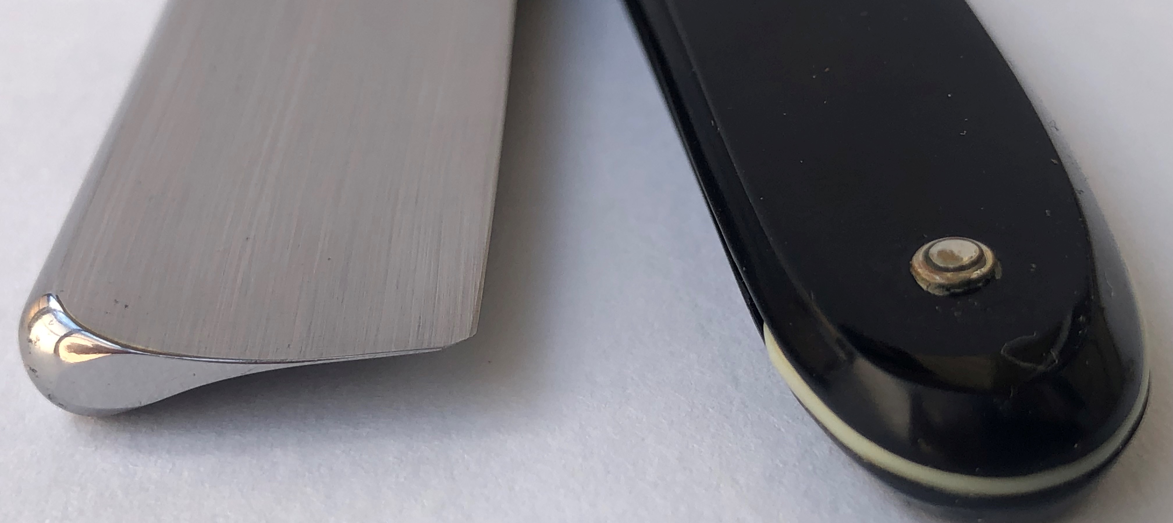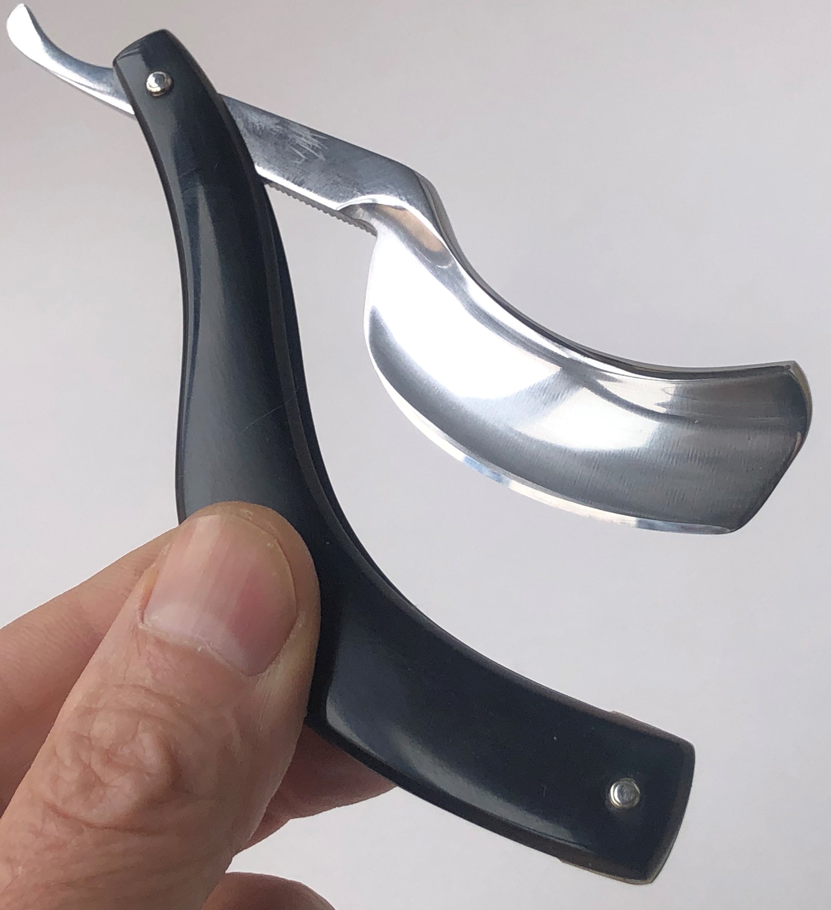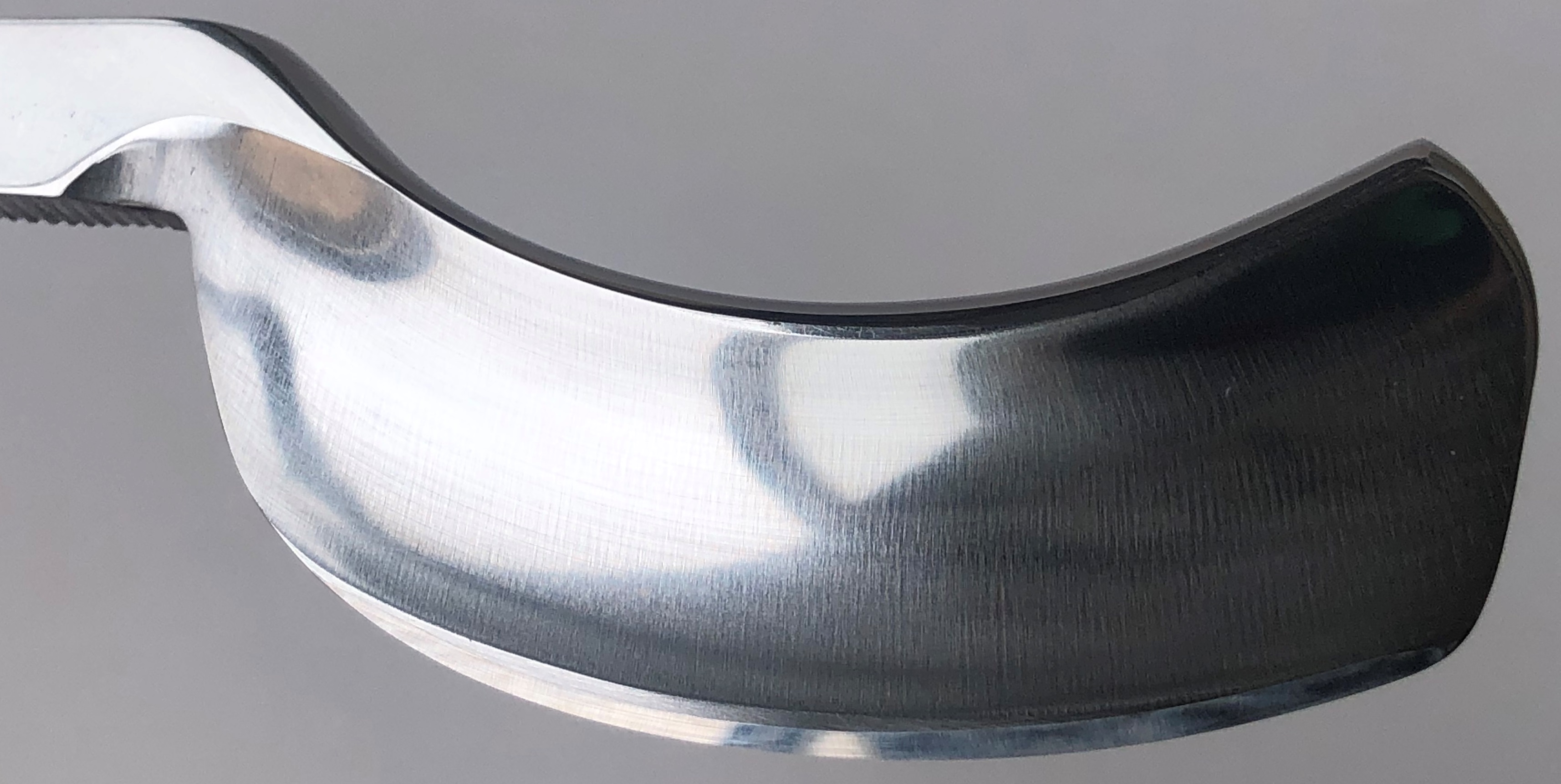 Вес этой бритвы смещен в сторону лезвия, а режущая кромка имеет более геометрическую форму с острыми углами.