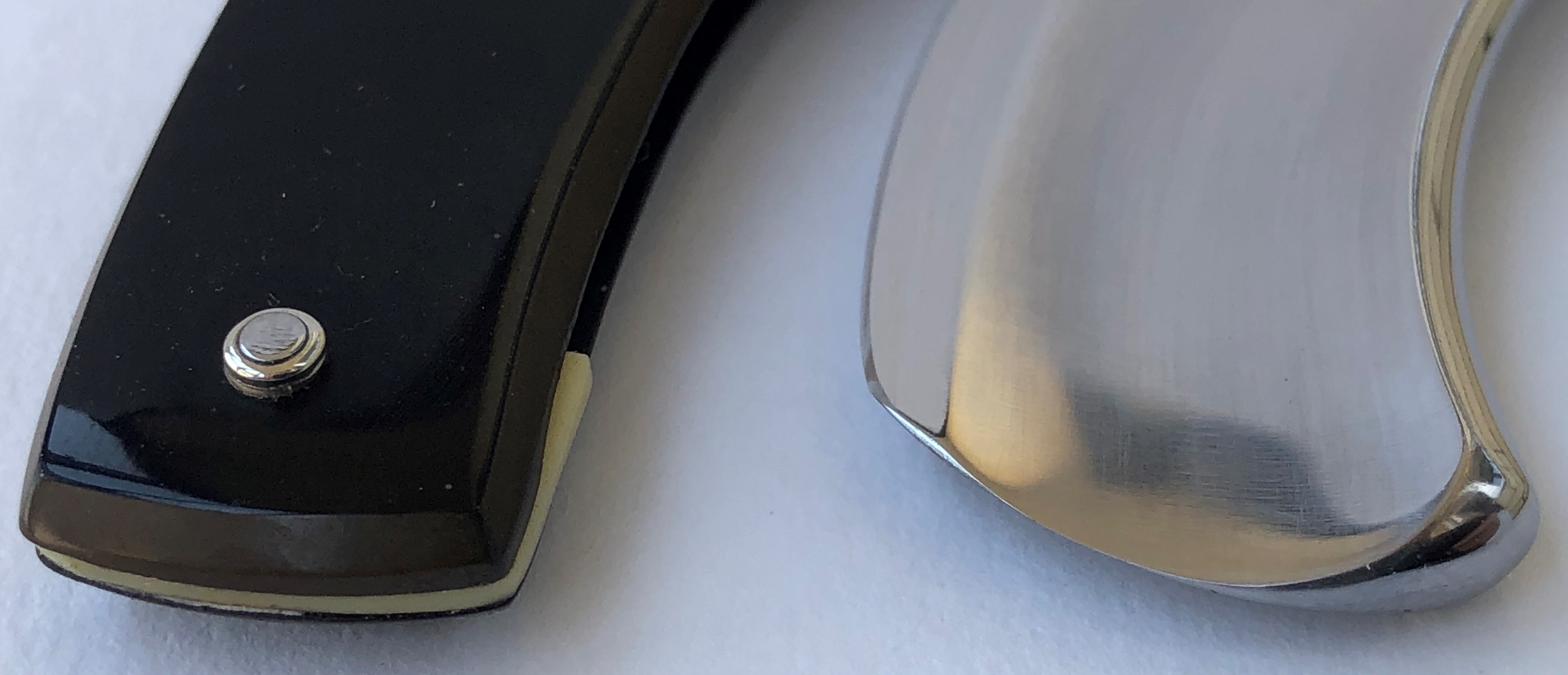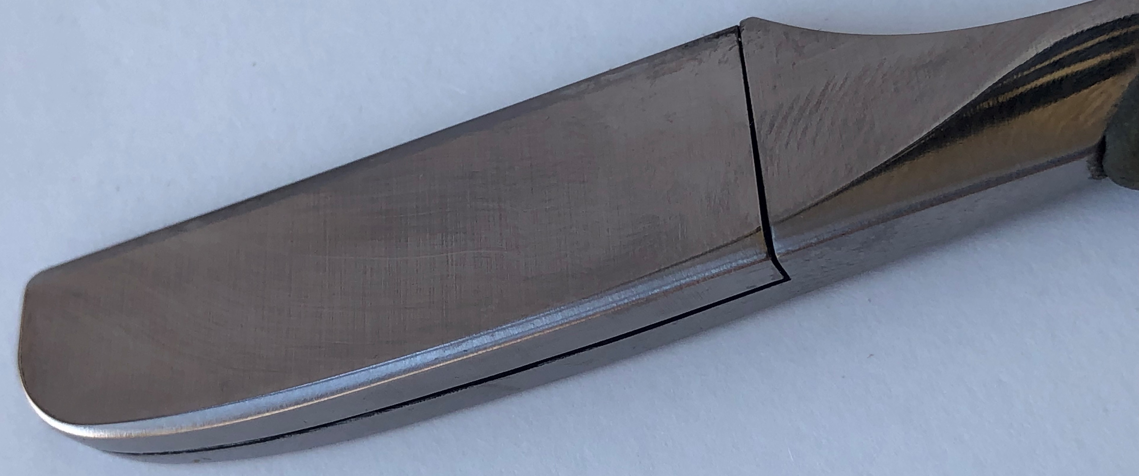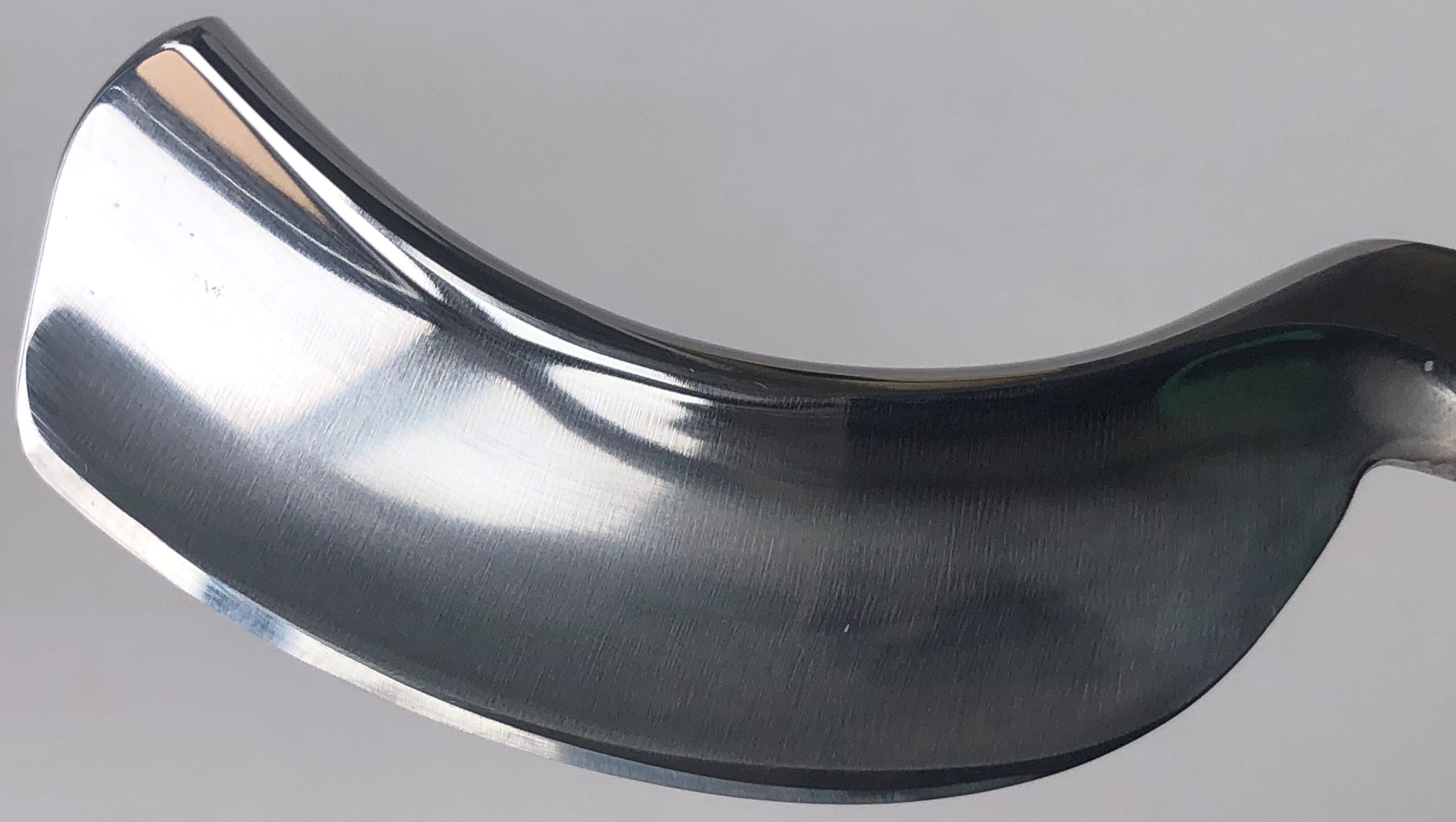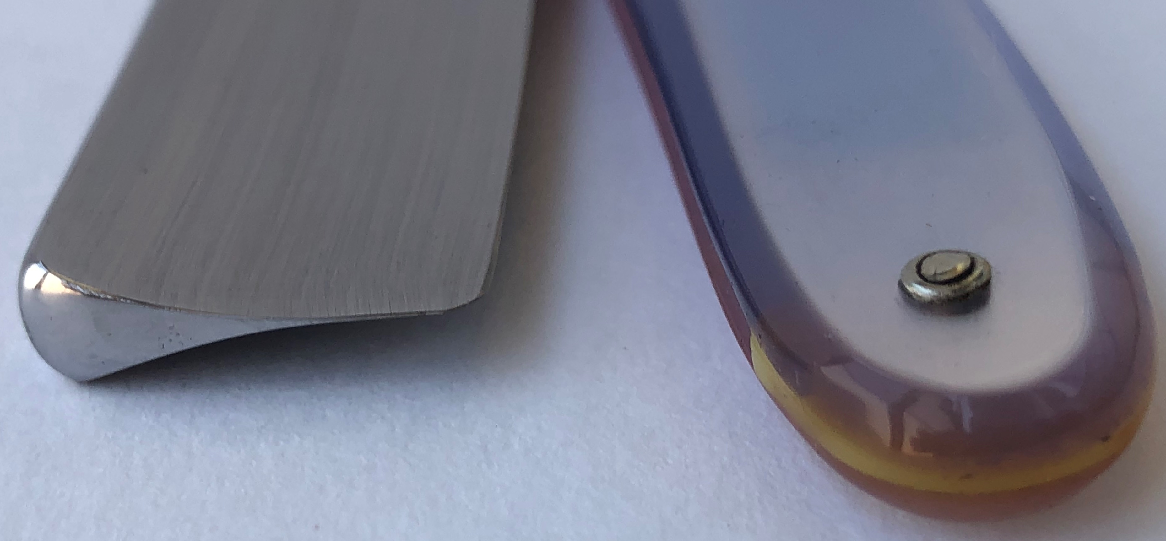 Вес этой бритвы смещен в сторону лезвия, а режущая кромка имеет более геометрическую форму с острыми углами.
