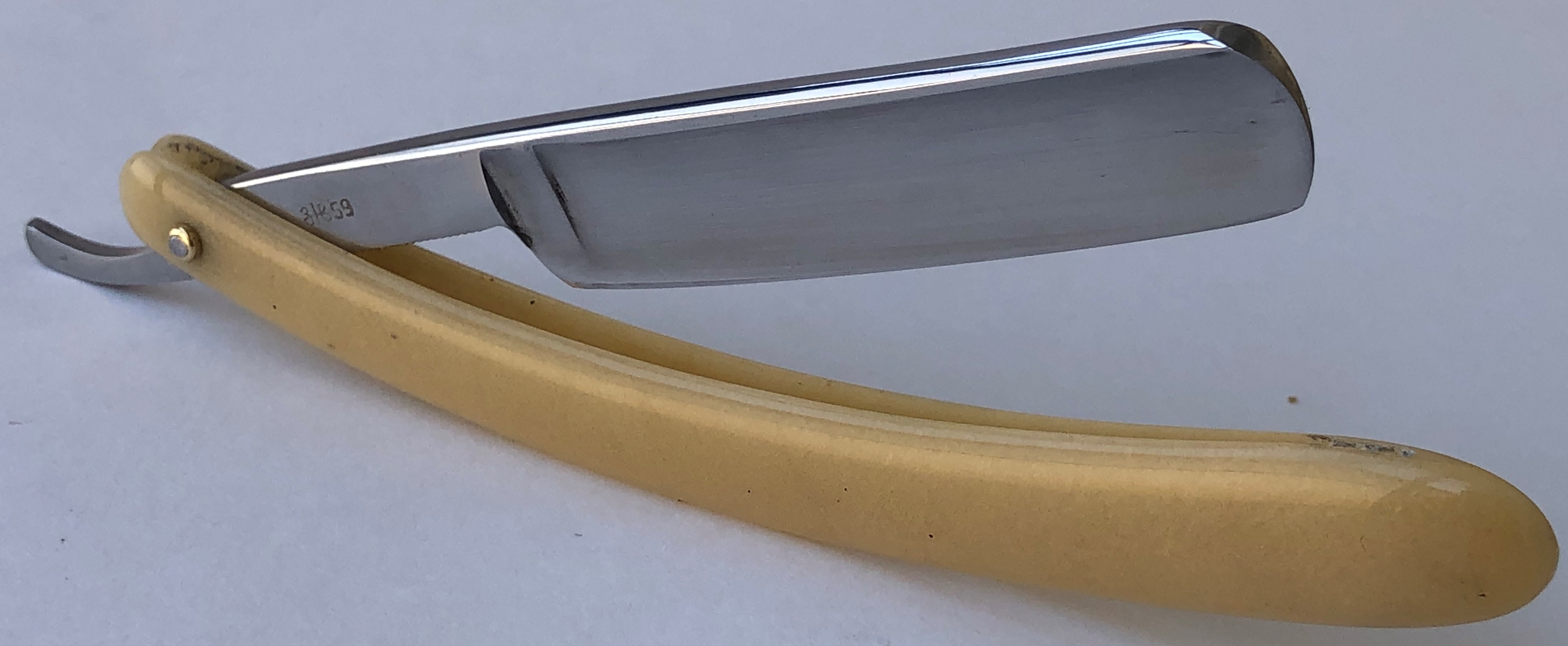 Бритва в очень хорошем пользованном состоянии.Родная шлифовка и полировка полотна.Была разобрана,для удаления следов окисления в районе осевого пина, а также для установления внутренних шайб.Клинок точился аккуратно, без износа обушка. Кромочка равномерна по всей длине. Эффектная , родная, пластиковая оправа "под кость".Оригинальная коробочка также 1959 года, что очень хорошо.Очень хороший и совершенно недорогой вариант для новичка, а также для любого пользователя. Заточена и готова к бритью.