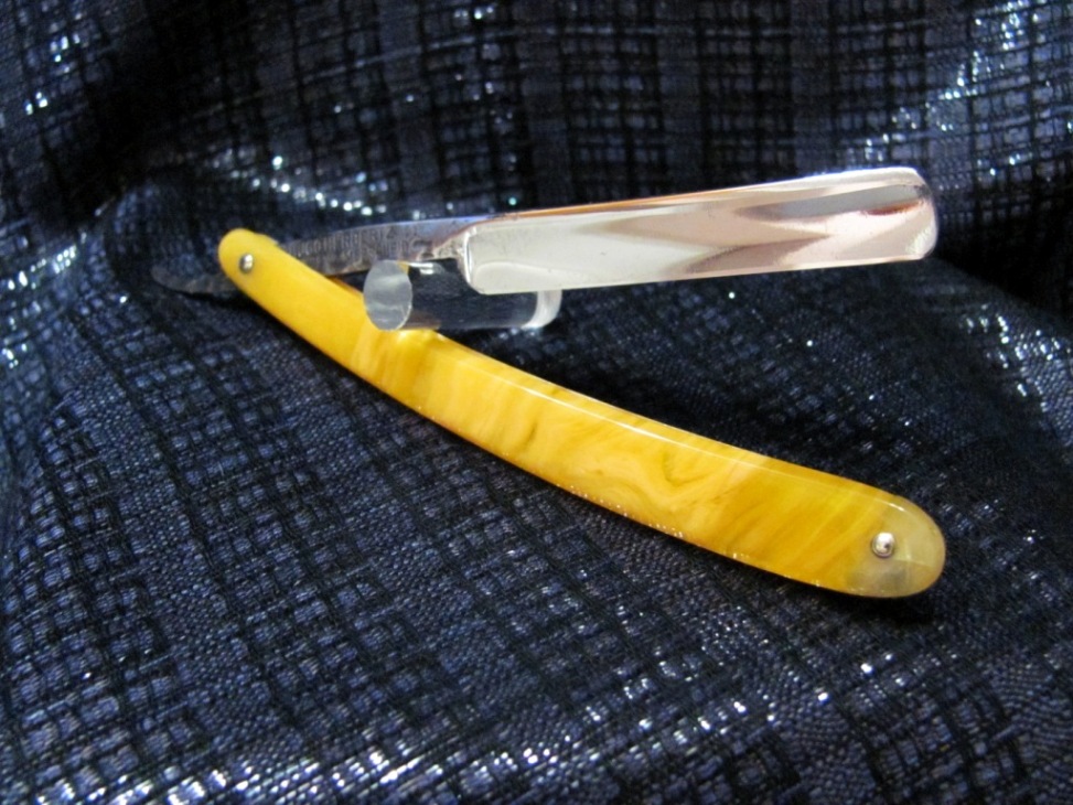 Параметры: Ширина 12мм, обух 3 мм, длина РК 63 мм Ручка: целлулоид, имитация под янтарь Особенности: эрль и хвостик бритвы кованные. Бритва реставрирована, заточена не естесcтвенно а целенаправленно, на японских водниках. ПРОДАНО Постоянным покупателям предусмотрена скидка Bockla Show