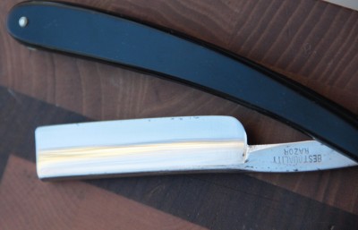 Бритва не разбиралась и не ремонтировалась. Износ обушка минимальный. Бритва тяжёлая. Ручка-пластик. Сталь чистая, за исключением нескольких точек коррозии рядом с кромкой.