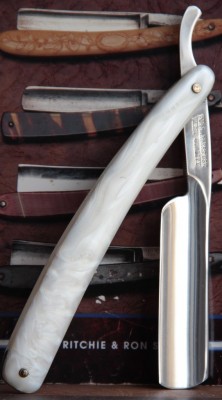 Тяжёлая бритва, в красивой перламутровой оправе.Ничего не разбиралось. Всё родное. Полотно в хорошем состоянии. Кромка чистая. Идеальная геометрия изготовления. Шикарно бреет. Проверено. Мягкое, чистое бритьё. Смело можно рекомендовать такую бритву в качестве первой для новичка.