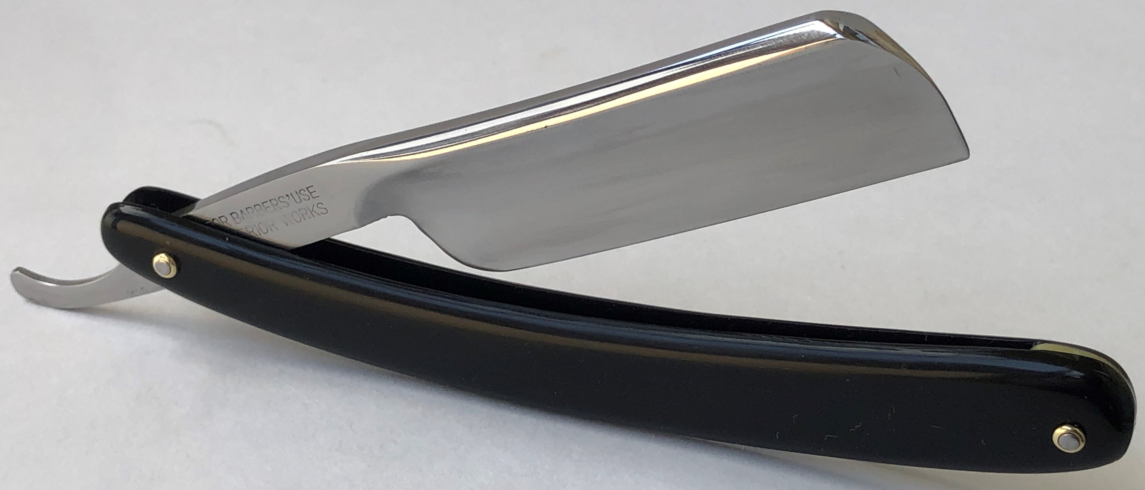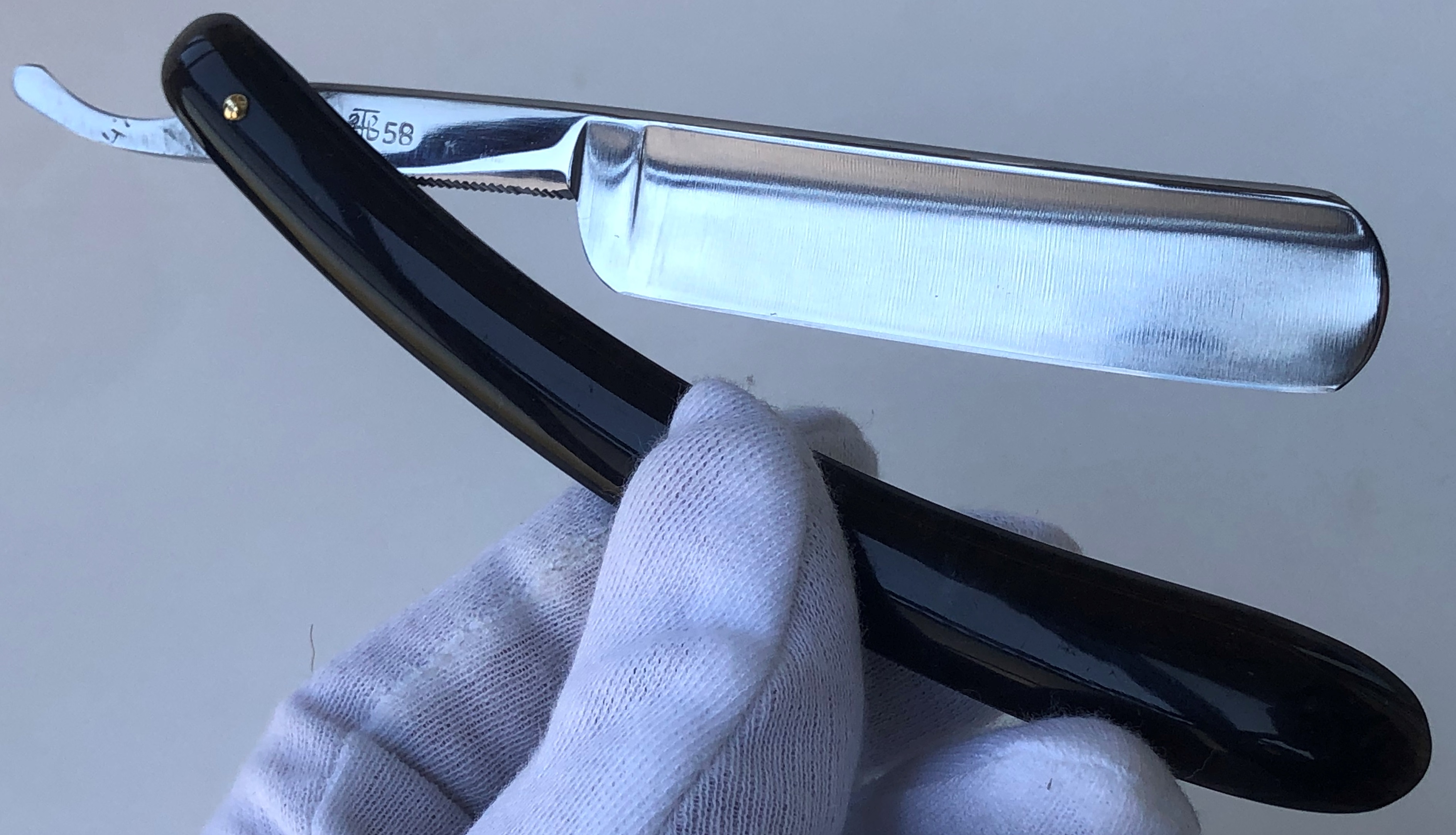 Бритвы данного бренда были как полноразмерные, так и укороченные.Тут имеет место быть как раз укороченная тяжёлая,парикмахерская бритва.Состояние близко к идеальному. Родная шлифовка клинка! Бритва была перебрана, для удаления "следов времени" в районе осевого механизма.Родные пины были заменены на более эффективные двух-цветные втулки , а также добавлены внутренние шайбы.Умеренная полировка.Идеальная геометрия клинка:кромочка равномерна по всей длине и еле заметна.Оригинальная форма клинка для более удобного хвата при бритье, а укороченная РК также прекрасно работает с проблемными и менее доступными участками лица. Серьёзная, с отличной сталью, парикмахерская бритва. Не пропустите!