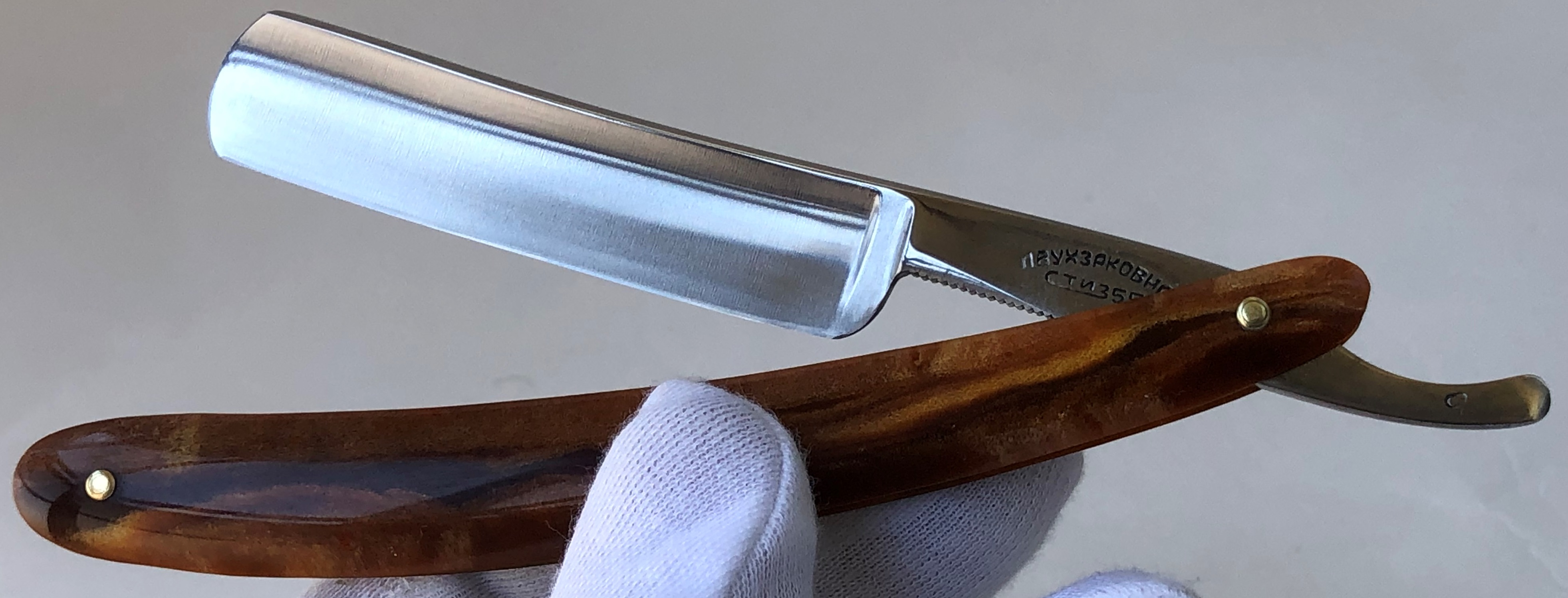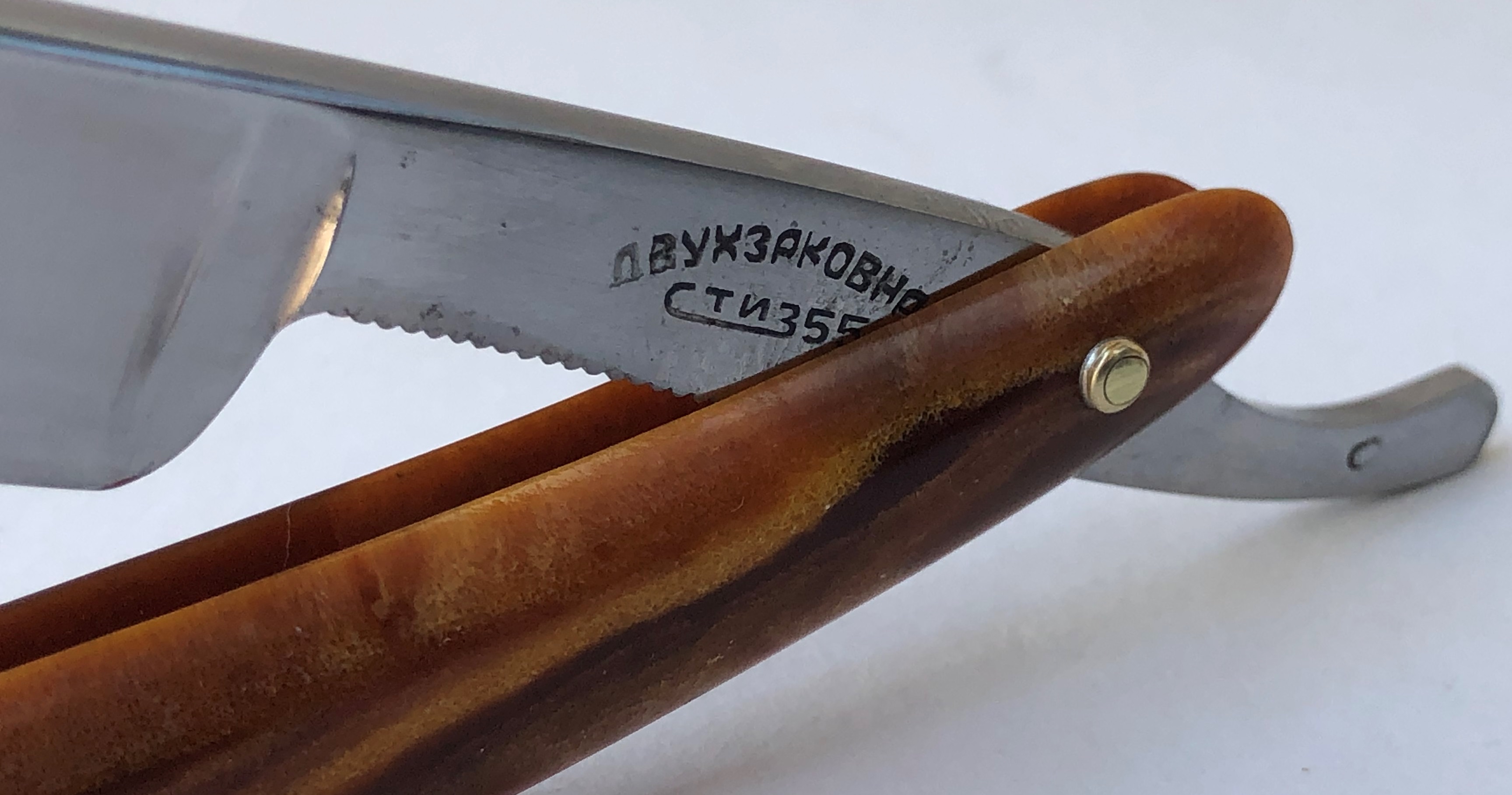 Бритва следов пользования не имеет. Присутствовал скол на лезвии, который был благополучно удален, и заново была сформирована кромка. Предварительно бритва была разобрана,для устранения следов окисления.Никакого регринда, а только умеренная шлифовка и полировка.Новые втулки и внутренние шайбы, для надёжности.Кромка ровная по всей длине.Лицевая сторона полностью в оригинале. Редкое позолоченное травление четкое, без потертостей. Бритва продается по остаточной стоимости, так что не пропустите.